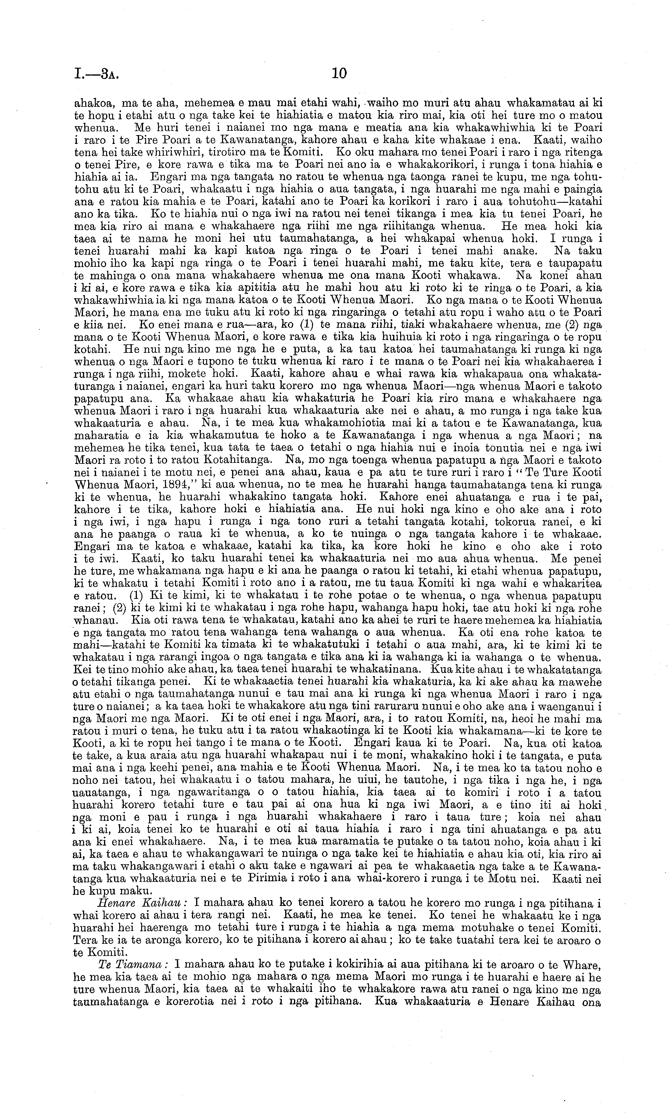 ahakoa, ma te aha, mehemea c mau mai etahi wahi, waiho mo muri atu ahau whakamatau ai ki te hopu i etahi atu o nga take kei te hiahiatia c matou kia riro mai, kia oti hei ture mo o matou whenua. Me huri tenoi i naianei mo nga mana c meatia ana kia whakawhiwhia kite Poari i raro ite Pire Poari ate Kawanatanga, kahore ahau c kaha kite whakaae i ena. Kaati, waiho tena hei take whiriwhiri, tirotiro ma te Komiti. Ko oku mahara mo tenei Poari i raro i nga ritenga 0 tenei Pire, c kore rawa c tika ma te Poari nei ano ia c whakakorikori, i runga i tona hiahia c hiahia ai ia. Engari ma nga tangata no ratou te whenua nga taonga ranei te kupu, me nga tohutohu atu kite Poari, whakaatu i nga hiahia o aua tangata, i nga huarahi me nga mahi c paingia ana c ratou kia mahia c te Poari, katahi ano te Poari ka korikori i raro i aua tohutohu—katahi ano ka tika. Ko te hiahia nui o nga iwi na ratou nei tenei tikanga i mea kia tv tenei Poari, he mea kia riro ai mana c whakahaere nga riihi me nga riihitanga whenua. He mea hoki kia taea ai te nama he moni hei utu taumahatanga, a hei whakapai whenua hoki. I runga i tenei huarahi mahi ka kapi katoa nga ringa o te Poari i tenei mahi anake. Na taku mohio iho ka kapi nga ringa o te Poari i tenei huarahi mahi, me taku kite, tera c taupapatu te mahinga o ona mana whakahaere whenua me ona mana Kooti whakawa. Na konei ahau Iki ai, c kore rawa c tika kia apititia atu he mahi hou atu ki roto kite ringa ote Poari, a kia whakawhiwhia ia ki nga mana katoa ote Kooti Whenua Maori. Ko nga mana ote Kooti Whenua Maori, he mana ena me tuku atu ki roto ki nga ringaringa o tetahi atu ropu i waho atu o te Poari c kiia nei. Ko enei mana c rua —ara, ko (1) te mana riihi, tiaki whakahaere whenua, me (2) nga mana o te Kooti Whenua Maori, c kore rawa c tika kia huihuia ki roto i nga ringaringa o te ropu kotahi. He nui nga kino me nga he c puta, a ka tau katoa hei taumahatanga ki runga ki nga whenua o nga Maori c tupono te tuku whenua ki raro i te mana o te Poari nei kia whakahaerea i runga i nga riihi, mokete hoki. Kaati, kahore ahau c whai rawa kia whakapaua ona whakataturanga i naianei, engari ka huri taku korero mo nga whenua Maori—nga whenua Maori c takoto papatupu ana. Ka whakaae ahau kia whakaturia he Poari kia riro mana c whakahaere nga whenua Maori i raro i nga huarahi kua whakaaturia ake nei c ahau, a mo runga i nga take kua whakaaturia c ahau. Na, i te mea kua whakamohiotia mai ki a tatou c te Kawanatanga, kua maharatia c ia kia whakamutua te hoko ate Kawanatanga i nga whenua a nga Maori; na mehemea he tika tenei, kua tata te taea o tetahi o nga hiahia nui c inoia tonutia nei c nga iwi Maori ra roto ito ratou Kotahitanga. Na, mo nga toenga whenua papatupu a nga Maori c takoto nei i naianei i te motu nei, c penei ana ahau, kaua c pa atu te ture ruri i raro i " Te Ture Kooti Whenua Maori, 1894," ki aua whenua, no te mea he huarahi hanga taumahatanga tena ki runga kite whenua, he huarahi whakakino tangata hoki. Kahore enei ahuatanga c rua ite pai, kahore i te tika, kahore hoki c hiahiatia ana. He nui hoki nga kino c oho ake ana i roto i nga iwi, i nga hapu i runga i nga tono ruri a tetahi tangata kotahi, tokorua ranei, c ki ana he paanga o raua kite whenua, a ko te nuinga o nga tangata kahore i te whakaae. Engari ma te katoa c whakaae, katahi ka tika, ka kore hoki he kino c oho ake i roto i te iwi. Kaati, ko taku huarahi tenei ka whakaaturia nei mo aua ahua whenua. Me penei he ture, me whakamana nga hapu c ki ana he paanga o ratou ki tetahi, ki etahi whenua papatupu, kite whakatu i tetahi Komiti i roto ano i a ratou, me tv taua Komiti ki nga wahi c whakaritea c ratou. (1) Xi te kimi, kite whakatau ite rohe potae ote whenua, o nga whenua papatupu ranei; (2) kite kimi kite whakatau i nga rohe hapu, wahanga hapu hoki, tae atu hoki ki nga rohe whanau. Kia oti rawa tena te whakatau, katahi ano ka ahei te ruri te haere mehemea ka hiahiatia c nga tangata mo ratou tena wahanga tena wahanga o aua whenua. Ka oti ena rohe katoa te mahi—katahi te Komiti ka timata kite whakatutuki i tetahi o aua mahi, ara, kite kimi kite whakatau i nga rarangi ingoa o nga tangata c tika ana ki ia wahanga ki ia wahanga o te whenua. Kei te tino mohio ake ahau, ka taea tenei huarahi te whakatinana. Kua kite ahau ite whakatatanga 0 tetahi tikanga penei. Xi te whakaaetia tenei huarahi kia whakaturia, ka ki ake ahau ka mawehe atu etahi o nga taumahatanga nunui c tau mai ana ki runga ki nga whenua Maori i raro i nga ture o naianei; aka taea hoki te whakakore atu nga tini raruraru nunui c oho ake ana i waenganui i nga Maori me nga Maori. Xi te oti enei i nga Maori, ara, i to ratou Komiti, na, heoi he mahi ma ratou i muri o tena, he tuku atu ita ratou whakaotinga kite Kooti kia whakamana—ki te kore te Kooti, aki te ropu hei tango ite mana ote Kooti. Engari kaua kite Poari. Na, kua oti katoa te take, a kua araia atu nga huarahi whakapau nui i te moni, whakakino hoki i te tangata, c puta mai ana i nga keehi penei, ana mahia etc Kooti Whenua Maori. Na, ite mea ko ta tatou noho c noho nei tatou, hei whakaatu i o tatou mahara, he uiui, he tautohe, i nga tika i nga he, i nga uauatanga, i nga ngawaritanga o o tatou hiahia, kia taea ai te komiri i roto i a tatou huarahi korero tetahi ture c tau pai ai ona hua ki nga iwi Maori, a c tino iti ai hoki nga moni c pau i runga i nga huarahi whakahaere i raro i taua ture; koia nei ahau 1 ki ai, koia tenei ko te huarahi c oti ai taua hiahia i raro i nga tini ahuatanga c pa atu ana ki enei whakahaere. Na, ite mea kua maramatia te putake ota tatou noho, koia ahau iki ai, ka taea c ahau te whakangawari te nuinga o nga take kei te hiahiatia c ahau kia oti, kia riro ai ma taku whakangawari i etahi o aku take c ngawari ai pea te whakaaetia nga take a te Kawanatanga kua whakaaturia nei etc Pirimia i roto i ana whai-korero i runga ite Motu nei. Kaati nei he kupu maku. Henare Kaihau : I mahara ahau ko tenei korero a tatou he korero mo runga i nga pitihana i whai korero ai ahau i tera ran