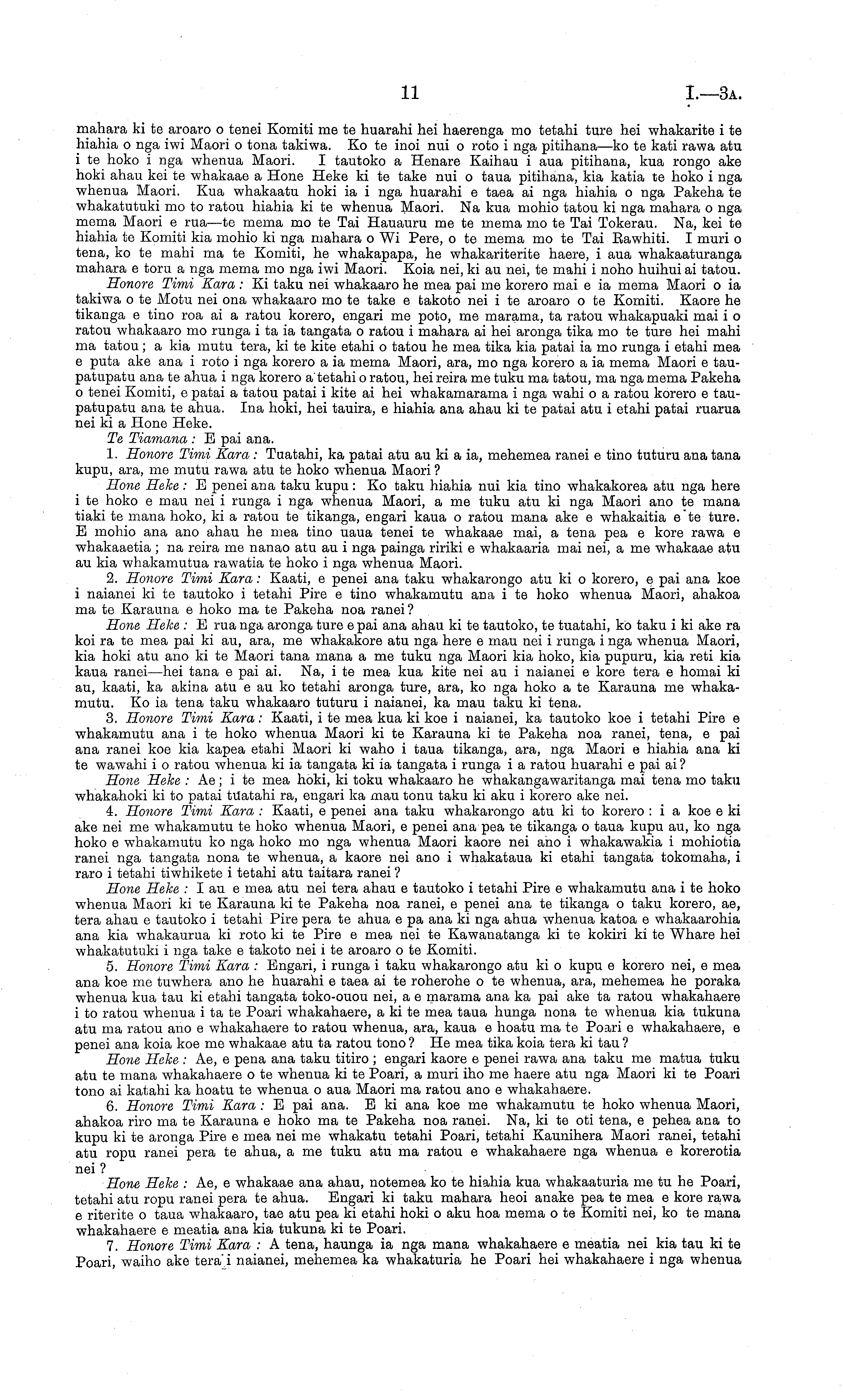 mahara kite aroaro o tenei Komiti me te huarahi hei haerenga mo tetahi ture hei whakarite ite hiahia o nga iwi Maori o tona takiwa. Ko te inoi nui o roto i nga pitihana—ko te kati rawa atu ite hoko i nga whenua Maori. I tautoko a Henare Kaihau i aua pitihana, kua rongo ake hoki ahau kei te whakaae a Hone Heke kite take nui o taua pitihana, kia katia te hoko i nga whenua Maori. Kua whakaatu hoki ia i nga huarahi c taea ai nga hiahia o nga Pakeha te whakatutuki mo to ratou hiahia kite whenua Maori. Na kua rnohio tatou ki nga mahara o nga mema Maori c rua—te mema mo te Tai Hauauru me te mema mo te Tai Tokerau. Na, kei te hiahia te Komiti kia mohio ki nga mahara oWi Pere, o te mema mo te Tai Eawhiti. I muri o tena, ko te mahi ma te Komiti, he whakapapa, he whakariterite haere, i aua whakaaturanga mahara c toru a nga mema mo nga iwi Maori. Koia nei, ki au nei, te mahi i noho huihui ai tatou. Honore Timi Kara : Xi taku nei whakaaro he mea pai me korero mai c ia mema Maori o ia takiwa ote Motu nei ona whakaaro mo te take c takoto nei i te aroaro o te Komiti. Kaore he tikanga c tino roa ai a ratou korero, engari me poto, me marama, ta ratou whakapuaki mai i o ratou whakaaro mo runga i ta ia tangata o ratou i mahara ai hei aronga tika mo te ture hei mahi ma tatou; a kia mutu tera, kite kite etahi o tatou he mea tika kia patai ia mo runga i etahi mea c puta ake ana i roto i nga korero a ia mema Maori, ara, mo nga korero a ia mema Maori c taupatupatu ana te ahua i nga korero a tetahi o ratou, hei reira me tuku ma tatou, ma nga mema Pakeha 0 tenei Komiti, c patai a tatou patai i kite ai hei whakamarama i nga wahi o a ratou korero c taupatupatu ana te ahua. Ina hoki, hei tauira, c hiahia ana ahau kite patai atu i etahi patai ruarua nei ki a Hone Heke. Te Tiamana : E pai ana. 1. Honore Timi Kara : Tuatahi, ka patai atu au ki a ia, mehemea ranei c tino tuturu ana tana kupu, ara, me mutu rawa atu te hoko whenua Maori ? Hone Heke : E penei ana taku kupu : Ko taku hiahia nui kia tino whakakorea atu nga here 1 te hoko c mau nei i runga i nga whenua Maori, a me tuku atu ki nga Maori ano te mana tiaki te mana hoko, ki a ratou te tikanga, engari kaua o ratou mana ake c whakaitia c te ture. E mohio ana ano ahau he mea tino uaua tenei te whakaae mai, a tena pea c kore rawa c whakaaetia ; na reira me nanao atu au i nga painga ririki c whakaaria mai nei, a me whakaae atu au kia whakamutua rawatia te hoko i nga whenua Maori. 2. Honore Timi Kara: Kaati, c penei ana taku whakarongo atu ki o korero, c pai ana koe i naianei kite tautoko i tetahi Pire c tino whakamutu ana i te hoko whenua Maori, ahakoa ma te Karauna c hoko ma te Pakeha noa ranei? Hone Heke : E rua nga aronga ture c pai ana ahau kite tautoko, te tuatahi, kb taku iki ake ra koi rate mea pai ki au, ara, me whakakore atu nga here c mau nei i runga i nga whenua Maori, kia hoki atu ano kite Maori tana mana ame tuku nga Maori kia hoko, kia pupuru, kia reti kia kaua ranei—hei tana c pai ai. Na, ite mea kua kite nei au i naianei c kore tera c homai ki au, kaati, ka akina atu c au ko tetahi aronga ture, ara, ko nga hoko a te Karauna me whakamutu. Ko ia tena taku whakaaro tuturu i naianei, ka mau taku ki tena. 3. Honore Timi Kara: Kaati, ite mea kua ki koe i naianei, ka tautoko koe i tetahi Pire c whakamutu ana ite hoko whenua Maori kite Karauna kite Pakeha noa ranei, tena, c pai ana ranei koe kia kapea etahi Maori ki waho i taua tikanga, ara, nga Maori c hiahia ana ki te wawahi i o ratou whenua ki ia tangata ki ia tangata i runga i a ratou huarahi c pai ai ? Hone Heke : Ac; i te mea hoki, ki toku whakaaro he whakangawaritanga mai tena mo taku whakahoki ki to patai tuatahi ra, engari ka mau tonu taku ki aku i korero ake nei. 4. Honore Timi Kara : Kaati, c penei ana taku whakarongo atu ki to korero : i a koe c ki ake nei me whakamutu te hoko whenua Maori, c penei ana pea te tikanga o taua kupu au, ko nga hoko c whakamutu ko nga hoko mo nga whenua Maori kaore nei ano i whakawakia i mohiotia ranei nga tangata nona te whenua, a kaore nei ano i whakataua ki etahi tangata tokomaha, i raro i tetahi tiwhikete i tetahi atu taitara ranei ? Hone Heke : I au c mea atu nei tera ahau c tautoko i tetahi Pire c whakamutu ana i te hoko whenua Maori kite Karauna kite Pakeha noa ranei, c penei ana te tikanga o taku korero, ac, tera ahau c tautoko i tetahi Pire pera te ahua c pa ana ki nga ahua whenua katoa c whakaarohia ana kia whakaurua ki roto kite Pire c mea nei te Kawanatanga kite kokiri kite Whare hei whakatutuki i nga take c takoto nei i te aroaro o te Komiti. 5. Honore Timi Kara : Engari, i runga i taku whakarongo atu ki o kupu c korero nei, c mea ana koe me tuwhera ano he huarahi c taea ai te roherohe o te whenua, ara, mehemea he poraka whenua kua tau ki etahi tangata toko-ouou nei, a c marama ana ka pai ake ta ratou whakahaere ito ratou whenua ita te Poari whakahaere, a kite mea taua hunga nona te whenua kia tukuna atu ma ratou ano c whakahaere to ratou whenua, ara, kaua c hoatu ma te Poari c whakahaere, c penei ana koia koe me whakaae atu ta ratou tono ? He mea tika koia tera ki tau ? Hone Heke : Ac, c pena ana taku titiro ; engari kaore c penei rawa ana taku me matua tuku atu te mana whakahaere ote whenua kite Poari, a muri iho me haere atu nga Maori kite Poari tono ai katahi ka hoatu te whenua o aua Maori ma ratou ano c whakahaere. 6. Honore Timi Kara : E pai ana. E ki ana koe me whakamutu te hoko whenua Maori, ahakoa riro ma te Karauna c hoko ma te Pakeha noa ranei. Na, kite oti tena, c pehea ana to kupu kite aronga Pire c mea nei me whakatu tetahi Poari, tetahi Kaunihera Maori ranei, tetahi atu ropu ranei pera te ahua, a me tuku atu ma ratou c whakahaere nga whenua c korerotia nei ? Hone Heke : Ac, c whakaae ana ahau, notemea ko te hiahia kua whakaaturia me tv he Poari, tetahi atu ropu ranei pera te ahua. Engari ki taku mahara heoi anake pea te mea c kore rawa c riterite o taua whakaaro, tae atu pea ki etahi hoki o aku hoa mema o te Komiti nei, ko te mana whakah