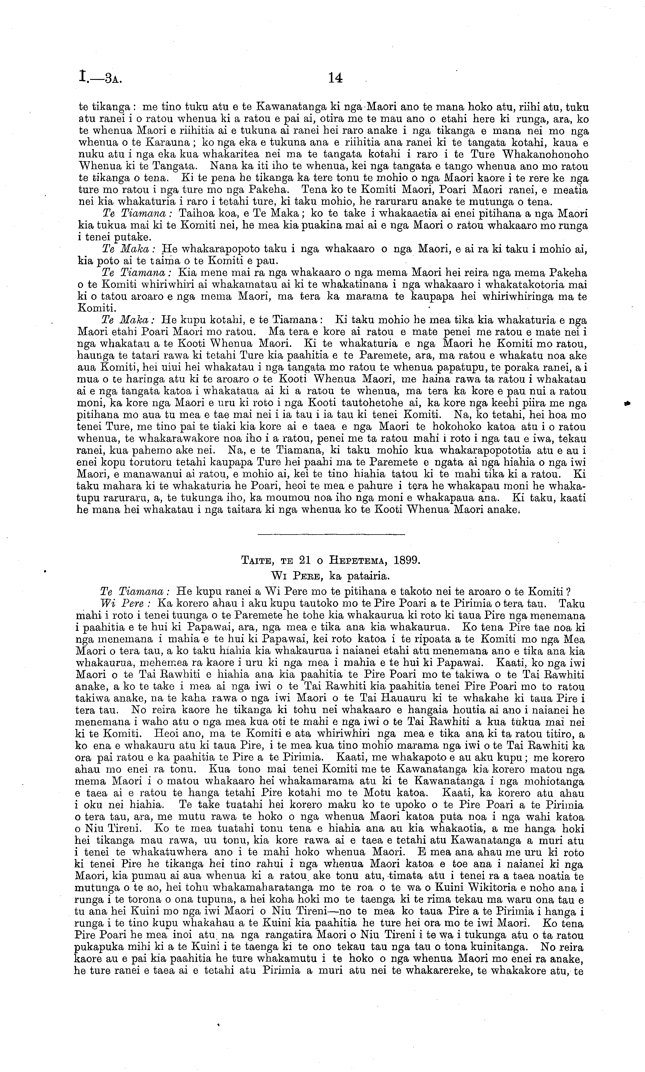 Taitb, tb 21 o Hepetema, 1899. Wi Peee, ka patairia. Te Tiamana: He kupu ranei aWi Pere mo te pitihana c takoto nei te aroaro ote Komiti ? Wi Pere : Ka korero ahau i aku kupu tautoko mo te Pire Poari ate Pirimia o tera tau. Taku mahi- i roto i tenei tuunga o te Paremete he tohe kia whakaurua ki roto ki taua Pire nga menemana i paahitia etc hui ki Papawai, ara, nga mea c tika ana kia whakaurua. Ko tena Pire tae noa ki nga menemana i mania c te hui ki Papawai, kei roto katoa i te ripoata a te Komiti mo nga Mea Maori o tera tau, a ko taku hiahia kia whakaurua i naianei etahi atu menemana ano c tika ana kia whakaurua, mehemea ra kaore i uru ki nga mea i mahia etc hui ki Papawai. Kaati, ko nga iwi Maori o te Tai Rawhiti c hiahia ana kia paahitia te Pire Poari mo te takiwa o te Tai Eawhiti anake, a ko te take i mea ai nga iwi o te Tai Rawhiti kia paahitia tenei Pire Poari mo to ratou takiwa anake, na te kaha rawa o nga iwi Maori o te Tai Hauauru kite whakahe ki taua Pire i tera tau. No reira kaore he tikanga ki tohu nei whakaaro c hangaia houtia ai ano i naianei he menemana i waho atu o nga mea kua oti te mahi c nga iwi o te Tai Eawhiti a kua tukua mai nei kite Komiti. Heoi ano, ma te Komiti c ata whiriwhiri nga mea c tika ana ki ta ratou titiro, a ko ena c whakauru atu ki taua Pire, i te mea kua tino mohio marama nga iwi o te Tai Rawhiti ka ora pai ratou eka paahitia te Pire a te Pirimia. Kaati, me whakapoto eau aku kupu; me korero ahau mo enei ra tonu. Kua tono mai tenei Komiti me te Kawanatanga kia korero matou nga mema Maori i o matou whakaaro hei whakamarama atu kite Kawanatanga i nga mohiotanga c taea ai c ratou te hanga tetahi Pire kotahi mo te Motu katoa. Kaati, ka korero atu ahau i oku nei hiahia. Te take tuatahi hei korero maku ko te upoko ote Pire Poari ate Pirimia o tera tau, ara, me mutu rawa te hoko o nga whenua Maori katoa puta noa i nga wahi katoa 0 Niu Tireni. Ko te mea tuatahi tonu tena c hiahia ana au kia whakaotia, a me hanga hoki hei tikanga mau rawa, uu tonu, kia kore rawa ai c taea c tetahi atu Kawanatanga a muri atu 1 tenei te whakatuwhera ano i te mahi hoko whenua Maori. E mea ana ahau me uru ki roto ki tenei Pire he tikanga hei tino rahui i nga whenua Maori katoa c toe ana i naianei ki nga Maori, kia pumau ai aua whenua ki a ratou ake tonu atu, timata atu i tenei ra a taea noatia te mutunga o te ao, hei tohu whakamaharatanga mo te roa o te wa o Kuini Wikitoria c noho ana i runga ite torona o ona tupuna, a hei koha hoki mo te taenga kite rima tekau ma waru ona tau c tv ana hei Kuini mo nga iwi Maori o Niu Tireni —no te mea ko taua Pire a te Pirimia i hanga i runga ite tino kupu whakahau ate Kuini kia paahitia he ture hei ora mo te iwi Maori. Ko tena Pire Poari he mea inoi atu na nga rangatira Maori o Niu Tireni i te wa i tukunga atu o ta ratou pukapuka mihi ki ate Kuini ite taenga kite ono tekau tau nga tau o tona kuinitanga. No reira kaore au c pai kia paahitia he ture whakamutu i te hoko o nga whenua Maori mo enei ra anake, he ture ranei c taea ai c tetahi atu Pirimia a muri atu nei te whakarereke, te whakakore atu, te