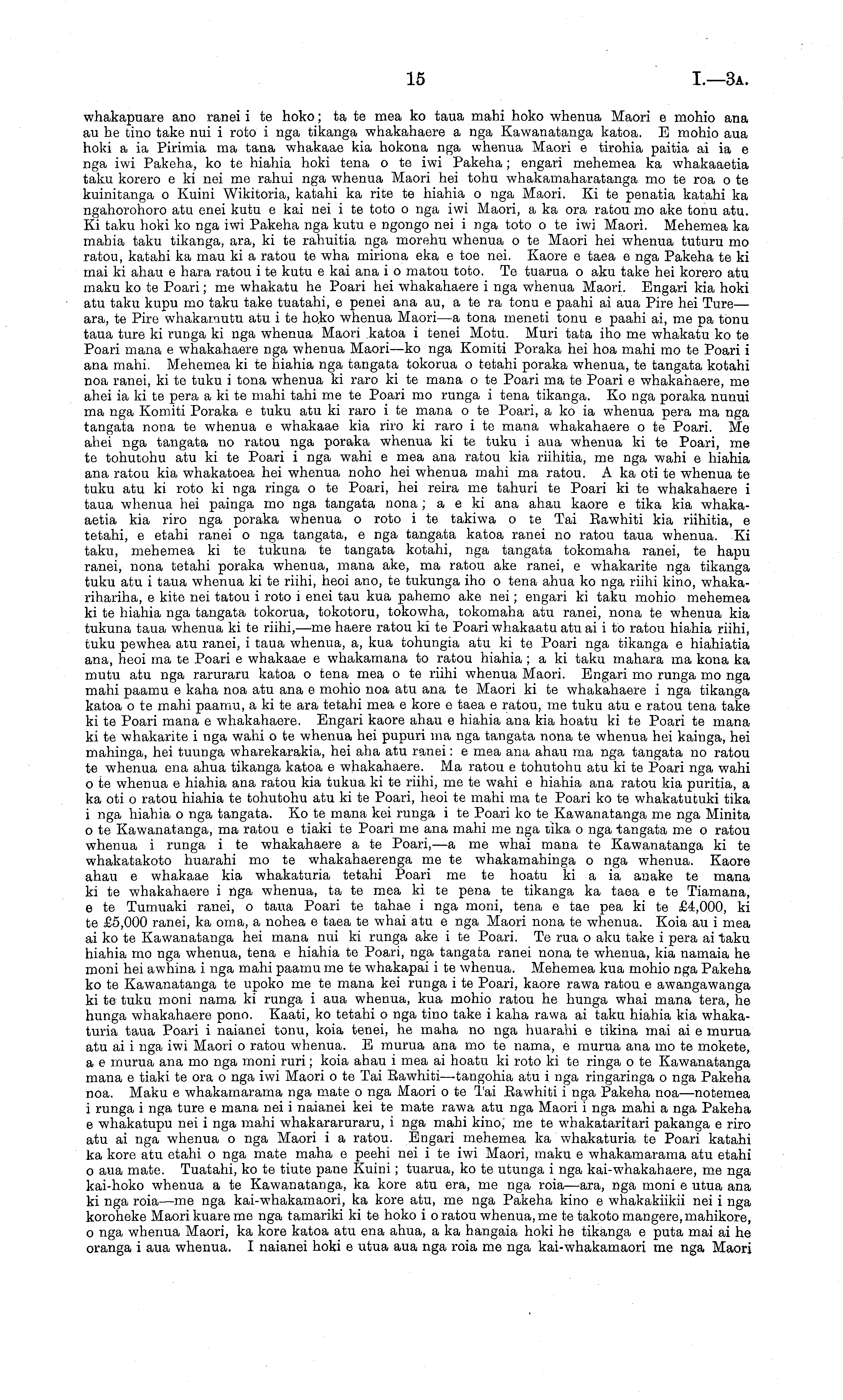 whakapuare ano ranei i te hoko; ta te mea ko taua mahi hoko whenua Maori c mohio ana au he tino take nui i roto i nga tikanga whakahaere a nga Kawanatanga katoa. E mohio aua hoki a ia Pirimia ma tana whakaae kia hokona nga whenua Maori c tirohia paitia ai ia c nga iwi Pakeha, ko te hiahia hoki tena o te iwi Pakeha; engari mehemea ka whakaaetia taku korero c ki nei me rahui nga whenua Maori hei tohu whakamaharatanga mo te roa o te kuinitanga o Kuini Wikitoria, katahi ka rite te hiahia o nga Maori. Xi te penatia katahi ka ngahorohoro atu enei kutu c kai nei i te toto o nga iwi Maori, a ka ora ratou mo ake tonu atu. Xi taku hoki ko nga iwi Pakeha nga kutu c ngongo nei i nga toto ote iwi Maori. Mehemea ka mahia taku tikanga, ara, kite rahuitia nga morehu whenua ote Maori hei whenua tuturu mo ratou, katahi ka mau ki a ratou te wha miriona eka c toe nei. Kaore c taea c nga Pakeha te ki mai ki ahau c hara ratou ite kutu c kai ana i o matou toto. Te tuarua o aku take hei korero atu maku ko te Poari; me whakatu he Poari hei whakahaere i nga whenua Maori. Engari kia hoki atu taku kupu mo taku take tuatahi, c penei ana au, a te ra tonu c paahi ai aua Pire hei Ture— ara, te Pire whakamutu atu ite hoko whenua Maori—a tona meneti tonu c paahi ai, me pa tonu taua ture ki runga ki nga whenua Maori katoa i tenei Motu. Muri tata iho me whakatu ko te Poari mana c whakahaere nga whenua Maori—ko nga Komiti Poraka hei hoa mahi mo te Poari i ana mahi. Mehemea kite hiahia nga tangata tokorua o tetahi poraka whenua, te tangata kotahi noa ranei, kite tuku i tona whenua ki raro kite mana ote Poari ma te Poari c whakahaere, me ahei ia kite pera aki te mahi tahi me te Poari mo runga i tena tikanga. Ko nga poraka nunui ma nga Komiti Poraka c tuku atu ki raro i te mana o te Poari, a ko ia whenua pera ma nga tangata nona te whenua c whakaae kia riro ki raro i te mana whakahaere o te Poari. Me ahei nga tangata no ratou nga poraka whenua kite tuku i aua whenua kite Poari, me te tohutohu atu kite Poari i nga wahi c mea ana ratou kia riihitia, me nga wahi c hiahia ana ratou kia whakatoea hei whenua noho hei whenua mahi ma ratou. A ka oti te whenua te tuku atu ki roto ki nga ringa ote Poari, hei reira me tahuri te Poari kite whakahaere i taua whenua hei painga mo nga tangata nona; a c ki ana ahau kaore c tika kia whakaaetia kia riro nga poraka whenua o roto i te takiwa o te Tai Rawhiti kia riihitia, c tetahi, c etahi ranei o nga tangata, c nga tangata katoa ranei no ratou taua whenua. Xi taku, mehemea kite tukuna te tangata kotahi, nga tangata tokomaha ranei, te hapu ranei, nona tetahi poraka whenua, mana ake, ma ratou ake ranei, c whakarite nga tikanga tuku atu i taua whenua kite riihi, heoi ano, te tukunga iho o tena ahua ko nga riihi kino, whakarihariha, c kite nei tatou i roto i enei tau kua pahemo ake nei; engari ki taku mohio mehemea kite hiahia nga tangata tokorua, tokotoru, tokowha, tokomaha atu ranei, nona te whenua kia tukuna taua whenua kite riihi, —me haere ratou kite Poari whakaatu atu ai ito ratou hiahia riihi, tuku pewhea atu ranei, i taua whenua, a, kua tohungia atu kite Poari nga tikanga c hiahiatia ana, heoi ma te Poari c whakaae c whakamana to ratou hiahia; a ki taku mahara ma kona ka mutu atu nga raruraru katoa o tena mea o te riihi whenua Maori. Engari mo runga mo nga mahi paamu c kaha noa atu ana c mohio noa atu ana te Maori kite whakahaere i nga tikanga katoa ote mahi paamu, a kite ara tetahi mea c kore c taea c ratou, me tuku atu c ratou tena take kite Poari mana c whakahaere. Engari kaore ahau c hiahia ana kia hoatu kite Poari te mana kite whakarite i nga wahi ote whenua hei pupuri ma nga tangata nona te whenua hei kainga, hei mahinga, hei tuunga wharekarakia, hei aha atu ranei: c mea ana ahau ma nga tangata no ratou te whenua ena ahua tikanga katoa c whakahaere. Ma ratou c tohutohu atu kite Poari nga wahi ote whenua c hiahia ana ratou kia tukua kite riihi, me te wahi c hiahia ana ratou kia puritia, a ka oti o ratou hiahia te tohutohu atu kite Poari, heoi te mahi ma te Poari ko te whakatutuki tika i nga hiahia o nga tangata. Ko te mana kei runga i te Poari ko te Kawanatanga me nga Minita o te Kawanatanga, ma ratou c tiaki te Poari me ana mahi me nga tika o nga tangata me o ratou whenua i runga i te whakahaere a te Poari, —a me whai mana te Kawanatanga kite whakatakoto huarahi mo te whakahaerenga me te whakamahinga o nga whenua. Kaore ahau c whakaae kia whakaturia tetahi Poari me te hoatu ki a ia anake te mana kite whakahaere i nga whenua, ta te mea kite pena te tikanga ka taea c te Tiamana, c te Tumuaki ranei, o taua Poari te tahae i nga moni, tena c tae pea kite £4,000, ki te £5,000 ranei, ka oma, a nohea c taea te whai atu c nga Maori nona te whenua. Koia au i mea ai ko te Kawanatanga hei mana nui ki runga ake i te Poari. Te rua o aku take i pera ai taku hiahia mo nga whenua, tena c hiahia te Poari, nga tangata ranei nona te whenua, kia namaia he moni hei awhina i nga mahi paamu me te whakapai ite whenua. Mehemea kua mohio nga Pakeha ko te Kawanatanga te upoko me te mana kei runga i te Poari, kaore rawa ratou c awangawanga kite tuku moni nama ki runga i aua whenua, kua mohio ratou he hunga whai mana tera, he hunga whakahaere pono. Kaati, ko tetahi o nga tino take i kaha rawa ai taku hiahia kia whakaturia taua Poari i naianei tonu, koia tenei, he maha no nga huarahi c tikina mai ai c murua atu ai i nga iwi Maori o ratou whenua. E murua ana mo te nama, c murua ana mo te mokete, a c murua ana mo nga moni ruri; koia ahau i mea ai hoatu ki roto kite ringa ote Kawanatanga mana c tiaki te ora o nga iwi Maori o te Tai Rawhiti—tangohia atu i nga ringaringa o nga Pakeha noa. Maku c whakamarama nga mate o nga Maori ote Tai Rawhiti i nga Pakeha noa—notemea i runga i nga ture c mana nei i naianei kei te mate rawa atu nga Maori i nga mahi a nga Pakeha c whakatupu nei i nga mahi whakararuraru, i nga mahi kino, me te whakataritari pakanga c riro atu ai nga whenua o nga Maori i a ratou. Engari mehe
