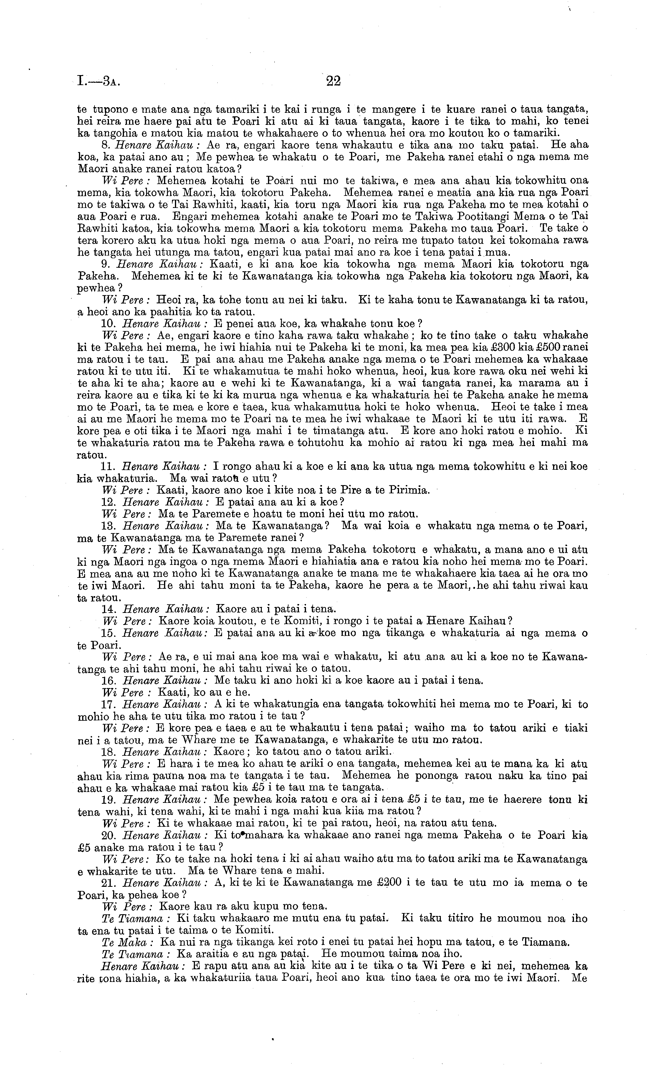 te tupono c mate ana nga tamariki i te kai i runga i te mangere i te kuare ranei o taua tangata, hei reira me haere pai atu te Poari ki atu ai ki taua tangata, kaore i te tika to mahi, ko tenei ka tangohia c matou kia matou te whakahaere o to whenua hei ora mo koutou ko o tamariki. 8. Henare Kaihau : Ac ra, engari kaore tena whakautu c tika ana mo taku patai. He aha koa, ka patai ano au ; Me pewhea te whakatu o te Poari, me Pakeha ranei etahi o nga mema me Maori anake ranei ratou katoa? Wi Pere : Mehemea kotahi te Poari nui mo te takiwa, c mea ana ahau kia tokowhitu ona mema, kia tokowha Maori, kia tokotoru Pakeha. Mehemea ranei c meatia ana kia rua nga Poari mo te takiwa o te Tai Eawhiti, kaati, kia toru nga Maori kia rua nga Pakeha mo te mea kotahi o aua Poari c rua. Engari mehemea kotahi anake te Poari mo te Takiwa Pootitangi Mema ote Tai Eawhiti katoa, kia tokowha mema Maori a kia tokotoru mema Pakeha mo taua Poari. Te take o tera korero aku ka utua hoki nga mema o aua Poari, no reira me tupato tatou kei tokomaha rawa he tangata hei utunga ma tatou, engari kua patai mai ano ra koe i tena patai i mua. 9. Henare Kaihau: Kaati, c ki ana koe kia tokowha nga mema Maori kia tokotoru nga Pakeha. Mehemea kite kite Kawanatanga kia tokowha nga Pakeha kia tokotoru nga Maori, ka pewhea ? Wi Pere : Heoi ra, ka tohe tonu au nei ki taku. Xi te kaha tonu te Kawanatanga ki ta ratou, a heoi ano ka paahitia ko ta ratou. 10. Henare Kaihau : E penei aua koe, ka whakahe tonu koe ? Wi Pere : Ac, engari kaore c tino kaha rawa taku whakahe ; ko te tino take o taku whakahe kite Pakeha hei mema, he iwi hiahia nui te Pakeha kite moni, ka mea pea kia £300 kia £500 ranei ma ratou ite tau. E pai ana ahau me Pakeha anake nga mema ote Poari mehemea ka whakaae ratou kite utu iti. Xi te whakamutua te mahi hoko whenua, heoi, kua kore rawa oku nei wehi ki te aha kite aha; kaore au c wehi kite Kawanatanga, ki a wai tangata ranei, ka marama au i reira kaore au c tika kite ki ka murua nga whenua cka whakaturia hei te Pakeha anake he mema mo te Poari, ta te mea c kore c taea, kua whakamutua hoki te hoko whenua. Heoi te take i mea ai au me Maori he mema mo te Poari na te mea he iwi whakaae te Maori kite utu iti rawa. E kore pea c oti tika ite Maori nga mahi i te timatanga atu. E kore ano hoki ratou c mohio. Xi te whakaturia ratou ma te Pakeha rawa c tohutohu ka mohio ai ratou ki nga mea hei mahi ma ratou. 11. Henare Kaihau : I rongo ahau ki a koe c ki ana ka utua nga mema tokowhitu c ki nei koe kia whakaturia. Ma wai ratou c utu ? Wi Pere : Kaati, kaore ano koe i kite noa i te Pire a te Pirimia. 12. Henare Kaihau : E patai ana au ki a koe ? Wi Pere : Ma te Paremete c hoatu te moni hei utu mo ratou. 13. Henare Kaihau: Ma te Kawanatanga? Ma wai koia c whakatu nga mema ote Poari, ma te Kawanatanga ma te Paremete ranei ? Wi Pere : Ma te Kawanatanga nga mema Pakeha tokotoru c whakatu, a mana ano c vi atu ki nga Maori nga ingoa o nga mema Maori c hiahiatia ana c ratou kia noho hei mema mo te Poari. E mea ana au me noho ki fee Kawanatanga anake te mana me te whakahaere kia taea ai he ora mo te iwi Maori. He ahi tahu moni ta te Pakeha, kaore he pera ate Maori,.he ahi tahu riwai kau ta ratou. 14. Henare Kaihau : Kaore au i patai i tena. Wi Pere : Kaore koia koutou, c te Komiti, i rongo i te patai a Henare Kaihau? 15. Henare Kaihau: E patai ana au ki a-koe mo nga tikanga c whakaturia ai nga mema o te Poari. Wi Pere : Ac ra, c vi mai ana koe ma wai c whakatu, ki atu ana au ki a koe no te Kawanatanga te ahi tahu moni, he ahi tahu riwai ke o tatou. 16. Henare Kaihau : Me taku ki ano hoki ki a koe kaore au i patai i tena. Wi Pere : Kaati, ko au c he. 17. Henare Kaihau : A kite whakatungia ena tangata tokowhiti hei mema mo te Poari, ki to mohio he aha te utu tika mo ratou i te tau ? Wi Pere : E kore pea c taea eau te whakautu i tena patai; waiho ma to tatou ariki c tiaki nei i a tatou, ma te Whare me te Kawanatanga, c whakarite te utu mo ratou. 18. Henare Kaihau : Kaore ; ko tatou ano o tatou ariki. Wi Pere : E hara i te mea ko ahau te ariki o ena tangata, mehemea kei au te mana ka ki atu ahau kia rima pauna noa ma te tangata ite tau. Mehemea he pononga ratou naku ka tino pai ahau c ka whakaae mai ratou kia £5 i te tau ma te tangata. 19. Henare Kaihau : Me pewhea koia ratou c ora ai i tena £5 i te tau, me te haerere tonu ki tena wahi, ki tena wahi, kite mahi i nga mahi kua kiia ma ratou ? Wi Pere :Xi te whakaae mai ratou, kite pai ratou, heoi, na ratou atu tena. 20. Henare Kaihau : Xi ka whakaae ano ranei nga mema Pakeha o te Poari kia £5 anake ma ratou i te tau ? Wi Pere: Ko te take na hoki tena iki ai ahau waiho atu ma to tatou ariki ma te Kawanatanga c whakarite te utu. Ma te Whare tena c mahi. 21. Henare Kaihau :A, kite kite Kawanatanga me £200 ite tau te utu mo ia mema ote Poari, ka pehea koe ? Wi Pere : Kaore kau ra aku kupu mo tena. Te Tiamana : Xi taku whakaaro me mutu ena tv patai. Xi taku titiro he moumou noa iho ta ena tv patai i te taima o te Komiti. Te Maka : Ka nui ra nga tikanga kei roto i enei tv patai hei hopu ma tatou, c te Tiamana. Te Tiamana : Ka araitia eau nga patai. He moumou taima noa iho. Henare Kaihau: E rapu atu ana au kia kite au ite tika ota Wi Pere c ki nei, mehemea ka rite cona hiahia, aka whakaturiia taua Poari, heoi ano kua tino taea te ora mo te iwi Maori. Me