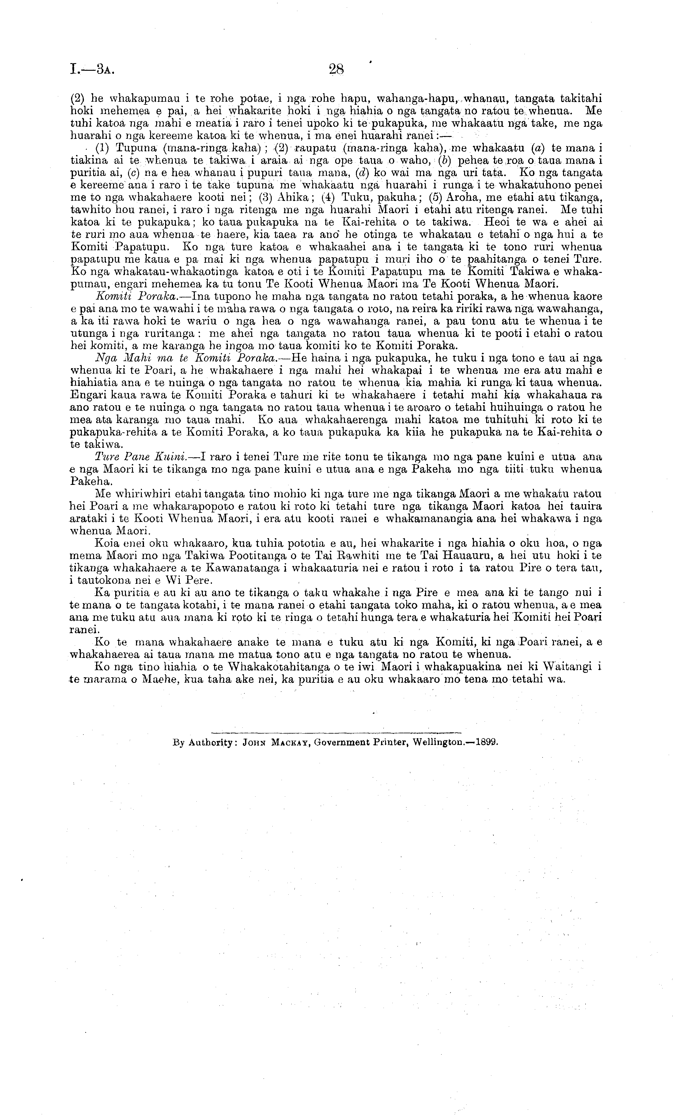 (2) he whakapumau i te rohe potae, i nga rohe hapu, wahanga-hapu, whanau, tangata takitahi hoki mehemea c pai, a hei whakarite hoki i nga hiahia o nga tangata no ratou te, whenua. Me tuhi katoa nga niahi c meatia i raro i tenei upoko kite pukapuka, me whakaatu nga take, me nga huarahi o nga kereeme katoa kite whenua, ima enei huarahi ranei:— • (1) Tupuna (mana-ringa kaha) ; (2) raupatu (rnana-ringa kaha), me whakaatu (a) te mana i tiakina ai te whenua te takiwa i araia ai nga ope taua o waho, (b) pehea te roa o taua mana i puritia ai, (c) na c hea whanau i pupuri taua mana, (d) ko wai ma nga uri tata. Ko nga tangata c kereeme ana i raro i te take tupuna me whakaatu nga huarahi i runga i te whakatuhono penei me to nga whakahaere kooti nei; (3) Ahika ; (4) Tuku, pakuha; (5) Aroha, me etahi atu tikanga, tawhito hou ranei, i raro i nga ritenga me nga huarahi Maori i etahi atu ritenga ranei. Me tuhi katoa kite pukapuka; ko taua pukapuka na te Kai-rehita ote takiwa. Heoi te wa c ahei ai te ruri mo aua whenua te haere, kia taea ra ano' he otinga te whakatau c tetahi o nga hui a te Komiti Papatupu. Ko nga ture katoa c whakaahei ana ite tangata kite tono ruri whenua papatupu me kaua c pa mai ki nga whenua papatupu i muri iho o te paahitanga o tenei Ture. Ko nga whakatau-whakaotinga katoa c oti i te Komici Papatupu ma te Komiti Takiwa c whakapumau, engari mehemea ka tv tonu Te Kooti Whenua Maori ma Te Kooti Whenua Maori. Komiti Poraka. —lna tupono he maha nga tangata no ratou tetahi poraka, a he whenua kaore c pai ana mo te wawahi i te maha rawa o nga tangata o roto, na reira ka ririki rawa nga wawahanga, a ka iti rawa hoki te wariu o nga hea o nga wawahanga ranei, a pau tonu atu te whenua i te utunga i nga ruritanga :me ahei nga tangata no ratou taua whenua ki te pooti i etahi o ratou hei komiti, a me karanga he ingoa mo taua komiti ko te Komiti Poraka. Nga Mahi ma te Komiti Poraka. —He haina i nga pukapuka, he tuku i nga tono c tau ai nga whenua kite Poari, ahe whakahaere i nga mahi hei whakapai ite whenua me era atu mahi c hiahiatia ana c te nuinga o nga tangata no ratou te whenua kia mahia ki runga ki taua whenua. Engari kaua rawa te Komiti Poraka c tahuri kite whakahaere i tetahi mahi kia whakahaua ra ano ratou c te nuinga o nga tangata no ratou taua whenua i te aroaro o tetahi huihuinga o ratou he mea ata karanga mo taua mahi. Ko aua whakahaerenga mahi katoa me tuhituhi ki roto kite pukapuka-rehita a te Komiti Poraka, a ko taua pukapuka ka kiia he pukapuka na te Kai-rehica o te takiwa. Ture Pane Kuini. —l raro i tenei Ture me rite tonu te tikanga mo nga pane kuini c utua ana c nga Maori kite tikanga mo nga pane kuini c utua aua c nga Pakeha mo nga tiiti tuku whenua Pakeha. Me whiriwhiri etahi tangata tino mohio ki nga ture me nga tikanga Maori a me whakatu ratou hei Poari a me whakarapopoto c ratou ki roto ki tetahi ture nga tikanga Maori katoa hei tauira arataki i te Kooti Whenua Maori, i era atu kooti ranei c whakamanangia ana hei whakawa i nga whenua Maori. Koia enei oku whakaaro, kua tuhia pototia c au, hei whakarite i nga hiahia o oku hoa, o nga mema Maori mo nga Takiwa Pootitanga o te Tai Bawhiti me te Tai Hauauru, a hei utu hoki i te tikanga whakahaere a te Kawanatanga i whakaaturia nei c ratou i roto i ta ratou Pire o tera tau, i tautokona nei c Wi Pere. Ka puritia cauki au ano te tikanga o taku whakahe i nga Pire c inea ana kite tango nui i te mana o te tangata kotahi, i te mana ranei o etahi tangata toko maha, ki o ratou whenua, a c mea ana me tuku atu aua mana ki roto kite ringa o tetahi hunga tera c whakaturia hei Komiti hei Poari ranei. Ko te mana whakahaere anake te mana c tuku atu ki nga Komiti, ki nga Poari ranei, a c whakahaerea ai taua mana me matua tono atu c nga tangata no ratou te whenua. Ko nga tino hiahia o te Whakakotahitanga o te iwi Maori i whakapuakina nei ki Waitangi i te maiama o Maehe, kua taha ake nei, ka puritia c au oku whakaaro mo tena mo tetahi wa.