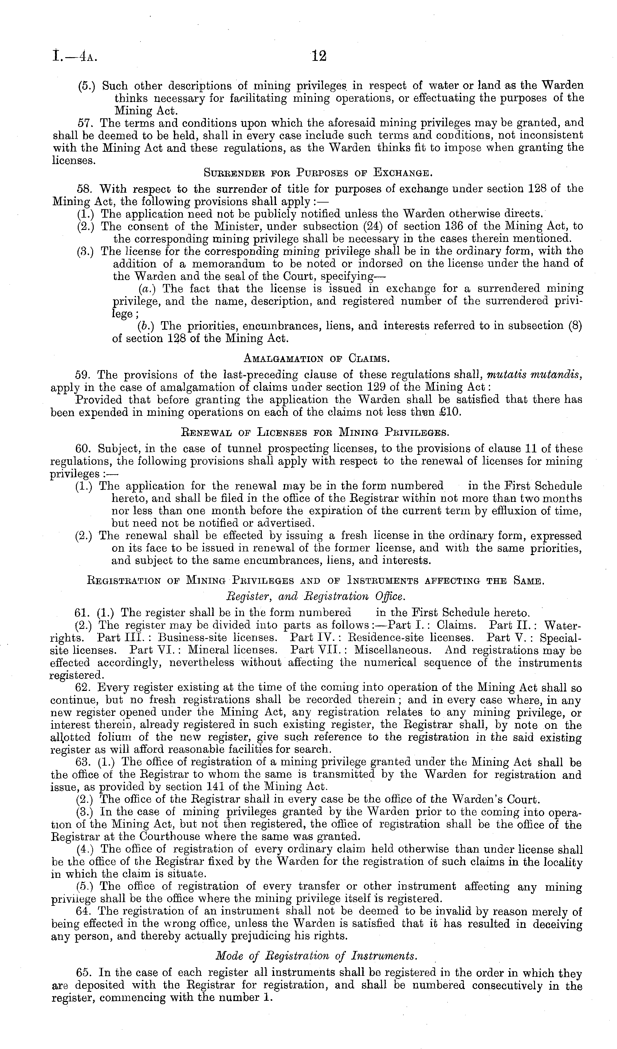 (5.) Such other descriptions of mining privileges, in respect of water or land as the Warden thinks necessary for facilitating mining operations, or effectuating the purposes of the Mining Act. 57. The terms and conditions upon which the aforesaid mining privileges may be granted, and shall be deemed to be held, shall in every case include such terms and conditions, not inconsistent with the Mining Act and these regulations, as the Warden thinks fit to impose when granting the licenses. Surrender for Purposes of Exchange. 58. With respect to the surrender of title for purposes of exchange under section 128 of the Mining Act, the following provisions shall apply : — (1.) The application need not be publicly notified unless the Warden otherwise directs. (2.) The consent of the Minister, under subsection (24) of section 136 of the Mining Act, to the corresponding mining privilege shall be necessary in the cases therein mentioned. (3.) The license for the corresponding mining privilege shall be in the ordinary form, with the addition of a memorandum to be noted or indorsed on the license under the hand of the Warden and the seal of the Court, specifying— (a.) The fact that the license is issued in exchange for a surrendered mining privilege, and the name, description, and registered number of the surrendered privilege ; (b.) The priorities, encumbrances, liens, and interests referred to in subsection (8) of section 128 of the Mining Act. Amalgamation of Claims. 59. The provisions of the last-preceding clause of these regulations shall, mutatis mutandis, apply in the case of amalgamation of claims under section 129 of the Mining Act: Provided that before granting the application the Warden shall be satisfied that there has been expended in mining operations on each of the claims not less then £10. Eenewal of Licenses for Mining Privileges. 60. Subject, in the case of tunnel prospecting licenses, to the provisions of clause 11 of these regulations, the following provisions shall apply with respect to the renewal of licenses for mining privileges :— (1.) The application for the renewal may be in the form numbered in the First Schedule hereto, and shall be filed in the office of the Eegistrar within not more than two months nor less than one month before the expiration of the current term by effluxion of time, but need not be notified or advertised. (2.) The renewal shall be effected by issuing a fresh license in the ordinary form, expressed on its face to be issued in renewal of the former license, and with the same priorities, and subject to the same encumbrances, liens, and interests. Eegistration of Mining Privileges and of Instruments affecting the Same. Begister, and Begistration Office. 61. (1.) The register shall be in the form numbered in the First Schedule hereto. (2.) The register may be divided into parts as follows : —Part I. : Claims. Part II.: Waterrights. Part 111. : Business-site licenses. Part IV. : Eesidence-site licenses. Part V. : Specialsite licenses. Part VI. : Mineral licenses. Part VII. : Miscellaneous. And registrations may be effected accordingly, nevertheless without affecting the numerical sequence of the instruments registered. 62. Every register existing at the time of the coming into operation of the Mining Act shall so continue, but no fresh registrations shall be recorded therein; and in every case where, in any new register opened under the Mining Act, any registration relates to any mining privilege, or interest therein, already registered in such existing register, the Eegistrar shall, by note on the allotted folium of the new register, give such reference to the registration in the said existing register as will afford reasonable facilities for search. 63. (1.) The office of registration of a mining privilege granted under the Mining Act shall be the office of the Eegistrar to whom the same is transmitted by the Warden for registration and issue, as provided by section 141 of the Mining Act. (2.) The office of the Eegistrar shall in every case be the office of the Warden's Court. (3.) In the case of mining privileges granted by the Warden prior to the coming into operation of the Mining Act, but not then registered, the office of registration shall be the office of the Eegistrar at the Courthouse where the same was granted. (4.) The office of registration of every ordinary claim held otherwise than under license shall be the office of the Eegistrar fixed by the Warden for the registration of such claims in the locality in which the claim is situate. (5.) The office of registration of every transfer or other instrument affecting any mining privilege shall be the office where the mining privilege itself is registered. 64. The registration of an instrument shall not be deemed to be invalid by reason merely of being effected in the wrong office, unless the Warden is satisfied that it has resulted in deceiving any person, and thereby actually prejudicing his rights. Mode of Begistration of Instruments. 65. In the case of each register all instruments shall be registered in the order in which they are deposited with the Eegistrar for registration, and shall be numbered consecutively in the register, commencing with the number 1.