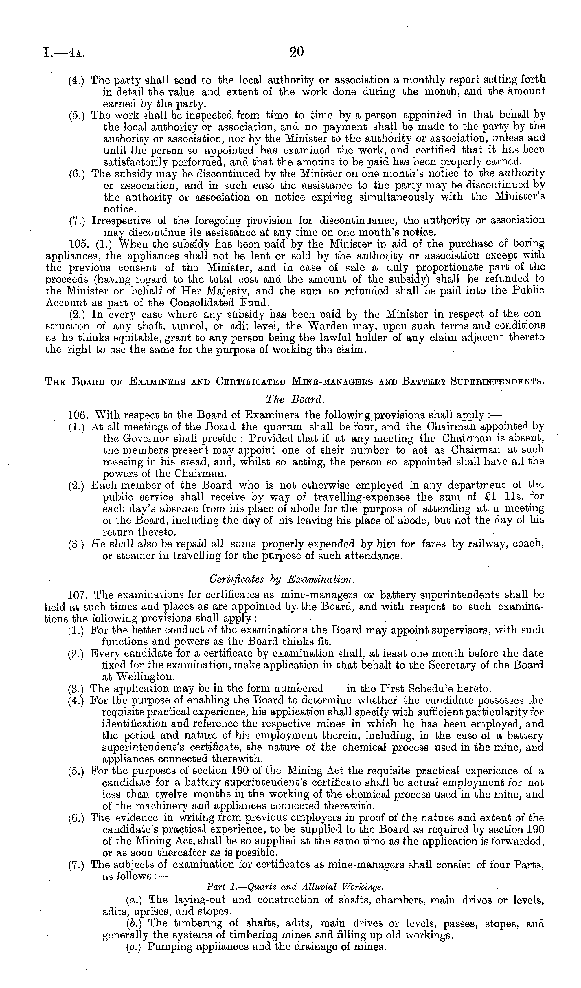 (4.) The party shall send to the local authority or association a monthly report setting forth in detail the value and extent of the work done during the month, and the amount earned by the party. (5.) The work shall be inspected from time to time by a person appointed in that behalf by the local authority or association, and no payment shall be made to the party by the authority or association, nor by the Minister to the authority or association, unless and until the person so appointed has examined the work, and certified that it has been satisfactorily performed, and that the amount to be paid has been properly earned. (6.) The subsidy may be discontinued by the Minister on one month's notice to the authority or association, and in such case the assistance to the party may be discontinued by the authority or association on notice expiring simultaneously with the Minister's notice. (7.) Irrespective of the foregoing provision for discontinuance, the authority or association may discontinue its assistance at any time on one month's notice. 105. (1.) When the subsidy has been paid by the Minister in aid of the purchase of boring appliances, the appliances shall not be lent or sold by the authority or association except with the previous consent of the Minister, and in case of sale a duly proportionate part of the proceeds (having regard to the total cost and the amount of the subsidy) shall be refunded to the Minister on behalf of Her Majesty, and the sum so refunded shall be paid into the Public Account as part of the Consolidated Fund. (2.) In every case where any subsidy has been paid by the Minister in respect of the construction of any shaft, tunnel, or adit-level, the Warden may, upon such terms and conditions as he thinks equitable, grant to any person being the lawful holder of any claim adjacent thereto the right to use the same for the purpose of working the claim. The Board of Examiners and Certificated Mine-managers and Battery Superintendents. The Board. 106. With respect to the Board of Examiners the following provisions shall apply : — (1.) At all meetings of the Board the quorum shall be four, and the Chairman appointed by the Governor shall preside : Provided that if at any meeting the Chairman is absent, the members present may appoint one of their number to act as Chairman at such meeting in his stead, and, whilst so acting, the person so appointed shall have all the powers of the Chairman. (2.) Each member of the Board who is not otherwise employed in any department of the public service shall receive by way of travelling-expenses the sum of £1 lis. for each day's absence from his place of abode for the purpose of attending at a meeting of the Board, including the day of his leaving his place of abode, but not the day of his return thereto. (3.) He shall also be repaid all sums properly expended by him for fares by railway, coach, or steamer in travelling for the purpose of such attendance. Certificates by Examination. 107. The examinations for certificates as mine-managers or battery superintendents shall be held at such times and places as are appointed by the Board, and with respect to such examinations the following provisions shall apply : — (1.) For the better conduct of the examinations the Board may appoint supervisors, with such functions and powers as the Board thinks fit. (2.) Every candidate for a certificate by examination shall, at least one month before the date fixed for the examination, make application in that behalf to the Secretary of the Board at Wellington. (3.) The application may be in the form numbered in the First Schedule hereto. (4.) For the purpose of enabling the Board to determine whether the candidate possesses the requisite practical experience, his application shall specify with sufficient particularity for identification and reference the respective mines in which he has been employed, and the period and nature of his employment therein, including, in the case of a battery superintendent's certificate, the nature of the chemical process used in the mine, and appliances connected therewith. (5.) For the purposes of section 190 of the Mining Act the requisite practical experience of a candidate for a battery superintendent's certificate shall be actual employment for not less than twelve months in the working of the chemical process used in the mine, and of the machinery and appliances connected therewith. (6.) The evidence in writing from previous employers in proof of the nature and extent of the candidate's practical experience, to be supplied to the Board as required by section 190 of the Mining Act, shall be so supplied at the same time as the application is forwarded, or as soon thereafter as is possible. (7.) The subjects of examination for certificates as mine-managers shall consist of four Parts, as follows :— Part 1. — Quartz and Alluvial Workings. (a.) The laying-out and construction of shafts, chambers, main drives or levels, adits, uprises, and stopes. (b.) The timbering of shafts, adits, main drives or levels, passes, stopes, and generally the systems of timbering mines and filling up old workings. (c.) Pumping appliances and the drainage of mines.