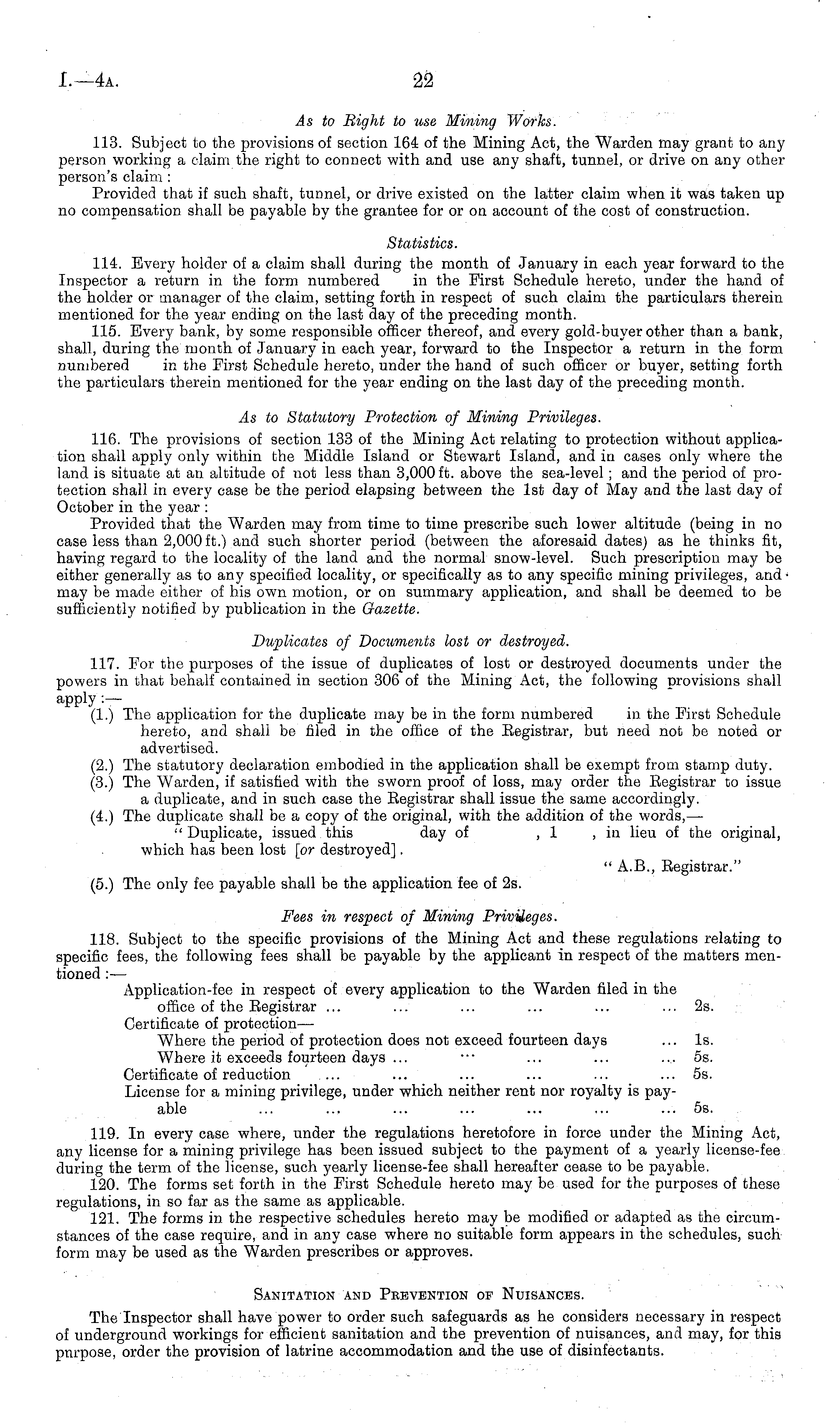As to Bight to use Mining Works. 113. Subject to the provisions of section 164 of the Mining Act, the Warden may grant to any person working a claim the right to connect with and use any shaft, tunnel, or drive on any other person's claim : Provided that if such shaft, tunnel, or drive existed on the latter claim when it was taken up no compensation shall be payable by the grantee for or on account of the cost of construction. Statistics. 114. Every holder of a claim shall during the month of January in each year forward to the Inspector a return in the form numbered in the First Schedule hereto, under the hand of the holder or manager of the claim, setting forth in respect of such claim the particulars therein mentioned for the year ending on the last day of the preceding month. 115. Every bank, by some responsible officer thereof, and every gold-buyer other than a bank, shall, during the month of January in each year, forward to the Inspector a return in the form numbered in the First Schedule hereto, under the hand of such officer or buyer, setting forth the particulars therein mentioned for the year ending on the last day of the preceding month. As to Statutory Protection of Mining Privileges. 116. The provisions of section 133 of the Mining Act relating to protection without application shall apply only within the Middle Island or Stewart Island, and in cases only where the land is situate at an altitude of not less than 3,000 ft. above the sea-level; and the period of protection shall in every case be the period elapsing between the Ist day of May and the last day of October in the year : Provided that the Warden may from time to time prescribe such lower altitude (being in no case less than 2,000 ft.) and such shorter period (between the aforesaid dates) as he thinks fit, having regard to the locality of the land and the normal snow-level. Such prescription may be either generally as to any specified locality, or specifically as to any specific mining privileges, and ■ may be made either of his own motion, or on summary application, and shall be deemed to be sufficiently notified by publication in the Gazette. Duplicates of Documents lost or destroyed. 117. For the purposes of the issue of duplicates of lost or destroyed documents under the powers in that behalf contained in section 306 of the Mining Act, the following provisions shall apply :— (1.) The application for the duplicate may be in the form numbered in the First Schedule hereto, and shall be filed in the office of the Eegistrar, but need not be noted or advertised. (2.) The statutory declaration embodied in the application shall be exempt from stamp duty. (3.) The Warden, if satisfied with the sworn proof of loss, may order the Eegistrar to issue a duplicate, and in such case the Eegistrar shall issue the same accordingly. (4.) The duplicate shall be a copy of the original, with the addition of the words, — " Duplicate, issued this day of ,1 , in lieu of the original, which has been lost [or destroyed]. " A.8., Eegistrar." (5.) The only fee payable shall be the application fee of 2s. Fees in respect of Mining Privileges. 118. Subject to the specific provisions of the Mining Act and these regulations relating to specific fees, the following fees shall be payable by the applicant in respect of the matters mentioned :— Application-fee in respect of every application to the Warden filed in the office of the Eegistrar ... ... ... ... ... ... 2s. Certificate of protection — Where the period of protection does not exceed fourteen days ... Is. Where it exceeds fourteen days ... ••• ... ... .... ss. Certificate of reduction .... ... ... ... ... ... ss. License for a mining privilege, under which neither rent nor royalty is payable ... ... ... ... ... ... ... ss. 119. In every case where, under the regulations heretofore in force under the Mining Act, any license for a mining privilege has been issued subject to the payment of a yearly license-fee during the term of the license, such yearly license-fee shall hereafter cease to be payable. 120. The forms set forth in the First Schedule hereto may be used for the purposes of these regulations, in so far as the same as applicable. 121. The forms in the respective schedules hereto may be modified or adapted as the circumstances of the case require, and in any case where no suitable form appears in the schedules, such form may be used as the Warden prescribes or approves. Sanitation and Prevention of Nuisances. The Inspector shall have power to order such safeguards as he considers necessary in respect of underground workings for efficient sanitation and the prevention of nuisances, and may, for this purpose, order the provision of latrine accommodation and the use of disinfectants.