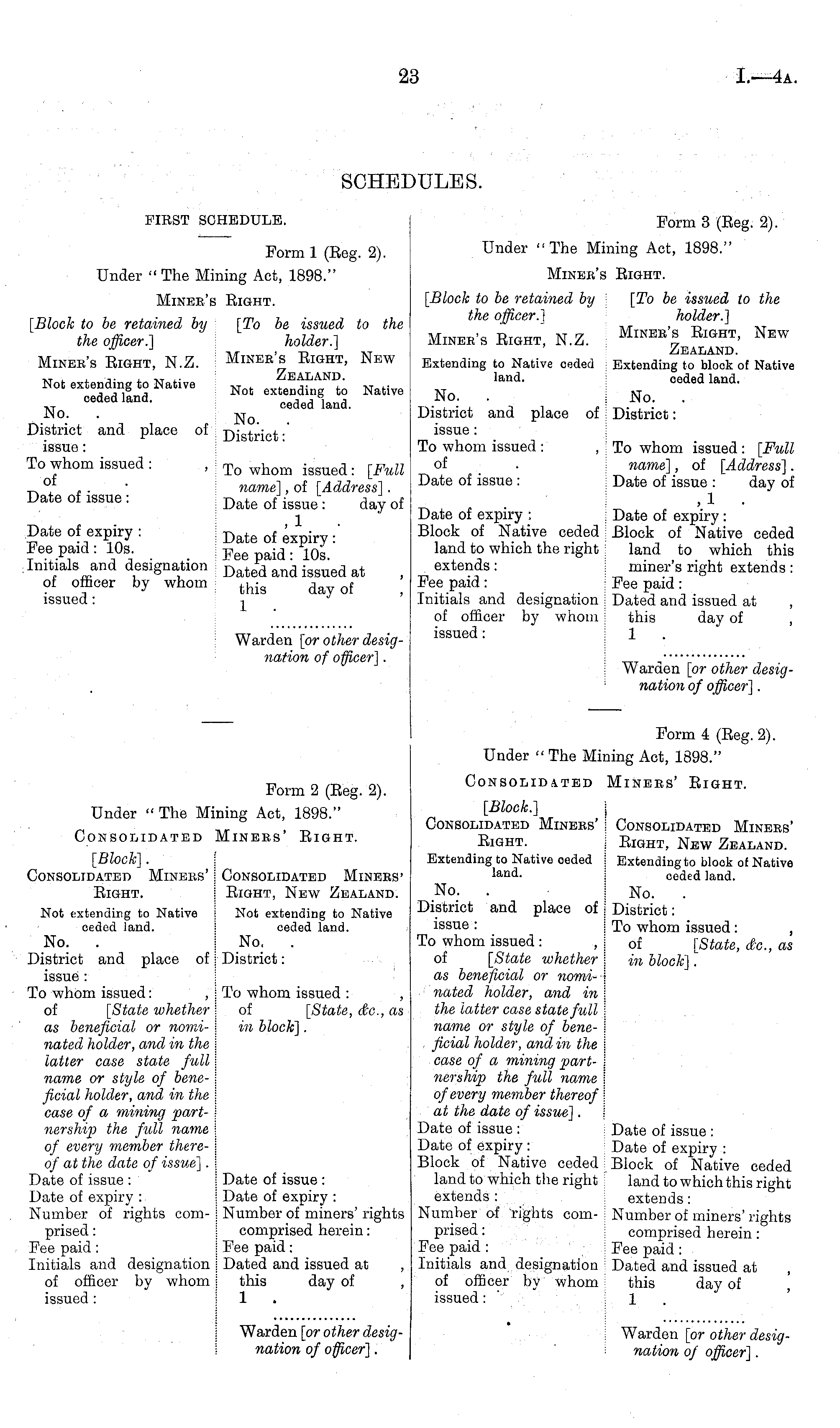 Form 4 (Eeg. 2). Under " The Mining Act, 1898." Consolidated Miners' Eight. [Block.] j Consolidated Miners' j Consolidated Miners' Eight- j Eight, New Zealand. Extending to Native oeded j Extending to block of Native land, ceded land. No. . No. . District and place of j District: issue : j To whom issued : To whom issued : , j of [State, d;c, as of [State whether j in block]. as beneficial or nomi- j nated holder, and in \ the latter case state full \ name or style of bene- \ ficial holder, and in the \ case of a mining part- \ nership the full name j of every member thereof j at the date of issue]. I Date of issue : j Date of issue : Date of expiry : Date of expiry : Block of Native ceded j Block of Native ceded land to which the right j land to which this right extends : extends: Number of rights com- ! Number of miners' rights prised : comprised herein : Fee paid : \ Fee paid : Initials and designation i Dated and issued at of officer by whom I this day of issued: ; 1 . I Warden [or other designation of officer].