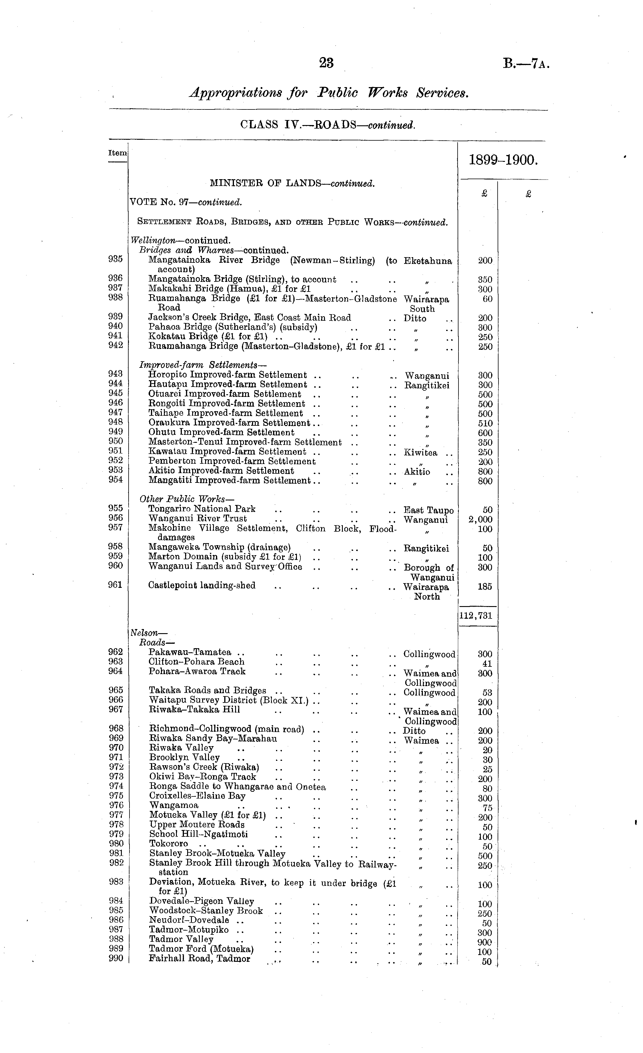 [tern 1899-1900. MINISTER OP LANDS— continued. VOTE No. 97—continued. & Settlement Roads, Bridges, and other Public Wobks— continued. 185 )3G 137 )3H Wellington —continued. Bridges and Wharves —continued. Mangatainoka River Bridge (Newman-Stirling) (to Eketahuna account) Mangatainoka Bridge (Stirling), to account Makakahi Bridge (Hamua), £1 for £1 .. .. „ Ruamahanga Bridge (£1 for £1) —Masterfcon-Gladstone Wairarapa Road South Jackson's Creek Bridge, East Coast Main Road .. Ditto Pahaoa Bridge (Sutherland's) (subsidy) .. .. „ Kokatau Bridge (£1 for £1) .. Ruamahanga Bridge (Masterton-Gladstone), £1 for £1 .. 200 350 300 60 139 140 141 200 300 250 250 143 144 145 146 147 148 140 150 •51 152 153 154 Improved-farm Settlements — Horopito Improved-farm Settlement .. .. ... Wanganui Hautapu Improved-farm Settlement .. .. .. Rangitikei Otuarei Improved-farm Settlement .. .. .. „ Rongoiti Improved-farm Settlement Taihape Improved-farm Settlement Oraukura Improved-farm Settlement Ohutu Improved-farm Settlement Mastorton-Tenui Improved-farm Settlement .. Kawatau Improved-farm Settlement .. .. .. Kiwitea Pemberton Improved-farm Settlement .. .. „ Akitio Improved-farm Settlement .. .. .. Akitio Mangatiti Improved-farm Settlement 300 300 500 500 500 510 600 350 250 200 800 800 155 IS6 157 158 159 160 Other Public Works — Tongariro National Park .. .. .. .. East Taupo Wanganui River Trust .. .. .. .. Wanganui Makohine Village Settlement, Clifton Block, Flooddamages Mangaweka Township (drainage) .. .. .. Rangitikei Marton Domain (subsidy £1 for £1) Wanganui Lands and Survey Office .. .. .. Borough of Wanganui Castlepoint landing-shed .. .. .. .. Wairarapa North 50 2,000 100 50 100 300 IGl 185 112,731 962 963 904 965 966 967 968 969 970 971 97i! 973 974 975 976 977 978 979 980 981 982 Nelson — Roads — Pakawau-Tamatea .. .. .. .. .. Collingwood Clifton-Pohara Beach Pohara-Awaroa Track .. .. .. .. Waimea andj Collingwood Takaka Roads and Bridges .. .. .. .. Gollingwood Waitapu Survey District (Block XI.) .. Riwaka-Takaka Hill .. .. .. '' Waimea and Collingwood Ricnmond-Collingwood (main road) .. .. .. Ditto Riwaka Sandy Bay-Marahau .. .. Waimea '. '. Riwaka Valley Brooklyn Valley .. .. .. .. \[ " Rawson's Creek (Riwaka) Okiwi Bay-Ronga Track Ronga Saddle to Whangarae and Onetea Groixelles-Elaino Bay Wangamoa .. ... Motueka Valley (£1 for £1) .. .. .. \ . Upper Moutere Roads .. ■ School Hill-Ngatimoti Tokororo Stanley Brook-Motueka Valley Stanley Brook Hill through Motueka Valley to Railway- "„ station Deviation, Motueka River, to keep it under bridge (£1 for £1) 6 ( Dovedale-Pigeon Valley .. .. ../'„' Woodstock-Stanley Brook Neudorf-Dovedale .. Tadmor-Motupiko .. .. .. . _ " Tadmor Valley .. .... .. " Tadmor Ford (Motueka) .. .. \\ Fairhall Road, Tadmor 300 41 300 53 200 100 200 200 20 30 25 200 80 300 75 200 50 100 50 500 250 983 100 984 985 986 987 988 989 990 100 250 50 300 900 100 50