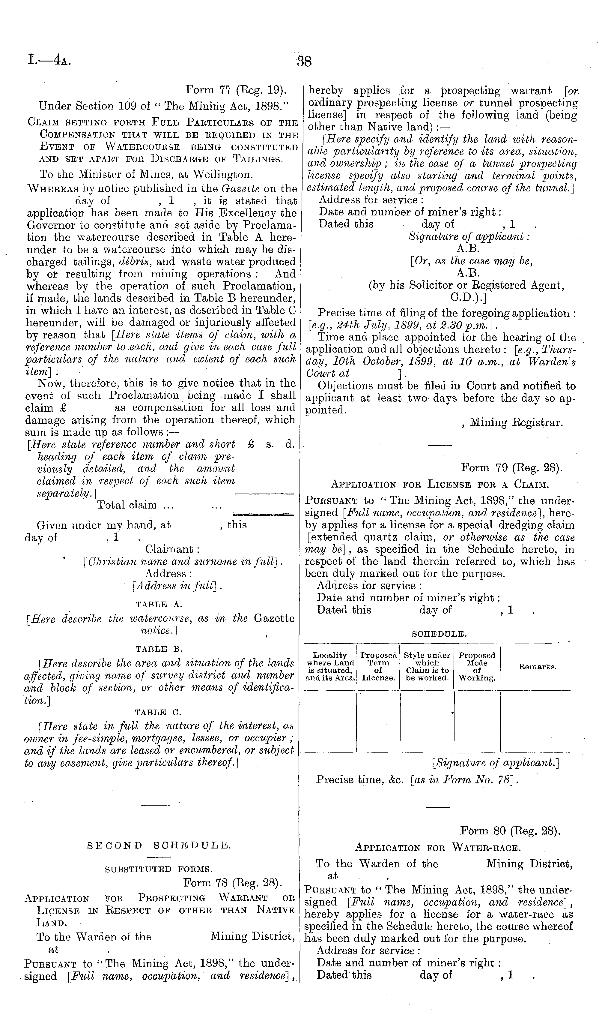 SUBSTITUTED FORMS. Form 78 (Beg. 28). Application for Prospecting Warrant or License in Eespect of other than Native Land. To the Warden of the Mining District, at Pursuant to "The Mining Act, 1898," the undersigned [Full name, occupation, and residence],