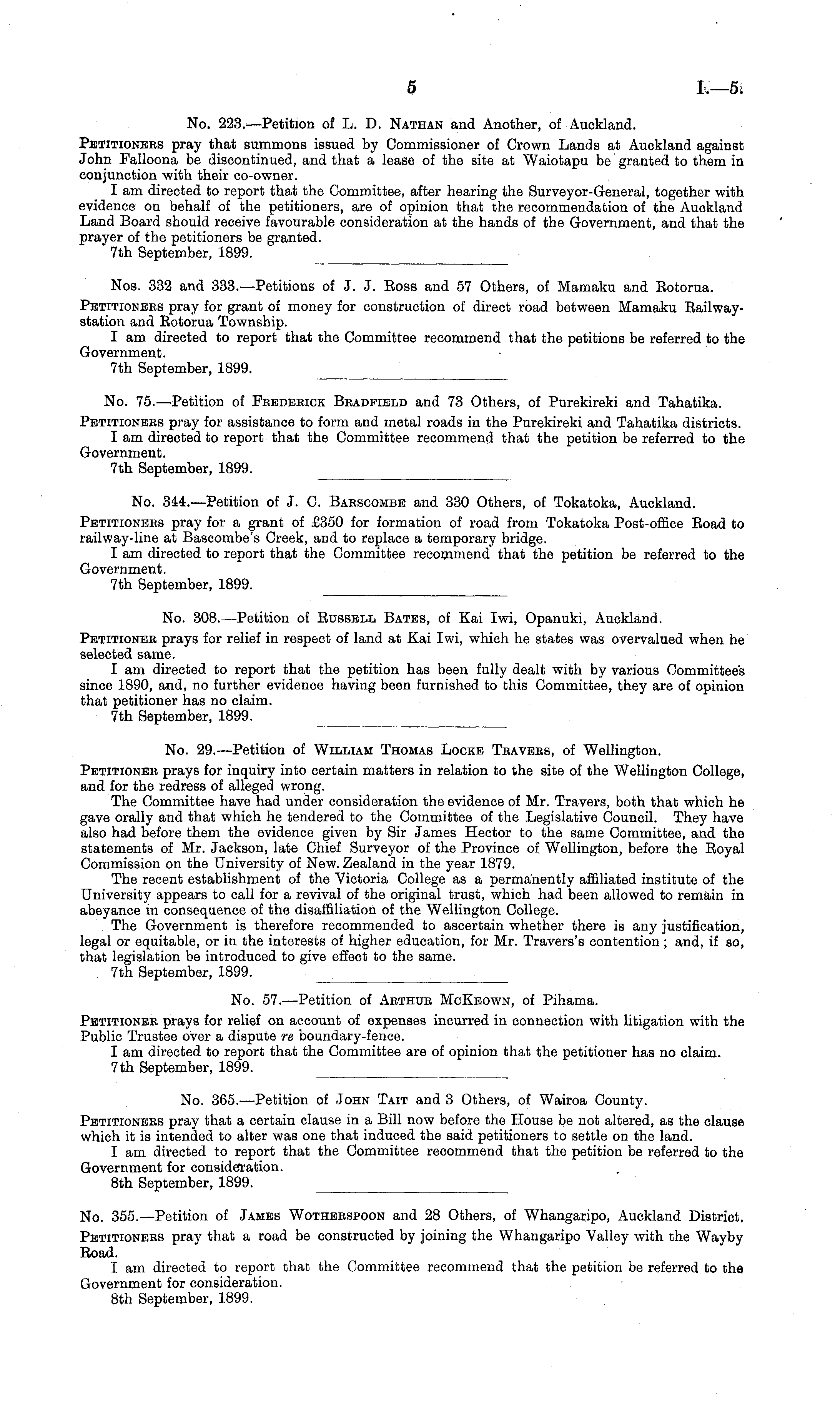 No. 223. —Petition of L. D. Nathan and Another, of Auckland. Petitionees pray that summons issued by Commissioner of Crown Lands at Auckland against John Falloona be discontinued, and that a lease of the site at Waiotapu be granted to them in conjunction with their co-owner. I am directed to report that the Committee, after hearing the Surveyor-General, together with evidence on behalf of the petitioners, are of opinion that the recommendation of the Auckland Land Board should receive favourable consideration at the hands of the Government, and that the prayer of the petitioners be granted. 7th September, 1899.