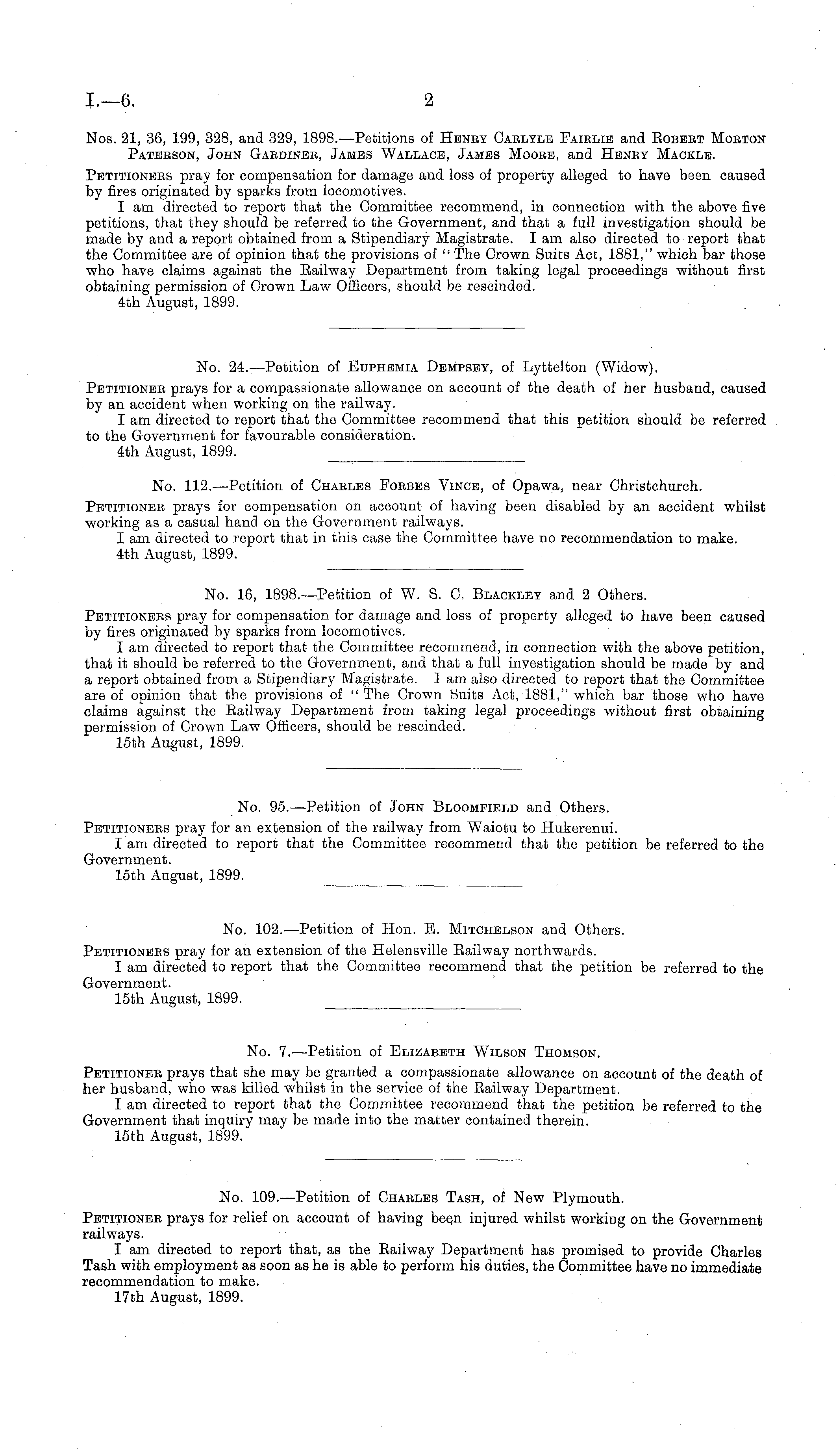 No. 16, 1898.—Petition of W. S. C. Blackley and 2 Others. Petitionees pray for compensation for damage and loss of property alleged to have been caused by fires originated by sparks from locomotives. I am directed to report that the Committee recommend, in connection with the above petition, that it should be referred to the Government, and that a full investigation should be made by and a report obtained from a Stipendiary Magistrate. lam also directed to report that the Committee are of opinion that the provisions of " The Crown Huits Act, 1881," which bar those who have claims against the Eailway Department from taking legal proceedings without first obtaining permission of Crown Law Officers, should be rescinded. 15th August, 1899.