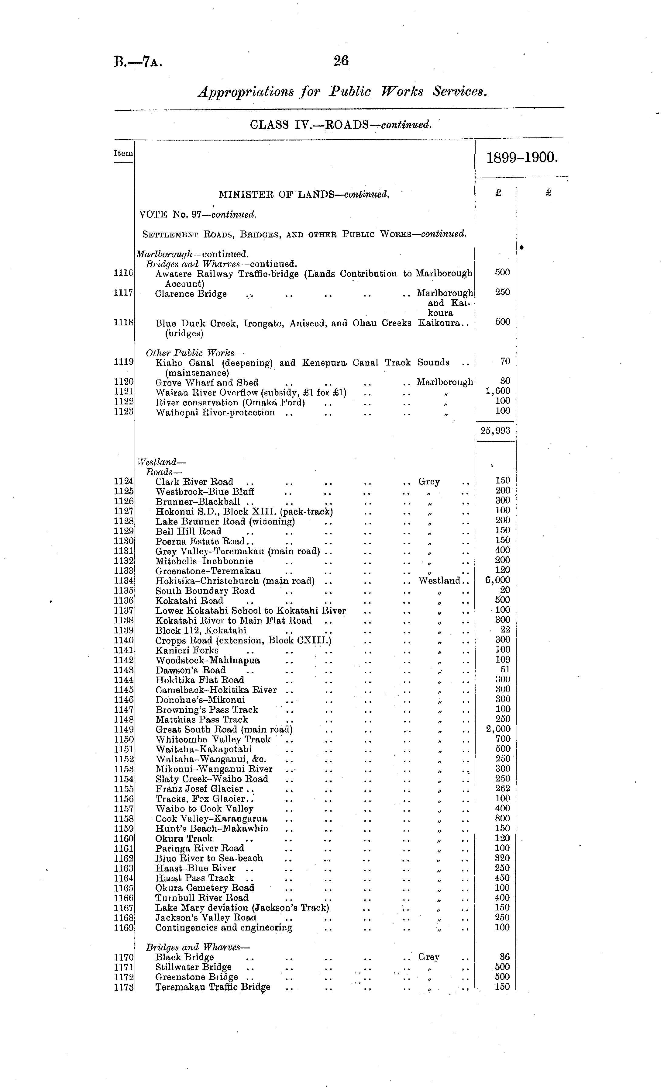 :tem 1899-1901 MINISTER OF LANDS— continued. s: VOTE No. 91—continued. Setti/ement Boads, Bridges, and otheb Public Woeks — continued. 116 117 Marlborough — conti nued. Bridges and Wharves -continued. Avvatere Railway Traffic-bridge (Lands Contribution to Marlborough Account) Clarence Bridge .. .. .. .. .. Marlborough and Kaikoura Blue Duck Creek, Irongate, Aniseed, and Ohau Creeks Kaikoura.. (bridges) 500 250 .118 500 Other Public Works— Kiaho Canal (deepening) and Kenepuru. Canal Track Sounds (maintenance) ttrove Wharf and Shed .. .. .. .. Marlborough Wairau River Overflow (subsidy, £1 for £1) .. .. „ River conservation (Oraaka Ford) .. .. .. „ Waihopai River-protection .. .. .. .. „ 70 119 120 121 122 123 30 1,600 100 100 25,993 .124 .125 .126 .127 .128 .129 .130 .131 .132 .133 .134 .135 .136 .137 .138 .139 .140 .141 .142 .143 .144 145 .146 .147 .148 .149 .150 .151 .152 153 154 .155 156 157 158 159 160 161 .162 163 164 165 166 167 168 169 Westland — Boads — Clark River Road .. .. .. .. .. Grey Westbrook-Blue Bluff .. .. .. .. „ Brunner-Blackball .. .. .. .. .. „ Hokonui S.D., Block XIII. (pack-track) Lake Brunner Road (widening) .. .. .. „ Bell Hill Road .. .. .. .. Poerua Estate Road.. .. .. .. „ Grey Valley-Teremakau (main road) .. .. Mitchells-Inchbonnie .. .. .. .. „ Greenstone-Teremakau .. .. .. „ Hokitika-Christchurch (main road) .. .. .. Westland.. South Boundary Road Kokatahi Road .. .. .. .. .. „ Lower Kokatahi School to Kokatahi River .. .. „ Kokatahi River to Main Flat Road Block 112, Kokatahi Cropps Road (extension, Block CXIII.) .. .. „ Kanieri Forks .. .. .. .. .. „ Woodstock-Mahinapua .. .. .. .. „ Dawson's Road .. .. .. .. .. „ Hokitika Flat Road Camelback-Hokitika River Donohue's-Mikonui .. .. .. .. „ Browning's Pass Track .. .. .. .. „ Matthias Pass Track .. .. .. .. „ Great South Road (main road) Whitcombe Valley Track .. .. .. .. „ Waitaha-Kakapotahi .. .. .. .. „ Waitaha-Wanganui, &o. .. Mikonui-Wanganui River .. .. .. .. „ Slaty Creek-Waiho Road Franz Josef Glacier .. .. .. .. .. „ Tracks, Fox Glacier.. Waibo to Cook Valley Cook Valley-Karangarua .. .. .. .. „ .. j Hunt's Beach-Makawhio .. .. .. .. „ .. i Okuru Track .. .. .. .. .. „ Paringa River Road .. .. .. .. „ Blue River to Sea-beach .. .. .. .. „ Haast-Blue River .. .. .. .. .. „ Haast Pass Track .. .. .. .. .. „ Okura Cemetery Road .. .. .. .. „ Turnbull River Road Lake Mary deviation (Jackson's Track) Jackson's Valley Road .. .. .. .. „ Contingencies and engineering .. .. .. ■„ 150 200 300 100 200 150 150 400 200 120 6,000 20 500 100 300 22 300 100 109 51 300 300 300 100 250 2,000 700 500 250 300 250 262 100 400 800 150 120 100 320 250 450 100 400 150 250 100 170 .171 .172 .173 Bridges and Wharves — Black Bridge .. .. .. .. .. Grey Stillwater Bridge .. .. .. .. „ ,. j Greenstone Biidge .. .. .. '.. '.. „ ..i Teremakau Traffic Bridge .. ,. "" ., .. „ .,' 36 500 500 1 150
