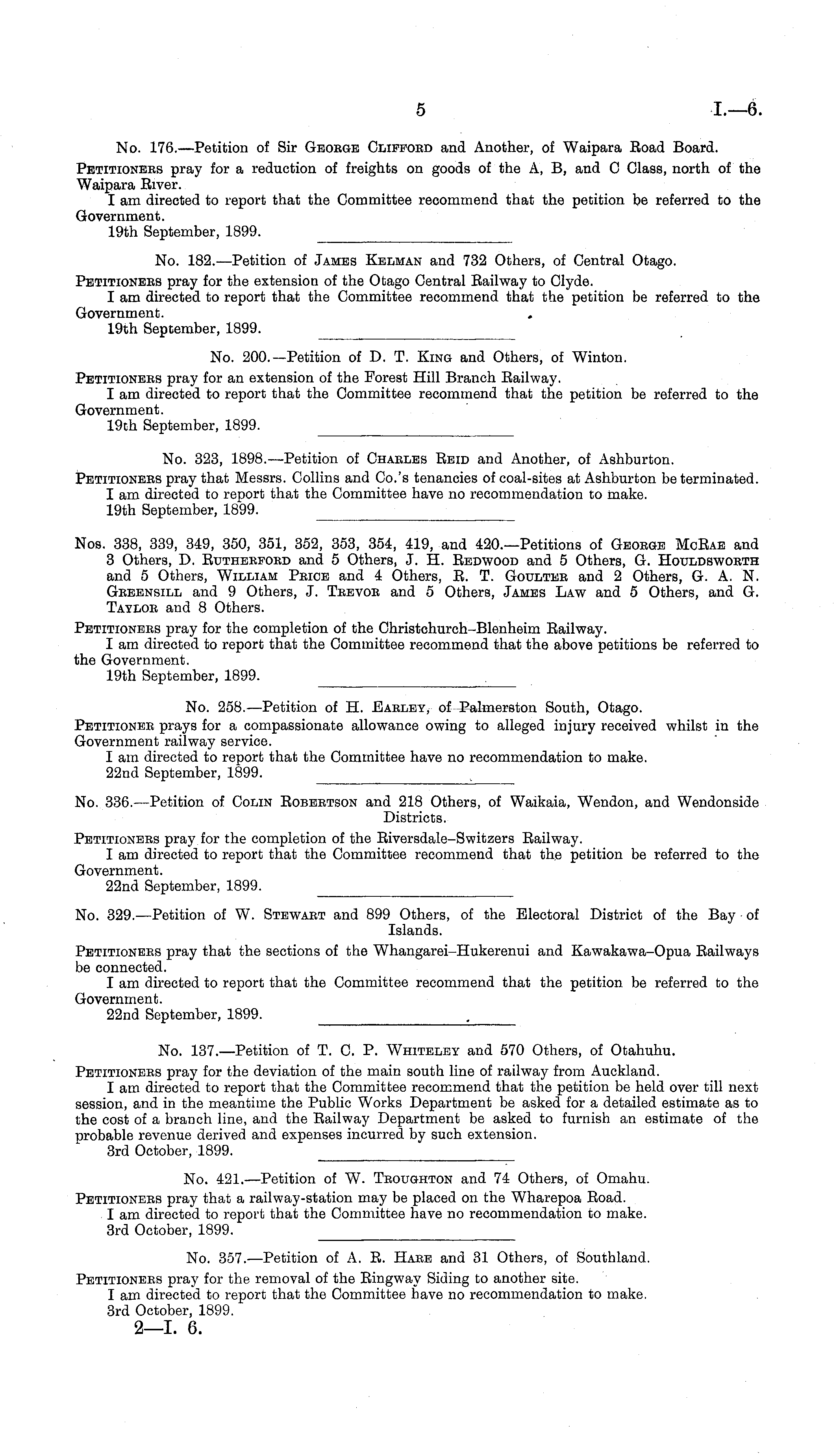 No. 137.—Petition of T. C. P. Whiteley and 570 Others, of Otahuhu. Petitioners pray for the deviation of the main south line of railway from Auckland. I am directed to report that the Committee recommend that the petition be held over till next session, and in the meantime the Public Works Department be asked for a detailed estimate as to the cost of a branch line, and the Railway Department be asked to furnish an estimate of the probable revenue derived and expenses incurred by such extension. 3rd October, 1899.