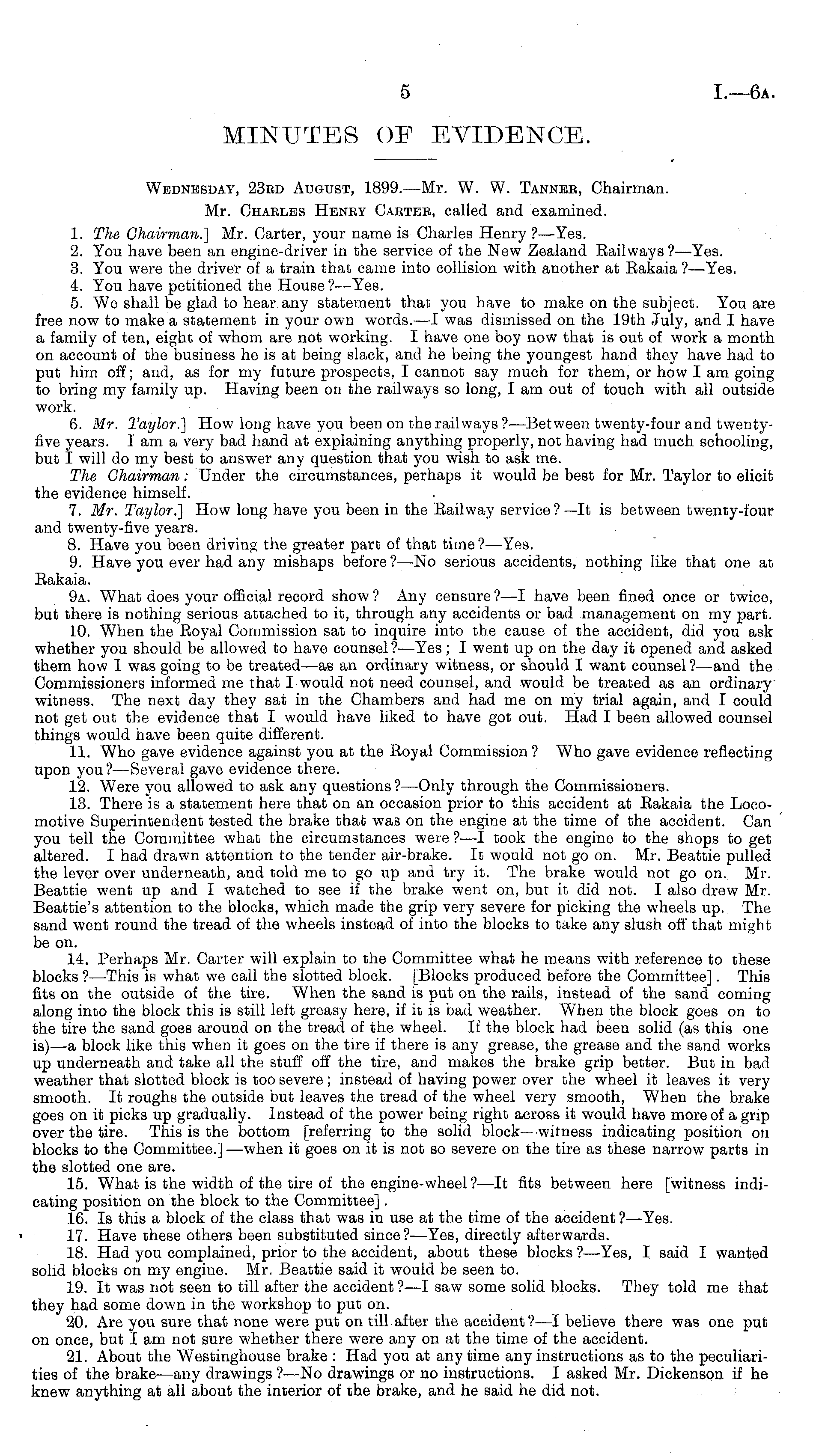 Wednesday, 23rd August, 1899.—Mr. W. W. Tanner, Chairman. Mr. Charles Henry Carter, called and examined. 1. The Chairman.] Mr. Carter, your name is Charles Henry?—-Yes. 2. You have been an engine-driver in the service of the New Zealand Bailways ?—Yes. 3. You were the driver of a train that came into collision with another at Bakaia?—Yes. 4. You have petitioned the House? —Yes. 5. We shall be glad to hear any statement that you have to make on the subject. You are free now to make a statement in your own words. —I was dismissed on the 19th July, and I have a family of ten, eight of whom are not working. I have one boy now that is out of work a month on account of the business he is at being slack, and he being the youngest hand they have had to put him off; and, as for my future prospects, I cannot say much for them, or how I am going to bring my family up. Having been on the railways so long, lam out of touch with all outside work. 6. Mr. Taylor.] How long have you been on the railways? —Between twenty-four and twentyfive years. lam a very bad hand at explaining anything properly, not having had much schooling, but I will do my best to answer any question that you wish to ask me. The Chairman: Under the circumstances, perhaps it would be best for Mr. Taylor to elicit the evidence himself. 7. Mr. Taylor.] How long have you been in the Bailway service?—lt is between twenty-four and twenty-five years. 8. Have you been driving the greater part of that time ?—Yes. 9. Have you ever had any mishaps before ?—No serious accidents, nothing like that one at Bakaia. 9a. What does your official record show ? Any censure ?—I have been fined once or twice, but there is nothing serious attached to it, through any accidents or bad management on my part. 10. When the Boyal Commission sat to inquire into the cause of the accident, did you ask whether you should be allowed to have counsel ?—Yes ; I went up on the day it opened and asked them how I was going to be treated—as an ordinary witness, or should I want counsel ?—and the Commissioners informed me that I would not need counsel, and would be treated as an ordinary witness. The next day they sat in the Chambers and had me on my trial again, and I could not get out the evidence that I would have liked to have got out. Had I been allowed counsel things would have been quite different. 11. Who gave evidence against you at the Boyal Commission? Who gave evidence reflecting upon you?— Several gave evidence there. 12. Were you allowed to ask any questions ?—Only through the Commissioners. 13. There is a statement here that on an occasion prior to this accident at Bakaia the Locomotive Superintendent tested the brake that was on the engine at the time of the accident. Can you tell the Committee what the circumstances were ? —I took the engine to the shops to get altered. I had drawn attention to the tender air-brake. It would not go on. Mr. Beattie pulled the lever over underneath, and told me to go up and try it. The brake would not go on. Mr. Beattie went up and I watched to see if the brake went on, but it did not. I also drew Mr. Beattie's attention to the blocks, which made the grip very severe for picking the wheels up. The sand went round the tread of the wheels instead of into the blocks to take any slush off that might be on. 14. Perhaps Mr. Carter will explain to the Committee what he means with reference to these blocks ?—This is what we call the slotted block. [Blocks produced before the Committee]. This fits on the outside of the tire. When the sand is put on the rails, instead of the sand coming along into the block this is still left greasy here, if it is bad weather. When the block goes on to the tire the sand goes around on the tread of the wheel. If the block had been solid (as this one is) —a block like this when it goes on the tire if there is any grease, the grease and the sand works up underneath and take all the stuff off the tire, and makes the brake grip better. But in bad weather that slotted block is too severe ; instead of having power over the wheel it leaves it very smooth. It roughs the outside but leaves the tread of the wheel very smooth, When the brake goes on it picks up gradually. Instead of the power being right across it would have more of a grip over the tire. This is the bottom [referring to the solid block—witness indicating position on blocks to the Committee.] —when it goes on it is not so severe on the tire as these narrow parts in the slotted one are. 15. What is the width of the tire of the engine-wheel ? —lt fits between here [witness indicating position on the block to the Committee]. 16. Is this a block of the class that was in use at the time of the accident ?—Yes. 17. Have these others been substituted since ?—Yes, directly afterwards. 18. Had you complained, prior to the accident, about these blocks ?—-Yes, I said I wanted solid blocks on my engine. Mr. Beattie said it would be seen to. 19. It was not seen to till after the accident ?—I saw some solid blocks. They told me that they had some down in the workshop to put on. 20. Are you sure that none were put on till after the accident ?—I believe there was one put on once, but I am not sure whether there were any on at the time of the accident. 21. About the Westinghouse brake : Had you at any time any instructions as to the peculiarities of the brake—any drawings ? —No drawings or no instructions. I asked Mr. Dickenson if he knew anything at all about the interior of the brake, and he said he did not.