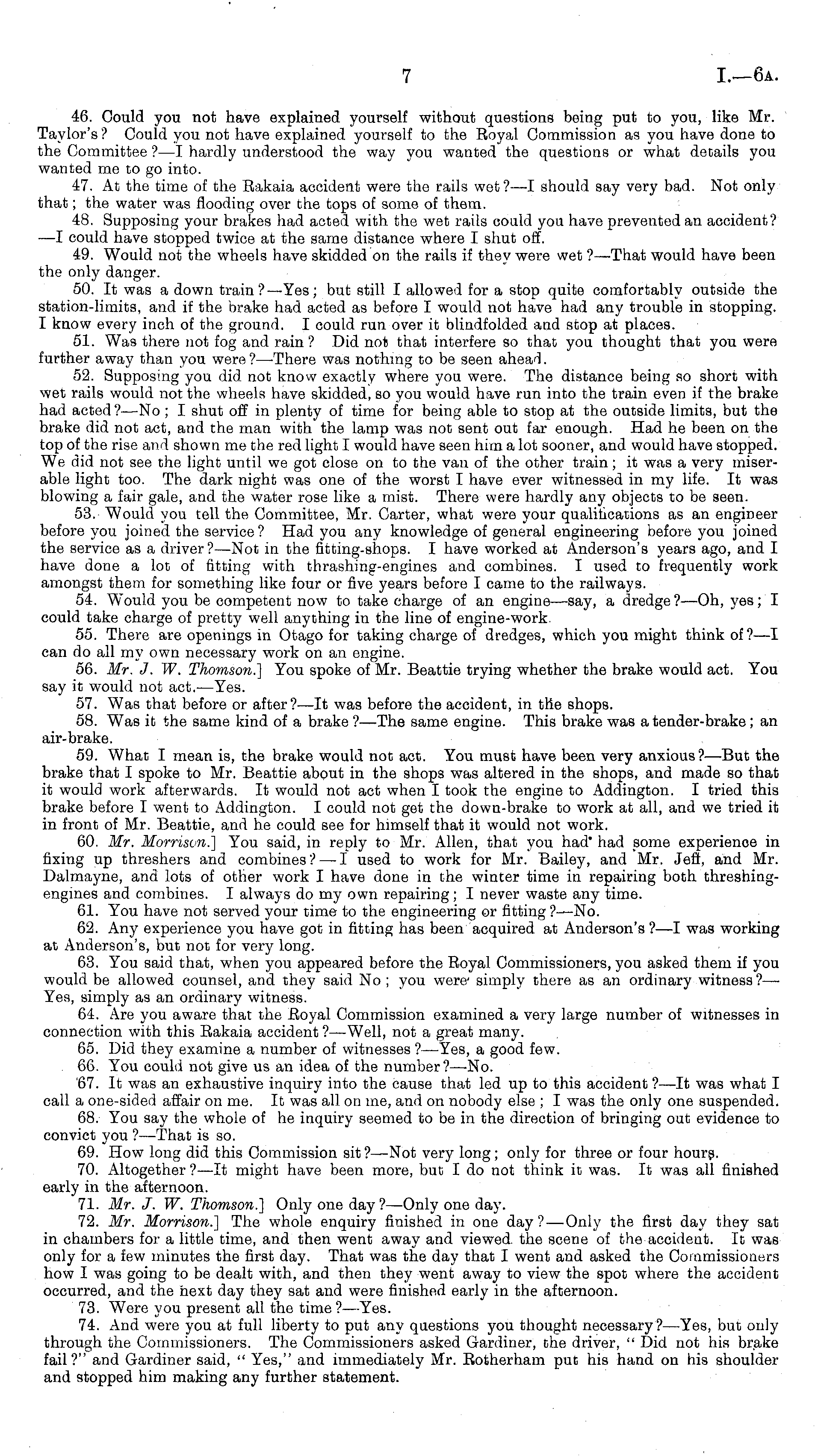 46. Could you not have explained yourself without questions being put to you, like Mr. Taylor's ? Could you not have explained yourself to the Boyal Commission as you have done to the Committee ? —I hardly understood the way you wanted the questions or what details you wanted me to go into. 47. At the time of the Bakaia accident were the rails wet? —-I should say very bad. Not only that; the water was flooding over the tops of some of them. 48. Supposing your brakes had acted with the wet rails could you have prevented an accident? —I could have stopped twice at the same distance where I shut off. 49. Would not the wheels have skidded on the rails if they were wet ?—-That would have been the only danger. 50. It was a down train ?—Yes; but still I allowed for a stop quite comfortably outside the station-limits, and if the brake had acted as before I would not have had any trouble in stopping. I know every inch of the ground. I could run over it blindfolded and stop at places. 51. Was there not fog and rain ? Did not that interfere so that you thought that you were further away than you were ?—-There was nothing to be seen ahead. 52. Supposing you did not know exactly where you were. The distance being so short with wet rails would not the wheels have skidded, so you would have run into the train even if the brake had acted?—No ; I shut off in plenty of time for being able to stop at the outside limits, but the brake did not act, and the man with the lamp was not sent out far enough. Had he been on the top of the rise and shown me the red light I would have seen him a lot sooner, and would have stopped. We did not see the light until we got close on to the van of the other train; it was a very miserable light too. The dark night was one of the worst I have ever witnessed in my life. It was blowing a fair gale, and the water rose like a mist. There were hardly any objects to be seen. 53. Would you tell the Committee, Mr. Garter, what were your qualifications as an engineer before you joined the service ? Had you any knowledge of general engineering before you joined the service as a driver?— Not in the fitting-shops. I have worked at Anderson's years ago, and I have done a lot of fitting with thrashing-engines and combines. I used to frequently work amongst them for something like four or five years before I came to the railways. 54. Would you be competent now to take charge of an engine—say, a dredge?—Oh, yes; I could take charge of pretty well anything in the line of engine-work 55. There are openings in Otago for taking charge of dredges, which you might think of? —I can do all my own necessary work on an engine. 56. Mr. J. W. Thomson.] You spoke of Mr. Beattie trying whether the brake would act. You say it would not act. —Yes. 57. Was that before or after?—J_t was before the accident, in the shops. 58. Was it the same kind of a brake ?—The same engine. This brake was a tender-brake ;an air-brake. 59. What I mean is, the brake would not act. You must have been very anxious?— But the brake that I spoke to Mr. Beattie about in the shops was altered in the shops, and made so that it would work afterwards. It would not act when I took the engine to Addington. I tried this brake before I went to Addington. I could not get the down-brake to work at all, and we tried it in front of Mr. Beattie, and he could see for himself that it would not work. 60. Mr. Morrison.] You said, in reply to Mr. Allen, that you had* had some experience in fixing up threshers and combines? — I used to work for Mr. Bailey, and Mr. Jeff, and Mr. Dalmayne, and lots of other work I have done in the winter time in repairing both threshingengines and combines. I always do my own repairing; I never waste any time. 61. You have not served your time to the engineering or fitting ? —No. 62. Any experience you have got in fitting has been acquired at Anderson's ?—I was working at Anderson's, but not for very long. 63. You said that, when you appeared before the Boyal Commissioners, you asked them if you would be allowed counsel, and they said No ; you were/ simply there as an ordinary witness ?— Yes, simply as an ordinary witness. 64. Are you aware that the Boyal Commission examined a very large number of witnesses in connection with this Bakaia accident ?—Well, not a great many. 65. Did they examine a number of witnesses ? —Yes, a good few. 66. You could not give us an idea of the number?—-No. '67. It was an exhaustive inquiry into the cause that led up to this accident ?—lt was what I call a one-sided affair on me. It was all on me, and on nobody else ; I was the only one suspended. 68. You say the whole of he inquiry seemed to be in the direction of bringing out evidence to convict you ?—That is so. 69. How long did this Commission sit ? —Not very long ; only for three or four hours. 70. Altogether ?—lt might have been more, but Ido not think it was. It was all finished early in the afternoon. 71. Mr. J. W. Thomson.] Only one day?— Only one day. 72. Mr. Morrison.] The whole enquiry finished in one day?— Only the first day they sat in chambers for a little time, and then went away and viewed, the scene of the accident. It was only for a few minutes the first day. That was the day that I went and asked the Commissioners how I was going to be dealt with, and then they went away to view the spot where the accident occurred, and the next day they sat and were finished early in the afternoon. 73. Were you present all the time ?—Yes. 74. And were you at full liberty to put any questions you thought necessary?— Yes, but only through the Commissioners. The Commissioners asked Gardiner, the driver, " Did not his brake fail?" and Gardiner said, " Yes," and immediately Mr. Botherham put his hand on his shoulder and stopped him making any further statement.