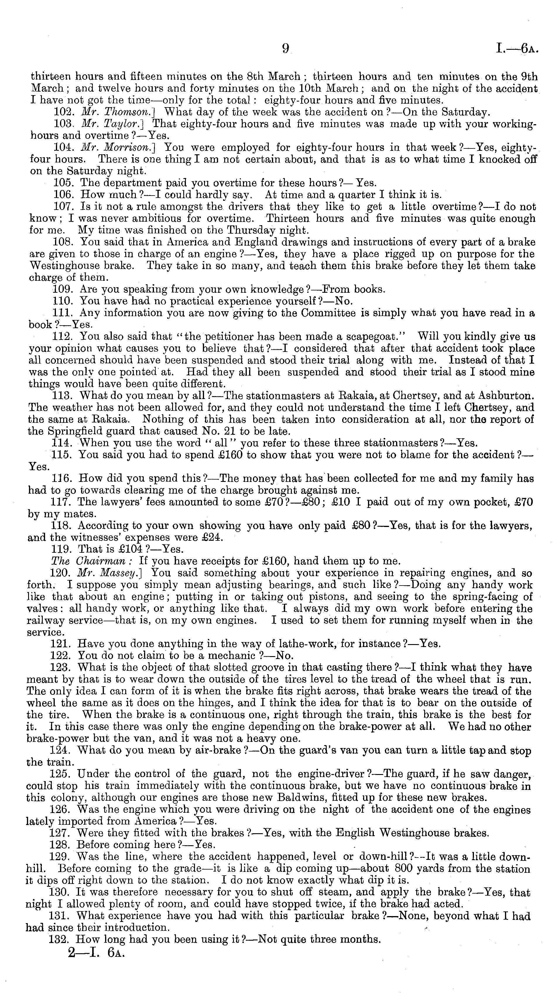 thirteen hours and fifteen minutes on the Bth March ; thirteen hours and ten minutes on the 9th March; and twelve hours and forty minutes on the 10th March; and on the night of the accident I have not got the time—only for the total: eighty-four hours and five minutes. 102. Mr. Thomson.] What day of the week was the accident on ?—On the Saturday. 103. Mr. Taylor.] That eighty-four hours and five minutes was made up with your workinghours and overtime ?—Yes. 104. Mr. Morrison.] You were employed for eighty-four hours in that week ?—Yes, eightyfour hours. There is one thing lam not certain about, and that is as to what time I knocked off on the Saturday night. 105. The department paid you overtime for these hours?— Yes. 106. How much? —I could hardly say. At time and a quarter I think it is. 107. Is it not a rule amongst the drivers that they like to get a little overtime?—l do not know ; I was never ambitious for overtime. Thirteen hours and five minutes was quite enough for me. My time was finished on the Thursday night. 108. You said that in America and England drawings and instructions of every part of a brake are given to those in charge of an engine ?—Yes, they have a place rigged up on purpose for the Westinghouse brake. They take in so many, and teach them this brake before they let them take charge of them. 109. Are you speaking from your own knowledge ?—From books. 110. You have had no practical experience yourself?— No. 111. Any information you are now giving to the Committee is simply what you have read in a book ?—Yes. 112. You also said that "the petitioner has been made a scapegoat." Will you kindly give us your opinion what causes you to believe that ?—I considered that after that accident took place all concerned should have been suspended and stood their trial along with me. Instead of that I was the only one pointed at. Had they all been suspended and stood their trial as I stood mine things would have been quite different. 113. What do you mean by all ?—The stationmasters at Bakaia, at Chertsey, and at Ashburton. The weather has not been allowed for, and they could not understand the time I left Chertsey, and the same at Bakaia. Nothing of this has been taken into consideration at all, nor the report of the Springfield guard that caused No. 21 to be late. 114. When you use the word " all " you refer to these three stationmasters ?—Yes. 115. You said you had to spend £160 to show that you were not to blame for the accident ? —■ Yes. 116. How did you spend this?— The money that has been collected for me and my family has had to go towards clearing me of the charge brought against me. 117. The lawyers' fees amounted to some £70 ? —£80; £10 I paid out of my own pocket, £70 by my mates. 118. According to your own showing you have only paid £80 ?—Yes, that is for the lawyers, and the witnesses' expenses were £24. 119. That is £104 ?—Yes. The Chairman : If you have receipts for £160, hand them up to me. 120. Mr. Massey.] You said something about your experience in repairing engines, and so forth. I suppose you simply mean adjusting bearings, and such like ?—Doing any handy work like that about an engine; putting in or taking out pistons, and seeing to the spring-facing of valves: all handy work, or anything like that. I always did my own work before entering the railway service—that is, on my own engines. I used to set them for running myself when in the service. 121. Have you done anything in the way of lathe-work, for instance ? —Yes. 122. You do not claim to be a mechanic ?—No. 123. What is the object of that slotted groove in that casting there ? —I think what they have meant by that is to wear down the outside of the tires level to the tread of the wheel that is run. The only idea I can form of it is when the brake fits right across, that brake wears the tread of the wheel the same as it does on the hinges, and I think the idea for that is to bear on the outside of the tire. When the brake is a continuous one, right through the train, this brake is the best for it. In this case there was only the engine depending on the brake-power at all. We had no other brake-power but the van, and it was not a heavy one. 124. What do you mean by air-brake ?—On the guard's van you can turn a little tap and stop the train. 125. Under the control of the guard, not the engine-driver?— The guard, if he saw danger, could stop his train immediately with the continuous brake, but we have no continuous brake in this colony, although our engines are those new Baldwins, fitted up for these new brakes. 126. Was the engine which you were driving on the night of the accident one of the engines lately imported from America ?—Yes. 127. Were they fitted with the brakes ?—Yes, with the English Westinghouse brakes. 128. Before coming here ?—Yes. 129. Was the line, where the accident happened, level or down-hill?—lt was a little downhill. Before coming to the grade—it is like a dip coming up—about 800 yards from the station it dips off right down to the station. Ido not know exactly what dip it is. 130. It was therefore necessary for you to shut off steam, and apply the brake?— Yes, that night I allowed plenty of room, and could have stopped twice, if the brake had acted. 131. What experience have you had with this particular brake ?—None, beyond what I had had since their introduction. 132. How long had you been using it ? —Not quite three months. 2—l. 6a.