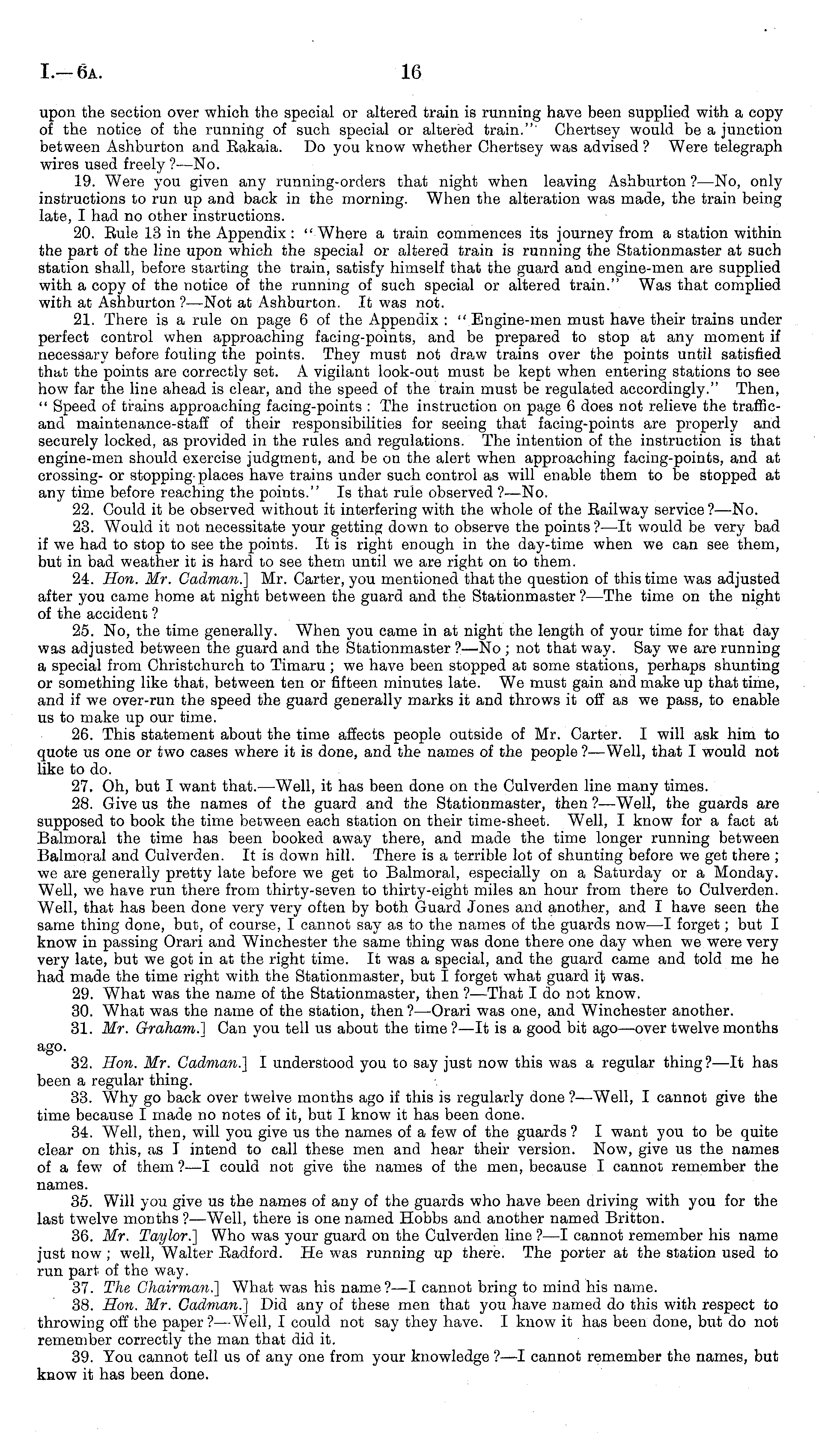 upon the section over which the special or altered train is running have been supplied with a copy of the notice of the running of such special or altered train." Chertsey would be a junction between Ashburton and Bakaia. Do you know whether Chertsey was advised ? Were telegraph wires used freely?— No. 19. Were you given any running-orders that night when leaving Ashburton ?—No, only instructions to run up and back in the morning. When the alteration was made, the train being late, I had no other instructions. 20. Bule 13 in the Appendix : " Where a train commences its journey from a station within the part of the line upon which the special or altered train is running the Stationmaster at such station shall, before starting the train, satisfy himself that the guard and engine-men are supplied with a copy of the notice of the running of such special or altered train." Was that complied with at Ashburton ? —Not at Ashburton. It was not. 21. There is a rule on page 6 of the Appendix : " Engine-men must have their trains under perfect control when approaching facing-points, and be prepared to stop at any moment if necessary before fouling the points. They must not draw trains over the points until satisfied that the points are correctly set. A vigilant look-out must be kept when entering stations to see how far the line ahead is clear, and the speed of the train must be regulated accordingly." Then, " Speed of trains approaching facing-points : The instruction on page 6 does not relieve the trafficand maintenance-staff of their responsibilities for seeing that facing-points are properly and securely locked, as provided in the rules and regulations. The intention of the instruction is that engine-men should exercise judgment, and be on the alert when approaching facing-points, and at crossing- or stopping-places have trains under such control as will enable them to be stopped at any time before reaching the points." Is that rule observed ?—No. 22. Could it be observed without it interfering with the whole of the Bailway service ? —No. 23. Would it not necessitate your getting down to observe the points ?—lt would be very bad if we had to stop to see the points. It is right enough in the day-time when we can see them, but in bad weather it is hard to see them until we are right on to them. 24. Hon. Mr. Cadman.] Mr. Carter, you mentioned that the question of this time was adjusted after you came home at night between the guard and the Stationmaster ? —The time on the night of the accident ? 25. No, the time generally. When you came in at night the length of your time for that day was adjusted between the guard and the Stationmaster ?—No ; not that way. Say we are running a special from Christchurch to Timaru ; we have been stopped at some stations, perhaps shunting or something like that, between ten or fifteen minutes late. We must gain and make up that time, and if we over-run the speed the guard generally marks it and throws it off as we pass, to enable us to make up our time. 26. This statement about the time affects people outside of Mr. Carter. I will ask him to quote us one or two cases where it is done, and the names of the people ?—Well, that I would not like to do. 27. Oh, but I want that.—Well, it has been done on the Culverden line many times. 28. Give us the names of the guard and the Stationmaster, then ?—Well, the guards are supposed to book the time between each station on their time-sheet. Well, I know for a fact at Balmoral the time has been booked away there, and made the time longer running between Balmoral and Culverden. It is down hill. There is a terrible lot of shunting before we get there ; we are generally pretty late before we get to Balmoral, especially on a Saturday or a Monday. Well, we have run there from thirty-seven to thirty-eight miles an hour from there to Culverden. Well, that has been done very very often by both Guard Jones and another, and I have seen the same thing done, but, of course, I cannot say as to the names of the guards now —I forget; but I know in passing Orari and Winchester the same thing was done there one day when we were very very late, but we got in at the right time. It was a special, and the guard came and told me he had made the time right with the Stationmaster, but I forget what guard it was. 29. What was the name of the Stationmaster, then ?—That I do not know. 30. What was the name of the station, then ?—Orari was one, and Winchester another. 31. Mr. Graham.] Can you tell us about the time?—lt is a good bit ago —over twelvemonths ago. 32. Hon. Mr. Cadman.] I understood you to say just now this was a regular thing?—lt has been a regular thing. 33. Why go back over twelve months ago if this is regularly done ? —Well, I cannot give the time because I made no notes of it, but I know it has been done. 34. Well, then, will you give us the names of a few of the guards ? I want you to be quite clear on this, as I intend to call these men and hear their version. Now, give us the names of a few of them ?—I could not give the names of the men, because I cannot remember the names. 35. Will you give us the names of any of the guards who have been driving with you for the last twelve months ? —Well, there is one named Hobbs and another named Britton. 36. Mr. Taylor.] Who was your guard on the Culverden line ? —I cannot remember his name just now ; well, Walter Badford. He was running up there. The porter at the station used to run part of the way. 37. The Chairman.] What was his name?—l cannot bring to mind his name. 38. Hon. Mr. Cadman.] Did any of these men that you have named do this with respect to throwing off the paper?— Well, I could not say they have. I know it has been done, but do not remember correctly the man that did it. 39. You cannot tell us of any one from your knowledge ?—I cannot remember the names, but know it has been done.