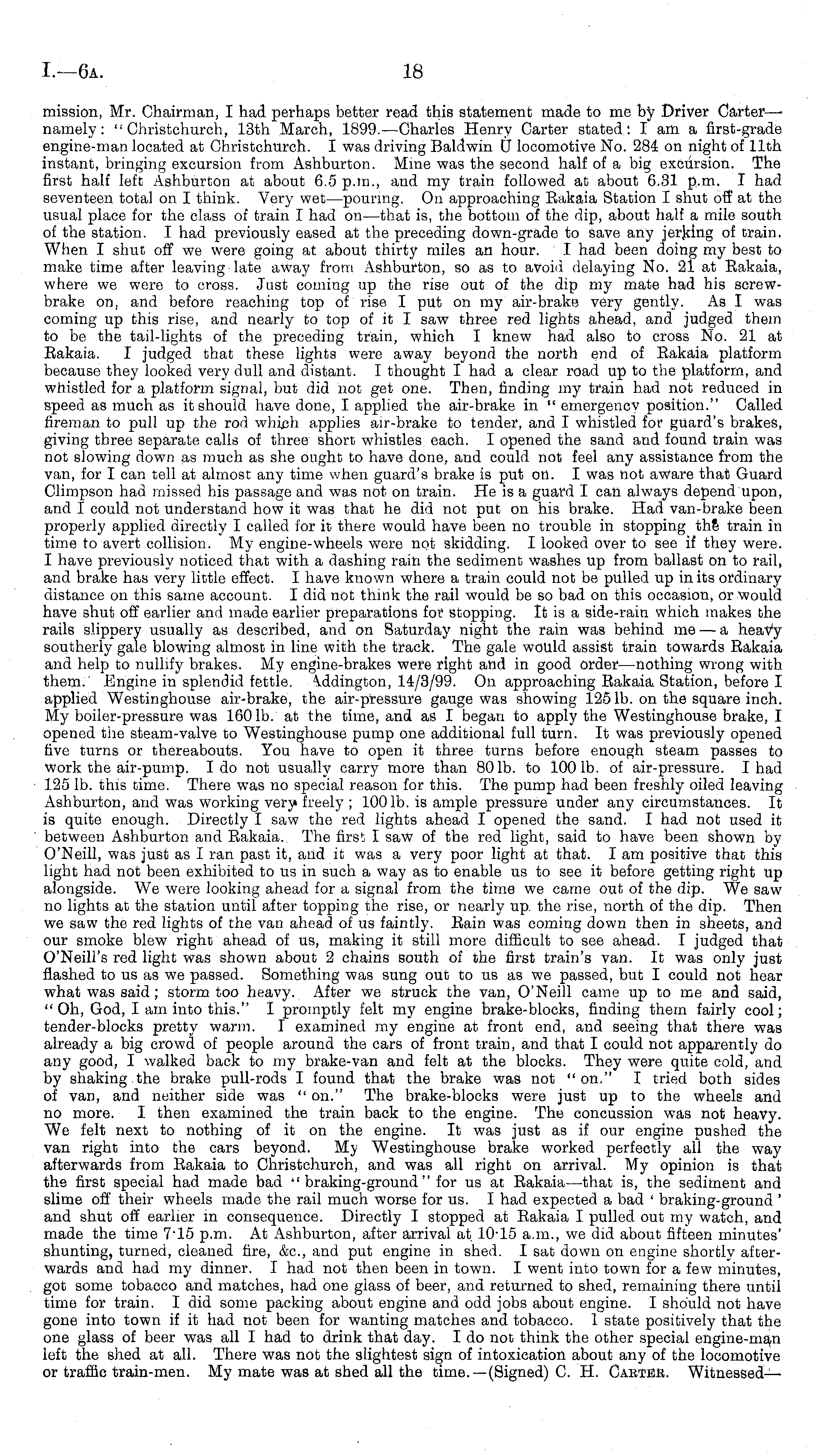 mission, Mr. Chairman, I had perhaps better read this statement made to me by Driver Carter—■ namely: "Christchurch, 13th March, 1899.—Charles Henry Carter stated: I am a first-grade engine-man located at Christchurch. I was driving Baldwin D locomotive No. 284 on night of 11th instant, bringing excursion from Ashburton. Mine was the second half of a big excursion. The first half left Ashburton at about 6.5 p.m., and my train followed at about 6.31 p.m. I had seventeen total on I think. Very wet—pouring. On approaching Rakaia Station I shut off at the usual place for the class of train I had on —that is, the bottom of the dip, about half a mile south of the station. I had previously eased at the preceding down-grade to save any jerking of train. When I shut off we were going at about thirty miles an hour. I had been doing my best to make time after leaving late away from Ashburton, so as to avoid delaying No. 21 at Rakaia, where we were to cross. Just coming up the rise out of the dip my mate had his screwbrake on, and before reaching top of rise I put on my air-brake very gently. As I was coming up this rise, and nearly to top of it I saw three red lights ahead, and judged them to be the tail-lights of the preceding train, which I knew had also to cross No. 21 at Rakaia. I judged that these lights were away beyond the north end of Rakaia platform because they looked very dull and distant. I thought I had a clear road up to the platform, and whistled for a platform signal, but did not get one. Then, finding my train had not reduced in speed as much as it should have done, I applied the air-brake in " emergency position." Called fireman to pull up the rod which applies air-brake to tender, and I whistled for guard's brakes, giving three separate calls of three short whistles each. I opened the sand and found train was not slowing down as much as she ought to have done, and could not feel any assistance from the van, for I can tell at almost any time when guard's brake is put on. I was not aware that Guard Climpson had missed his passage and was not on train. He is a guard I can always depend upon, and I could not understand how it was that he did not put on his brake. Had van-brake been properly applied directly I called for it there would have been no trouble in stopping the train in time to avert collision. My engine-wheels were not skidding. I looked over to see if they were. I have previously noticed that with a dashing rain the sediment washes up from ballast on to rail, and brake has very little effect. I have known where a train could not be pulled up in its ordinary distance on this same account. I did not think the rail would be so bad on this occasion, or would have shut off earlier and made earlier preparations for stopping. It is a side-rain which makes the rails slippery usually as described, and on Saturday night the rain was behind me — a heavy southerly gale blowing almost in line with the track. The gale would assist train towards Rakaia and help to nullify brakes. My engine-brakes were right and in good order —nothing wrong with them.' Engine in splendid fettle, \ddington, 14/3/99. On approaching Rakaia Station, before I applied Westinghouse air-brake, the air-pressure gauge was showing 125 lb. on the square inch. My boiler-pressure was 160 lb. at the time, and as I began to apply the Westinghouse brake, I opened the steam-valve to Westinghouse pump one additional full turn. It was previously opened five turns or thereabouts. You have to open it three turns before enough steam passes to work the air-pump. Ido not usually carry more than 801b. to 1001b. of air-pressure. I had 125 lb. this time. There was no special reason for this. The pump had been freshly oiled leaving Ashburton, and was working very- freely ; 1001b. is ample pressure under any circumstances. It is quite enough. Directly I saw the red lights ahead I opened the sand. I had not used it between Ashburton and Rakaia. The first I saw of the red light, said to have been shown by O'Neill, was just as I ran past it, and it was a very poor light at that. lam positive that this light had not been exhibited to us in such a way as to enable us to see it before getting right up alongside. We were looking ahead for a signal from the time we came out of the dip. We saw no lights at the station until after topping the rise, or nearly up. the rise, north of the dip. Then we saw the red lights of the van ahead of us faintly. Rain was coming down then in sheets, and our smoke blew right ahead of us, making it still more difficult to see ahead. I judged that O'Neill's red light was shown about 2 chains south of the first train's van. It was only just flashed to us as we passed. Something was sung out to us as we passed, but I could not hear what was said ; storm too heavy. After we struck the van, O'Neill came up to me and said, "Oh, God, lam into this." I promptly felt my engine brake-blocks, finding them fairly cool; tender-blocks pretty warm. I examined my engine at front end, and seeing that there was already a big crowd of people around the cars of front train, and that I could not apparently do any good, I walked back to my brake-van and felt at the blocks. They were quite cold, and by shaking the brake pull-rods I found that the brake was not "on." I tried both sides of van, and neither side was " on." The brake-blocks were just up to the wheels and no more. I then examined the train back to the engine. The concussion was not heavy. We felt next to nothing of it on the engine. It was just as if our engine pushed the van right into the cars beyond. My Westinghouse brake worked perfectly all the way afterwards from Rakaia to Christchurch, and was all right on arrival. My opinion is that the first special had made bad "braking-ground" for us at Rakaia—that is, the sediment and slime off their wheels made the rail much worse for us. I had expected a bad ' braking-ground ' and shut off earlier m consequen