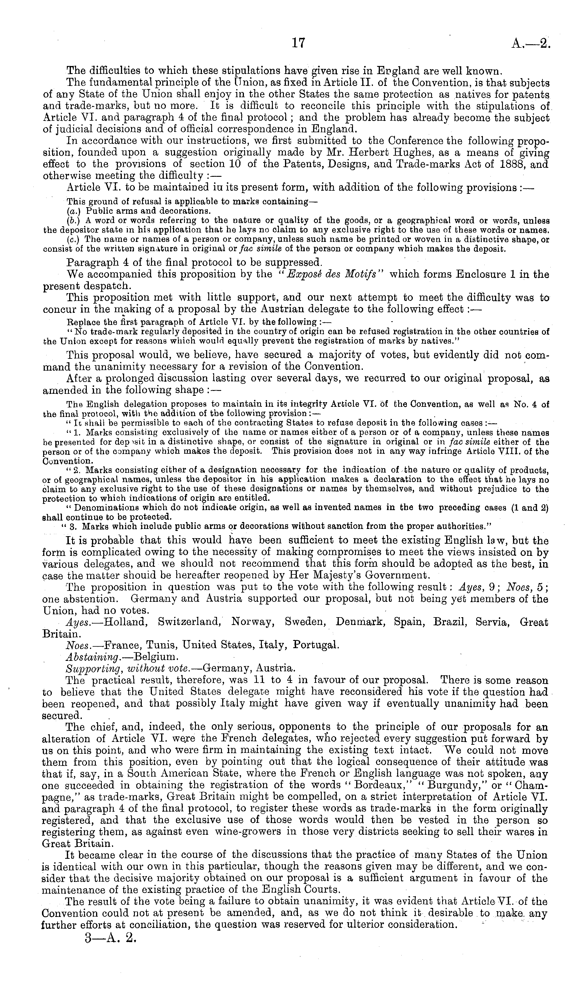 The difficulties to which these stipulations have given rise in England are well known. The fundamental principle of the Union, as fixed in Article 11. of the Convention, is that subjects of any State of the Union shall enjoy in the other States the same protection as natives for patents and trade-marks, but no more. It is difficult to reconcile this principle with the stipulations of Article VI. and paragraph 4of the final protocol; and the problem has already become the subject of judicial decisions and of official correspondence in England. In accordance with our instructions, we first submitted to the Conference the following proposition, founded upon a suggestion originally made by Mr. Herbert Hughes, as a means of giving effect to the provisions of section 10 of the Patents, Designs, and Trade-marks Act of 1888, and otherwise meeting the difficulty : — Article VI. to be maintained iv its present form, with addition of the following provisions :—■ This ground of refusal is applicable to marks containing— (a.) Public arms and decorations. (b.) A word or words referring to the nature or quality of the goods, or a geographical word or words, unless the depositor state in hh application that he lays no claim to any exclusive right to the use of these words or names. (c.) The name or names of a person or company, unless such name be printed or woven in a distinctive shape, or consist of the written signature in original or fac simile of the person or company whioh makes the deposit. Paragraph 4 of the final protocol to be suppressed. We accompanied this proposition by the " JExposS dcs Motifs" which forms Enclosure 1 in the present despatch. This proposition met with little support, and our next attempt to meet the difficulty was to concur in the making of a proposal by the Austrian delegate to the following effect : — Replace the first paragraph of Article VI. by the following : — " No trade-mark regularly deposited in the country of origin can be refused registration in the other countries of the Union except for reasons which would equally prevent the registration of marks by natives." This proposal would, we believe, have secured a majority of votes, but evidently did not command the unanimity necessary for a revision of the Convention. After a prolonged discussion lasting over several days, we recurred to our original proposal, as amended in the following shape : — The English delegation proposes to maintain in its integrity Article VI. of the Convention, as well as No. 4 of the final protocol, with the addition of the following provision:— " It shall be permissible to sach of the contracting States to refuse deposit in the following cases : — " 1. Marks consisting exclusively of the name or names either of a person or of a company, unless these names be presented for dep isit in a distinctive shape, ov consist of the signature in original or in fac simile either of the person or of the CDmpany which makes the deposit. This provision does not in any way infringe Article VIII. of the Convention. " 2. Marks consisting either of a designation neoessary for the indication of the nature or quality of products, or of geographical names, unless the depositor in his application makes a declaration to the effect that he lays no claim to any exclusive right to the use of these designations or names by themselves, and without prejudice to the protection to which indications of origin are entitled. " Denominations which do not indicate origin, as well as invented names in the two preceding cases (1 and 2) shall continue to be protected. " 3. Marks which inolude public arms or deoorations without sanction from the proper authorities." It is probable that this would have been sufficient to meet the existing English law, but the form is complicated owing to the necessity of making compromises to meet the views insisted on by various delegates, and we should not recommend that this form should be adopted as the best, in case the matter shouid be hereafter reopened by Her Majesty's Government. The proposition in question was put to the vote with the following result: Ayes, 9; Noes, 5; one abstention. Germany and Austria supported our proposal, but not being yet members of the Union, had no votes. Ayes. —Holland, Switzerland, Norway, Sweden, Denmark, Spain, Brazil, Servia, Great Britain. Noes. —France, Tunis, United States, Italy, Portugal. Abstaining. —Belgium. Supporting , without vote. —Germany, Austria. The practical result, therefore, was 11 to 4in favour of our proposal. There is some reason to believe that the United States delegate might have reconsidered his vote if the question had been reopened, and that possibly Italy might have given way if eventually unanimity had been secured. The chief, and, indeed, the only serious, opponents to the principle of our proposals for an alteration of Article VI. weje the French delegates, who rejected every suggestion put forward by us on this point, and who were firm in maintaining the existing text intact. We could not move them from this position, even by pointing out that the logical consequence of their attitude was that if, say, in a South American State, where the French or English language was not spoken, any one succeeded in obtaining the registration of the words " Bordeaux," " Burgundy," or " Champagne," as trade-marks, Great Britain might be compelled, on a strict interpretation of Article VI. and paragraph 4 of the final protocol, to register these words as trade-marks in the form originally registered, and that the exclusive use of those words would then be vested in the person so registering them, as against even wine-growers in those very districts seeking to sell their wares in Great Britain. It became clear in the course of the discussions that the practice of many States of the Union is identical with our own in this particular, though the reasons given may be different, and we consider that the decisive major