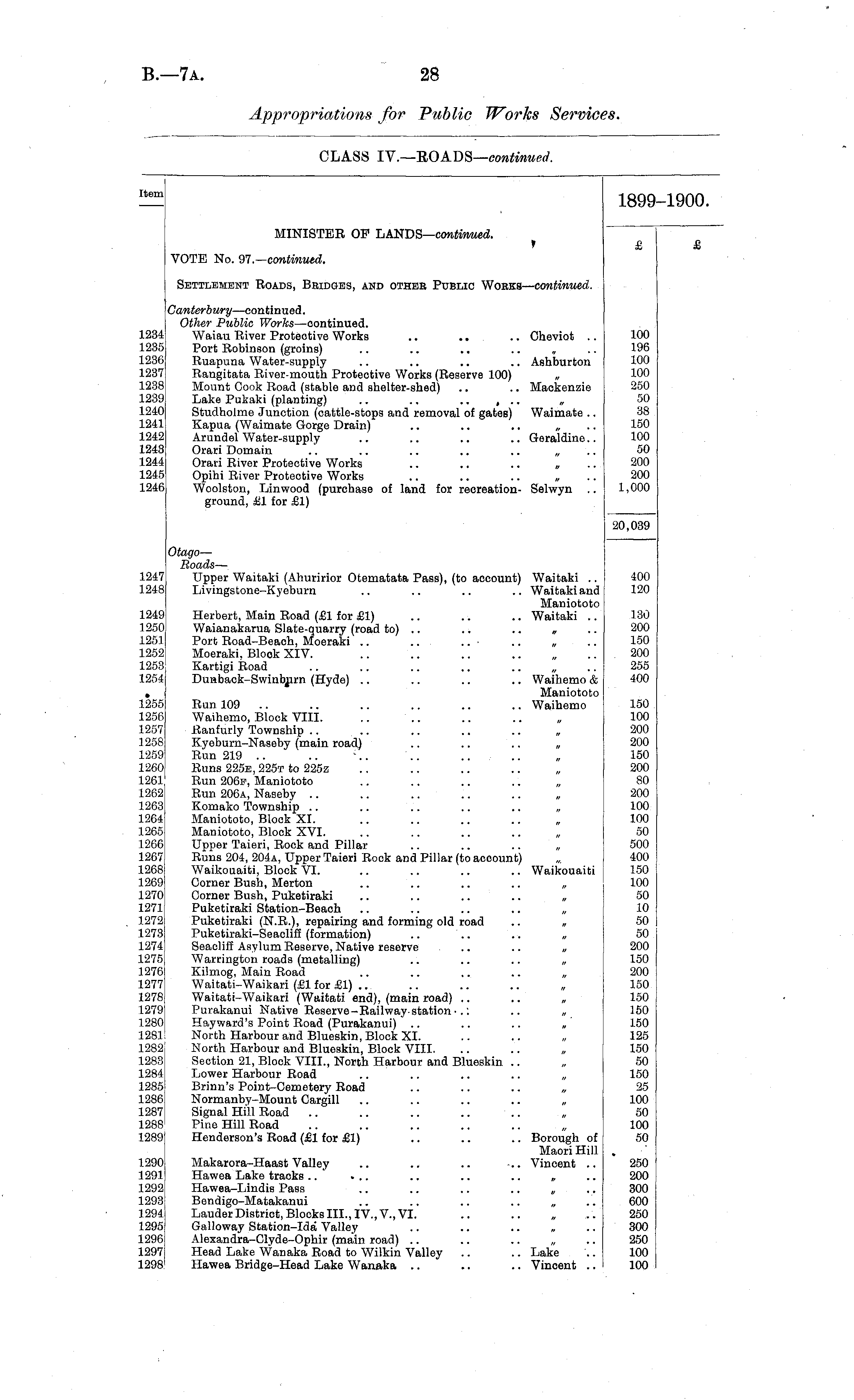 Ltem 1899-1900. MINISTER OF LANDS— continued. » VOTE No. 97.— continued. Settlement Roads, Bridges, and other Public Wohks— continued. 1234 1235 1236 1237 1238 1239 1240 1241 1242 1243 1244 1245 1246 Canterbury —continued. Other Public Works —oontinued. Waiau Biver Protective Works .. .. .. Cheviot .. Port Robinson (groins) .. .. .. .. „ Ruapuna Water-supply .. .. .. .. Ashburton Rangitata River-mouth Protective Works (Reserve 100) „ Mount Cook Road (stable and shelter-shed) .. .. Mackenzie Lake Pukaki (planting) .. .. .. ... „ Studholme Junction (cattle-stops and removal of gates) Waimate .. Kapua (Waimate Gorge Drain) .. .. .. „ Arundel Water-supply .. .. .. .. Geraldine.. Orari Domain .. .. .. .. .. „ Orari River Protective Works .. .. .. „ Opihi River Protective Works .. .. .. „ Woolston, Linwood (purchase of land for recreation- Selwyn ground, £1 for £1) 100 196 100 100 250 50 38 150 100 50 200 200 1,000 20,039 1247 1248 1249 1250 1251 1252 1253 1254 1255 1256 1257 1258 1259 1260 1261! 1262 1263! 1264J 1265 1266 1267 1268. 1269 1270 1271; 12721 1273 1274 1275J 1276! 1277J 1278: 1279 1280 1281 1282, 1283 1284 1285 1 1286 1287 1288 1 1289 Otago — Roads — Upper Waitaki (Ahuririor Otematata Pass), (to account) Waitaki .. Livingstone-Kyeburn .. .. .. .. Waitaki and Maniototo Herbert, Main Road (£1 for £1) .. .. .. Waitaki .. Waianakarua Slate-quarry (road to) .. .. .. „ Port Road-Beach, Moeraki .. .. .. ■ Moeraki, Blook XIV. Kartigi Road .. .. .. .. .. „ Dunback-Swinbjirn (Hyde) .. .. .. .. Waihemo & Maniototo Run 109 .. .. .. .. .. Waihemo Waihemo, Block VIII. Ranfurly Township .. .. .. .. .. „ Kyebum-Naseby (main road) .. .. .. „ Run 219 .. Runs 225e,225t to 225z Run 206f, Maniototo Run 206a, Naseby Komako Township .. .. .. .. .. „ Maniototo, Block XI. Maniototo, Block XVI. Upper Taieri, Rock and Pillar .. .. .. „ Runs 204, 204a, Upper Taieri Rock and Pillar (to account) Waikouaiti, Block VI. .. .. .. .. Waikouaiti Corner Bush, Merton .. .. .. .. „ Corner Bush, Puketiraki .. .. .. .. „ Puketiraki Station-Beach .. .. .. .. „ Puketiraki (N.R.), repairing and forming old road .. „ Puketiraki-Seaclifi (formation) Seacliff Asylum Reserve, Native reserve .. .. „ Warrington roads (metalling) .. .. .. „ Kilmog, Main Road Waitati-Waikari (£1 for £1) .. Waitati-Waikari (Waitati end), (main road) Purakanui Native Reserve-Railwaystation-.. Hay ward's Point Road (Purakanui) .. North Harbour and Blueskin, Block XI. .. .. „ North Harbour and Blueskin, Block VIII. .. .. „ Section 21, Block VIII., North Harbour and Blueskin .. Lower Harbour Road .. .. .. .. „ Brinn's Point-Cemetery Road Normanby-Mount Cargill .. .. .. .. „ Signal Hill Road Pine Hill Road Henderson's Road (£1 for £1) .. .. .. Borough of Maori Hill Makarora-Haast Valley .. .. .. -.. Vincent .. Hawea Lake tracks .. ... .. .. .. „ Hawea-Lindis Pass .. .. .. .. „ Bendigo-Matakanui Lauder District, Blocks III., IV., V., VI. Galloway Station-Ida Valley .. .. .. „ Alexandra-Clyde-Ophir (main road) .. .. .. „ Head Lake Wanaka Road to Wilkin Valley .. .. Lake Hawea Bridge-Head Lake Wanaka .. .. .. Vincent .. 400 120 130 200 150 200 255 400 150 100 200 200 150 200 80 200 100 100 50 500 400 150 100 50 10 50 50 200 150 200 150 150 150 150 125 150 50 150 25 100 50 100 50 1290! 1291! 1292j 12931 1294: 1295 ; 1296J 1297 ! 1298 j 250 200 300 600 250 300 250 100 100