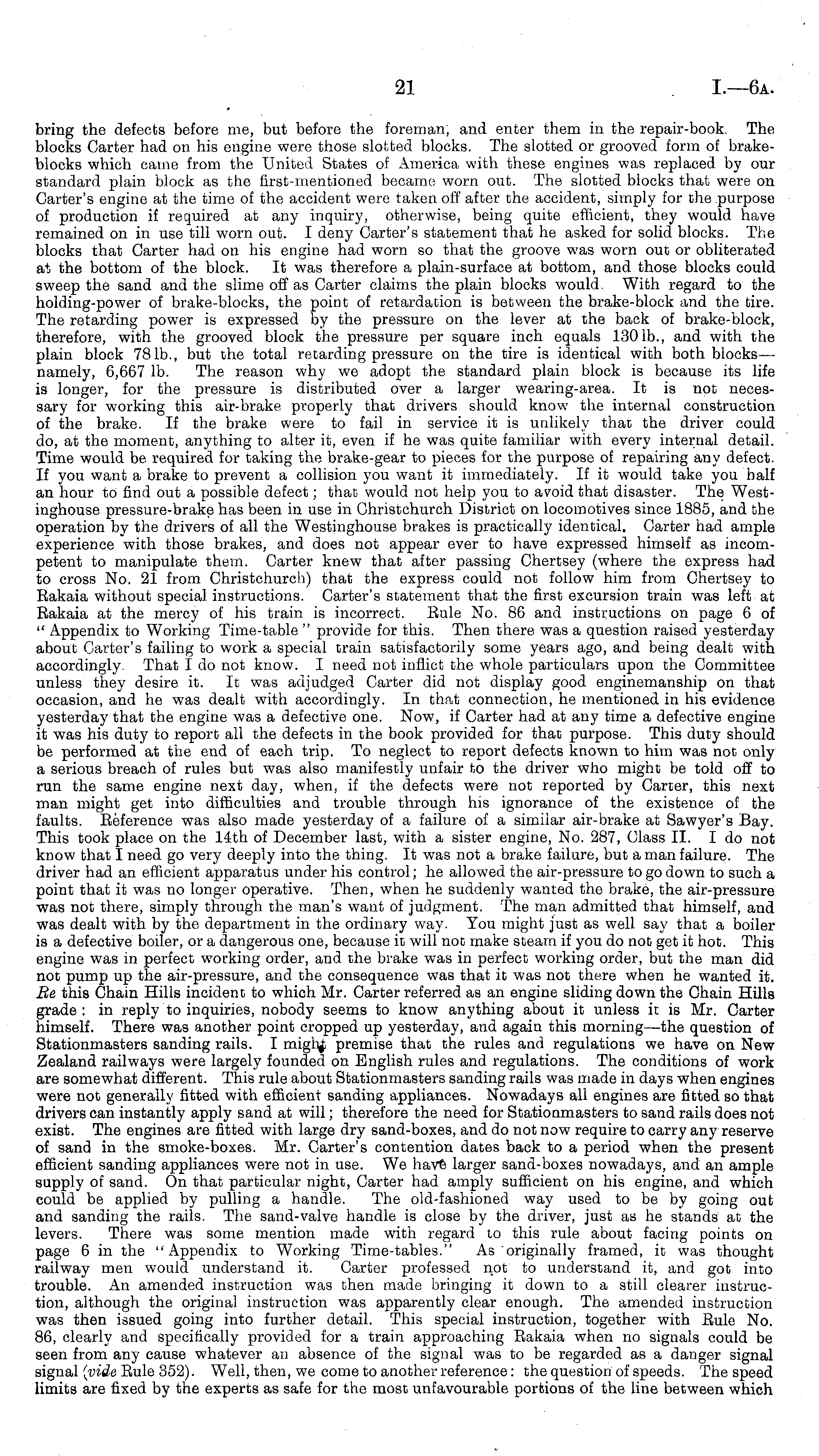 bring the defects before me, but before the foreman, and enter them in the repair-book. The blocks Carter had on his engine were those slotted blocks. The slotted or grooved form of brakeblocks which came from the United States of America with these engines was replaced by our standard plain block as the first-mentioned became worn out. The slotted blocks that were on Carter's engine at the time of the accident were taken off after the accident, simply for the purpose of production if required at any inquiry, otherwise, being quite efficient, they would have remained on in use till worn out. I deny Carter's statement that he asked for solid blocks. The blocks that Carter had on his engine had worn so that the groove was worn out or obliterated at the bottom of the block. It was therefore a plain-surface at bottom, and those blocks could sweep the sand and the slime off as Carter claims the plain blocks would. With regard to the holding-power of brake-blocks, the point of retardation is between the brake-block and the tire. The retarding power is expressed by the pressure on the lever at the back of brake-block, therefore, with the grooved block the pressure per square inch equals 1301b., and with the plain block 781b., but the total retarding pressure on the tire is identical with both blocks— namely, 6,667 lb. The reason why we adopt the standard plain block is because its life is longer, for the pressure is distributed over a larger wearing-area. It is not necessary for working this air-brake properly that drivers should know the internal construction of the brake. If the brake were to fail in service it is unlikely that the driver could do, at the moment, anything to alter it, even if he was quite familiar with every internal detail. Time would be required for taking the brake-gear to pieces for the purpose of repairing any defect. If you want a brake to prevent a collision you want it immediately. If it would take you half an hour to find out a possible defect; that would not help you to avoid that disaster. The Westinghouse pressure-brake has been in use in Christchurch District on locomotives since 1885, and the operation by the drivers of all the Westinghouse brakes is practically identical. Carter had ample experience with those brakes, and does not appear ever to have expressed himself as incompetent to manipulate them. Carter knew that after passing Chertsey (where the express had to cross No. 21 from Christchurch) that the express could not follow him from Chertsey to Bakaia without special instructions. Carter's statement that the first excursion train was left at Bakaia at the mercy of his train is incorrect. Rule No. 86 and instructions on page 6of " Appendix to Working Time-table " provide for this. Then there was a question raised yesterday about Carter's failing to work a special train satisfactorily some years ago, and being dealt with accordingly. That Ido not know. I need not inflict the whole particulars upon the Committee unless they desire it. It was adjudged Carter did not display good enginemanship on that occasion, and he was dealt with accordingly. In that connection, he mentioned in his evidence yesterday that the engine was a defective one. Now, if Carter had at any time a defective engine it was his duty to report all the defects in the book provided for that purpose. This duty should be performed at the end of each trip. To neglect to report defects known to him was not only a serious breach of rules but was also manifestly unfair to the driver who might be told off to run the same engine next day, when, if the defects were not reported by Carter, this next man might get into difficulties and trouble through his ignorance of the existence of the faults. Reference was also made yesterday of a failure of a similar air-brake at Sawyer's Bay. This took place on the 14th of December last, with a sister engine, No. 287, Class 11. Ido not know that I need go very deeply into the thing. It was not a brake failure, but a man failure. The driver had an efficient apparatus under his control; he allowed the air-pressure to go down to such a point that it was no longer operative. Then, when he suddenly wanted the brake, the air-pressure was not there, simply through the man's want of judgment. The man admitted that himself, and was dealt with by the department in the ordinary way. You might just as well say that a boiler is a defective boiler, or a dangerous one, because it will not make steam if you do not get it hot. This engine was in perfect working order, and the brake was in perfect working order, but the man did not pump up the air-pressure, and the consequence was that it was not there when he wanted it. Be this Chain Hills incident to which Mr. Carter referred as an engine sliding down the Chain Hills grade : in reply to inquiries, nobody seems to know anything about it unless it is Mr. Carter himself. There was another point cropped up yesterday, and again this morning—the question of Stationmasters sanding rails. I migh| premise that the rules and regulations we have on New Zealand railways were largely founded on English rules and regulations. The conditions of work are somewhat different. This rule about Stationmasters sanding rails was made in days when engines were not generally fitted with efficient sanding appliances. Nowadays all engines are fitted so that drivers can instantly apply sand at will; therefore the need for Stationmasters to sand rails does not exist. The engines are fitted with large dry sand-boxes, and do not now require to carry any reserve of sand in the smoke-boxes. Mr. Carter's contention dates back to a period when the present efficient sanding appliances were not in use. We have larger sand-boxes nowadays, and an ample supply of sand. On that particular night, Carter had amply sufficient on his engine, and which could be applied by pulling a handle. The old-fashioned way used to be by going out and sanding the rails. The sand-v