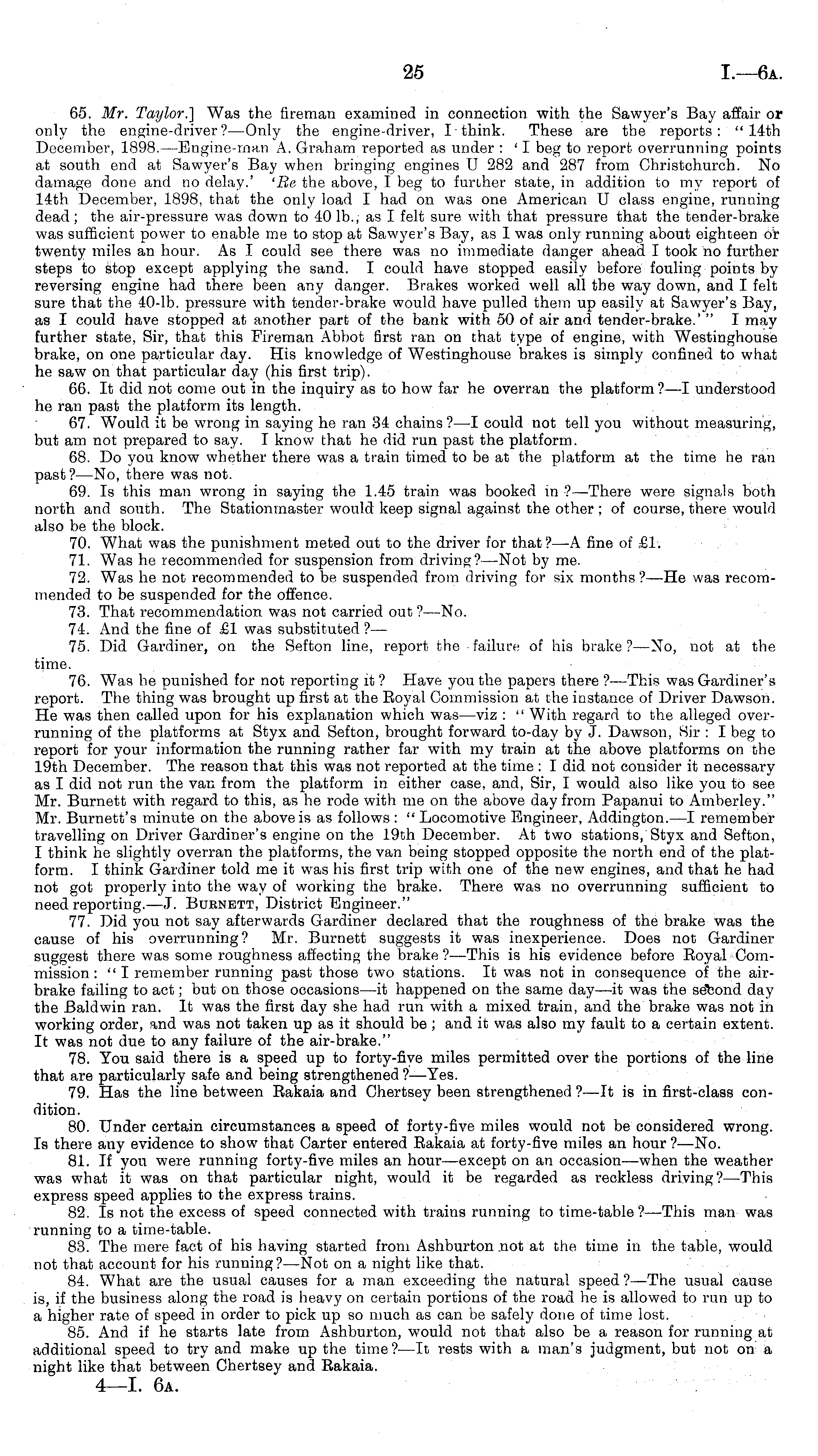 65. Mr. Taylor.] Was the fireman examined in connection with the Sawyer's Bay affair or only the engine-driver?— Only the engine-driver, I think. These are the reports: "14th December, 1898.—Engine-man A. Graham reported as under : ' I beg to report overrunning points at south end at Sawyer's Bay when bringing engines U 282 and 287 from Christchurch. No damage done and no delay.' 'Be the above, I beg to further state, in addition to my report of 14th December, 1898, that the only load I had on was one American U class engine, running dead; the air-pressure was down to 40 lb., as I felt sure with that pressure that the tender-brake was sufficient power to enable me to stop at Sawyer's Bay, as I was only running about eighteen or twenty miles an hour. As I could see there was no immediate danger ahead I took no further steps to stop except applying the sand. I could have stopped easily before fouling points by reversing engine had there been any danger. Brakes worked well all the way down, and I felt sure that the 40-lb. pressure with tender-brake would have pulled them up easily at Sawyer's Bay, as I could have stopped at another part of the bank with 50 of air and tender-brake.' " I may further state, Sir, that this Fireman Abbot first ran on that type of engine, with Westinghouse brake, on one particular day. His knowledge of Westinghouse brakes is simply confined to what he saw on that particular day (his first trip). 66. It did not come out in the inquiry as to how far he overran the platform?—l understood he ran past the platform its length. 67. Would it be wrong in saying he ran 34 chains ?—I could not tell you without measuring, but am not prepared to say. I know that he did run past the platform. 68. Do you know whether there was a train timed to be at the platform at the time he ran past ?—No, there was not. 69. Is this man wrong in saying the 1.45 train was booked in ?—There were signals both north and south. The Stationmaster would keep signal against the other ;of course, there would also be the block. 70. What was the punishment meted out to the driver for that?—A fine of £1. 71. Was he recommended for suspension from driving?— Not by me. 72. Was he not recommended to be suspended from driving for six months?—He was recommended to be suspended for the offence. 73. That recommendation was not carried out ?—No. 74. And the fine of £1 was substituted ?— 75. Did Gardiner, on the Sefton line, report the failure of his brake?—No, not at the time. 76. Was he punished for not reporting it ? Have you the papers there ?—This was Gardiner's report. The thing was brought up first at the Boyal Commission at the instance of Driver Dawson. He was then called upon for his explanation which was —viz : " With regard to the alleged overrunning of the platforms at Styx and Sefton, brought forward to-day by J. Dawson, Sir : I beg to report for your information the running rather far with my train at the above platforms on the 19th December. The reason that this was not reported at the time : I did not consider it necessary as I did not run the van from the platform in either case, and, Sir, I would also like you to see Mr. Burnett with regard to this, as he rode with me on the above day from Papanui to Amberley." Mr. Burnett's minute on the above is as follows : " Locomotive Engineer, Addington.—l remember travelling on Driver Gardiner's engine on the 19th December. At two stations, Styx and Sefton, I think he slightly overran the platforms, the van being stopped opposite the north end of the platform. I think Gardiner told me it was his first trip with one of the new engines, and that he had not got properly into the way of working the brake. There was no overrunning sufficient to need reporting. —J. Burnett, District Engineer." 77. Did you not say afterwards Gardiner declared that the roughness of the brake was the cause of his overrunning? Mr. Burnett suggests it was inexperience. Does not Gardiner suggest there was some roughness affecting the brake ?—This is his evidence before Boyal Commission :" I remember running past those two stations. It was not in consequence of the airbrake failing to act; but on those occasions—it happened on the same day—it was the sdbond day the Baldwin ran. It was the first day she had run with a mixed train, and the brake was not in working order, and was not taken up as it should be ; and it was also my fault to a certain extent. It was not due to any failure of the air-brake." 78. You said there is a speed up to forty-five miles permitted over the portions of the line that are particularly safe and being strengthened ?—Yes. 79. Has the line between Bakaia and Chertsey been strengthened ?—lt is in first-class condition. 80. Under certain circumstances a speed of forty-five miles would not be considered wrong. Is there any evidence to show that Carter entered Bakaia at forty-five miles an hour ?—No. 81. If yon were running forty-five miles an hour—except on an occasion—when the weather was what it was on that particular night, would it be regarded as reckless driving?— This express speed applies to the express trains. 82. Is not the excess of speed connected with trains running to time-table?— This man was running to a time-table. 83. The mere fact of his having started from Ashburton not at the time in the table, would not that account for his running?— Not on a night like that. 84. What are the usual causes for a man exceeding the natural speed ?—The usual cause is, if the business along the road is heavy on certain portions of the road he is allowed to run up to a higher rate of speed in order to pick up so much as can be safely done of time lost. 85. And if he starts late from Ashburton, would not that also be a reason for running at additional speed to try and make up the time? —It rests with a man's judgment, but not on a night like that between Chertsey and Bakaia. 4—l. 6a.