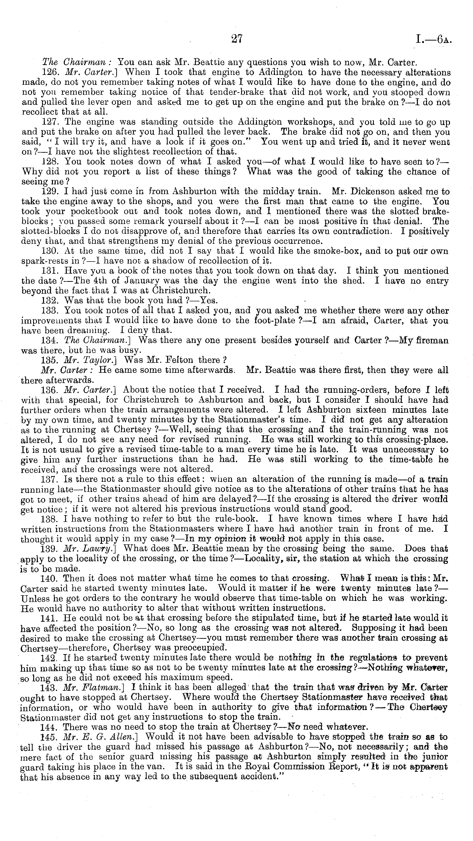 The Chairman : You can ask Mr. Beattie any questions you wish to now, Mr. Carter. 126. Mr. Carter.] When I took that engine to Addington to have the necessary alterations made, do not you remember taking notes of what I would like to have done to the engine, and do not you remember taking notice of that tender-brake that did not work, and you stooped down and pulled the lever open and asked me to get up on the engine and put the brake on ? —I do not recollect that at all. 127. The engine was standing outside the Addington workshops, and you told me to go up and put the brake on after you had pulled the lever back. The brake did not go on, and then you said, " I will try it, and have a look if it goes on." You went up and tried it, and it never went on ?—I have not the slightest recollection of that. 128. You took notes down of what I asked you —of what I would like to have seen to? —■ Why did not you report a list of these things ? What was the good of taking the chance of seeing me ? 129. I had just come in from Ashburton with the midday train. Mr. Dickenson asked me to take the engine away to the shops, and you were the first man that came to the engine. You took your pocketbook out and took notes down, and 1 mentioned there was the slotted brakeblocks ; you passed some remark yourself about it ?—I can be most positive in that denial. The slotted-blocks Ido not disapprove of, and therefore that carries its own contradiction. I positively deny that, and that strengthens my denial of the previous occurrence. 130. At the same time, did not I say that I would like the smoke-box, and to put our own spark-rests in ?—I have not a shadow of recollection of it. 131. Have you a book of the notes that you took down on that day. I think you mentioned the date ? —The 4th of January was the day the engine went into the shed. I have no entry beyond the fact that I was at Christchurch. 132. Was that the book you had ?—Yes. 133. You took notes of all that I asked you, and you asked me whether there were any other improvements that I would like to have done to the foot-plate ?—I am afraid, Carter, that you have been dreaming. I deny that. 134. The Chairman.] Was there anyone present besides yourself and Carter?—My fireman was there, but he was busy. 135. Mr. Taylor.] Was Mr. Felton there ? Mr. Garter : He came some time afterwards. Mr. Beattie was there first, then they were all there afterwards. 136. Mr. Garter.] About the notice that I received. I had the running-orders, before I left with that special, for Christchurch to Ashburton and back, but I consider I should have had further orders when the train arrangements were altered. I left Ashburton sixteen minutes late by my own time, and twenty minutes by the Stationmaster's time. I did not get any alteration as to the running at Chertsey ? —Well, seeing that the crossing and the train-running was not altered, I do not see any need for revised running. He was still working to this crossing-place. It is not usual to give a revised time-table to a man every time he is late. It was unnecessary to give him any further instructions than he had. He was still working to the time-table he received, and the crossings were not altered. 137. Is there not a rule to this effect: when an alteration of the running is made—of a train running late —the Stationmaster should give notice as to the alterations of other trains that he has got to meet, if other trains ahead of him are delayed ?—lf the crossing is altered the driver would get notice; if it were not altered his previous instructions would stand good. 138. I have nothing to refer to but the rule-book. I have known times where I have had written instructions from the Stationmasters where I have had another train in front of me. I thought it would apply in my case ?—ln my opinion it would not apply in this case. 139. Mr. Lawry.] What does Mr. Beattie mean by the crossing being the same. Does that apply to the locality of the crossing, or the time ? —Locality,, sir,, the station at which the crossing is to be made. 140. Then it does not matter what time he comes to that crossing. What I mean is this: Mr. Carter said he started twenty minutes late. Would it matter if he were twenty minutes late ?— Unless he got orders to the contrary he would observe that time-table on which he was working. He would have no authority to alter that without written instructions. 141. He could not be at that crossing before the stipulated time, but if he started late would it have affected the position? —No, so long as the crossing was not altered. Supposing it had been desired to make the crossing at Chertsey—you must remember there was another train crossing at Chertsey —therefore, Chertsey was preoccupied. 142. If he started twenty minutes late there would be nothing in the regulations to prevent him making up that time so as not to be twenty minutes late at the crossing ?—Nothing whatever, so long as he did not exceed his maximum speed. 143. Mr. Flatman.] I think it has been alleged that the train that was driven by Mr. Carter ought to have stopped at Chertsey. Where would the Chertsey Stationmaster have received that information, or who would have been in authority to give that information?—-The Chertsey Stationmaster did not get any instructions to stop the train. 144. There was no need to stop the train at Chertsey ?—No need whatever. 145. Mr. E. G. Allen.] Would it not have been advisable to have stopped the train so as to tell the driver the guard had missed his passage at Ashburton?—No, not necessarily; and the mere fact of the senior guard missing his passage at Ashburton simply resulted in the junior guard taking his place in the van. It is said in the Boyal Commission Beport, '* It is not apparent that his absence in any way led to, the subsequent accident."