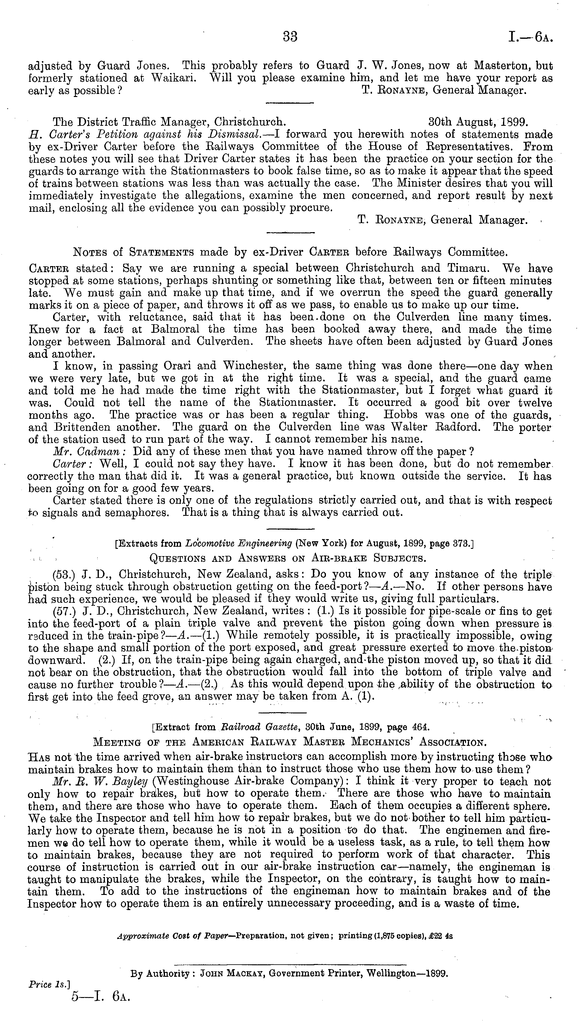 The District Traffic Manager, Christchurch. 30th August, 1899. H. Carter's Petition against his Dismissal. —l forward you herewith notes of statements made by ex-Driver Carter before the Bailways Committee of the House of Bepresentatives. From these notes you will see that Driver Carter states it has been the practice on your section for the guards to arrange with the Stationmasters to book false time, so as to make it appear that the speed of trains between stations was less than was actually the case. The Minister desires that you will immediately investigate the allegations, examine the men concerned, and report result by next mail, enclosing all the evidence you can possibly procure. T. Bonayne, General Manager.