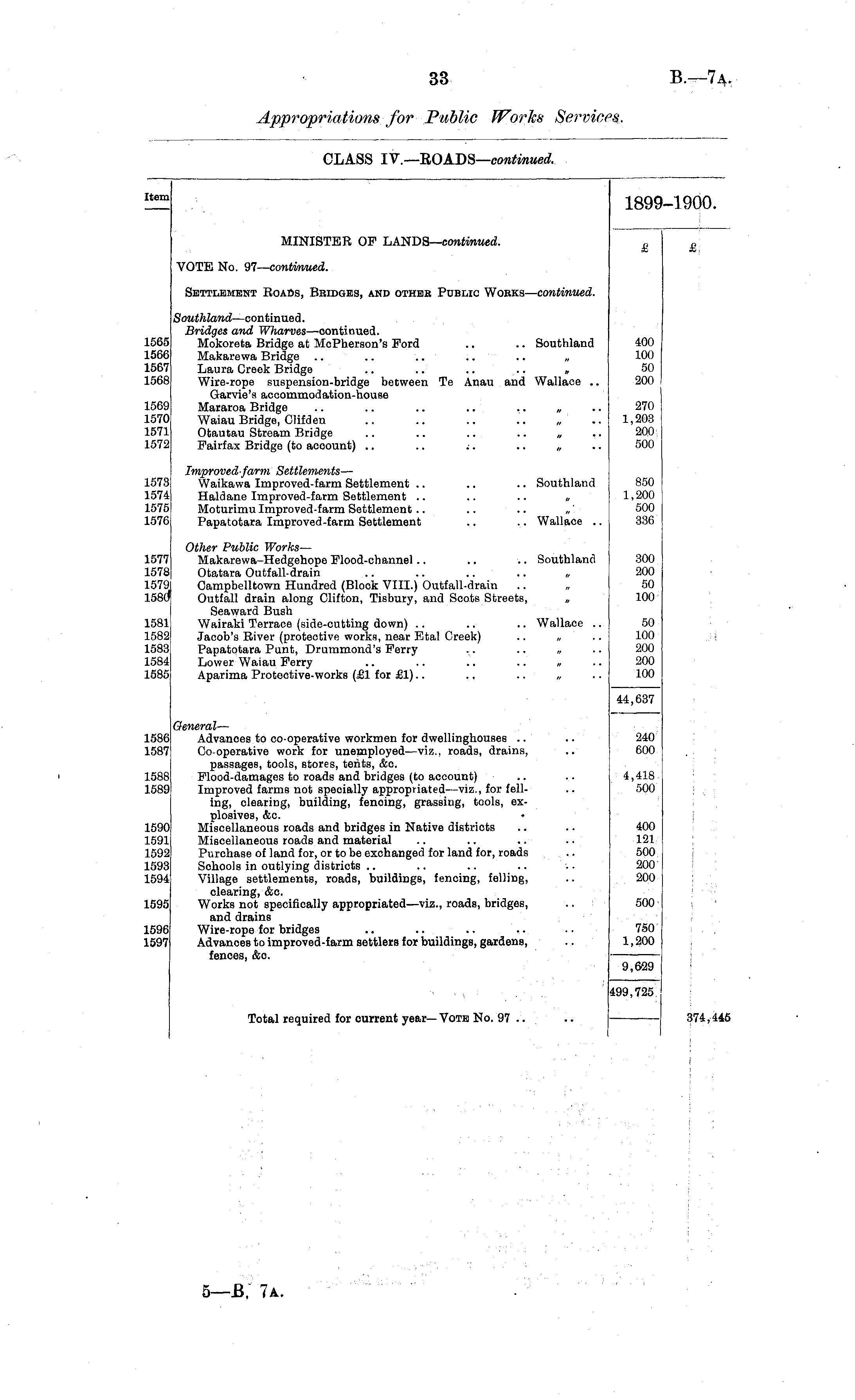 [tern 189 1-1900. MINISTER OF LANDS— continued. £ VOTE No. 97— continued. Settlement Roads, Bridges, and other Public Wobks — continiced. .565 .566 .567 .568 Southland —continued. Bridges and Wharves —continued. Mokorefca Bridge at McPherson's Pord .. .. Southland Makarewa Bridge .. .. Laura Creek Bridge .. .. .. .. „ Wire-rope suspension-bridge between Te Anau and Wallace .. Garvie's accommodation-house Mararoa Bridge .. .. .. .. .. „ Waiau Bridge, Clifden .. .. .. .. „ Otautau Stream Bridge .. .. .. .. „ Fairfax Bridge (to acoount) .. .. ;. .. „ 400 100 50 200 .569 .570 571 .572 270 1,203 200 500 .573 .5741 .575 .576 Improved-farm Settlements — Waikawa Improved-farm Settlement .. .. .. Southland Haldane Improved-farm Settlement .. .. .. „ Moturimu Improved-farm Settlement .. .. .. „' Papatotara Improved-farm Settlement .. .. Wallace .. 850 1,200 500 336 .577 .578 .579 .58d .581 .582 .583 .584 .585 Other Public Works— Makarewa-Hedgehope Flood-channel.. .. .. Southland Otatara Outfall-drain .. .. .. .. „ Oampbelltown Hundred (Block VIII.) Outfall-drain Outfall drain along Clifton, Tisbury, and Scots Streets, „ Seaward Bush Wairaki Terrace (side-cutting down) .. .. .. Wallace .. Jacob's River (protective works, near Etal Creek) .. „ Papatotara Punt, Drummond's Ferry .. .. „ Lower Waiau Ferry .. .. .. .. „ Aparima Protective-works (£1 for £1) 300 200 50 100 50 100 200 200 100 44,637 .586 .587 General — Advances to co-operative workmen for dwellinghouses Co-operative work for unemployed—viz., roads, drains, passages, tools, stores, tents, &c. Flood-damages to roads and bridges (to acoount) Improved farms not specially appropriated —viz., for felling, clearing, building, fenoing, grassing, tools, explosives, &c. • Miscellaneous roads and bridges in Native districts Miscellaneous roads and material Purchase of land for, or to be exchanged for land for, roads Schools in outlying districts Village settlements, roads, buildings, fencing, felling, clearing, &c. Works not specifically appropriated —viz., roads, bridges, and drains Wire-rope for bridges Advances to improved-farm settlers for buildings, gardens, fences, &c. 240 600 .588 .589 4,418 500 L590 L591 L592 L593 L594 400 121 500 200 200 L595 500 L596 ,597 750 1,200 9,629 499,725 Total required for ourrent year— Vote No. 97 .. 374,44/