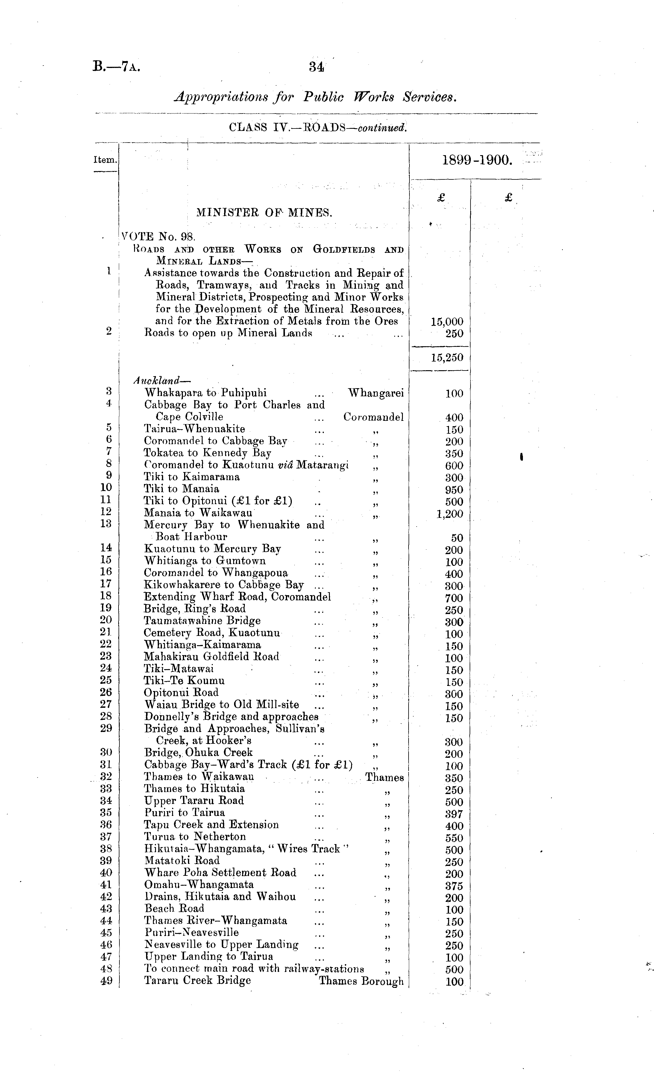 Item. 1899-1900. £ £ MINISTER OF MINES. tVOTE No. 98. Roads and other Wobks on G-oi/dxtklds and Minebal Lands —; Assistance towards the Construction and Repair of Roads, Tramways, and Tracks in Mining and Mineral Districts, Prospecting and Minor Works for the Development of the Mineral Resources, and for the Extraction of Metals from the Ores Roads to open up Mineral Lands 15,000 250 15,250 8 4 5 0 7 8 9 10 11 12 13 14 15 16 17 18 19 20 21 22 23 24. 25 26 27 28 29 Auckland — Whakapara to Puhipuhi ... Whangarei Cabbage Bay to Port Charles and Cape Colville ... Coromandel Tairua-Whemiakite ... ,, Coromandel to Cabbage Bay ... „ Tokatea to Kennedy Bay ... ., Coromandel to Kuaotunu via Matarangi „ Tiki to Kaimarama „ Tiki to Manaia . „ Tiki to Opitonui (£1 for £1) Manaia to Waikawau ... „ Mercury Bay to Whenuakite and Boat Harbour ... ,, Kuaotunu to Mercury Bay ... „ Whitianga to G-umtown ... ,, Coromandel to Whangapoua ... „ Kikowhakarere to Cabbage Bay ... ,, Extending Wharf Road, Coromandel ,, Bridge, Ring's Road ... ,, Taumatawahine Bridge ... ,, Cemetery Road, Kuaotunu ... „ Whitianga-Kaimarama ... „ Mahakirau Goldfield Road ... „ Tiki-Matawai ... ,, Tiki-TeKoumu Opitonui Road ... „ Waiau Bridge to Old Mill-site ... „ Donnelly's Bridge and approaches ,, Bridge and Approaches, Sullivan's Creek, at Hooker's ... „ Bridge, Ohuka Creek ... „ Cabbage Bay-Ward's Track (£1 for £1) Thames to Waikawau ... Thames Thames to Hikutaia ... „ Upper Tararu Road ... „ Puriri to Tairua ... „ Tapu Creek and Extension ... ,, Turua to Netherton ... „ Hikutain-Whangamata, " Wires Track " ,, Matatoki Road ... „ Whare Poha Settlement Road ... ,, Omahu-Whangamata ... „ Drains, Hikutaia and Waihou ... ,, Beach Road ... „ Thames River-Whangamata ... „ Puriri—Neavesville ... „ Neavesville to Upper Landing ... „ Upper Landing to Tairua ... n To connect main road with railway-stations ,, Tararu Creek Bridge Thames Borough 100 400 150 200 350 GOO 300 950 500 1,200 50 200 100 400 300 700 250 300 100 150 100 150 150 300 150 150 30 31 32 33 34 35 36 37 38 39 40 41 42 43 44 45 46 47 48 4!J 300 200 100 350 250 500 397 400 550 500 250 200 375 200 100 150 250 250 100 500 100