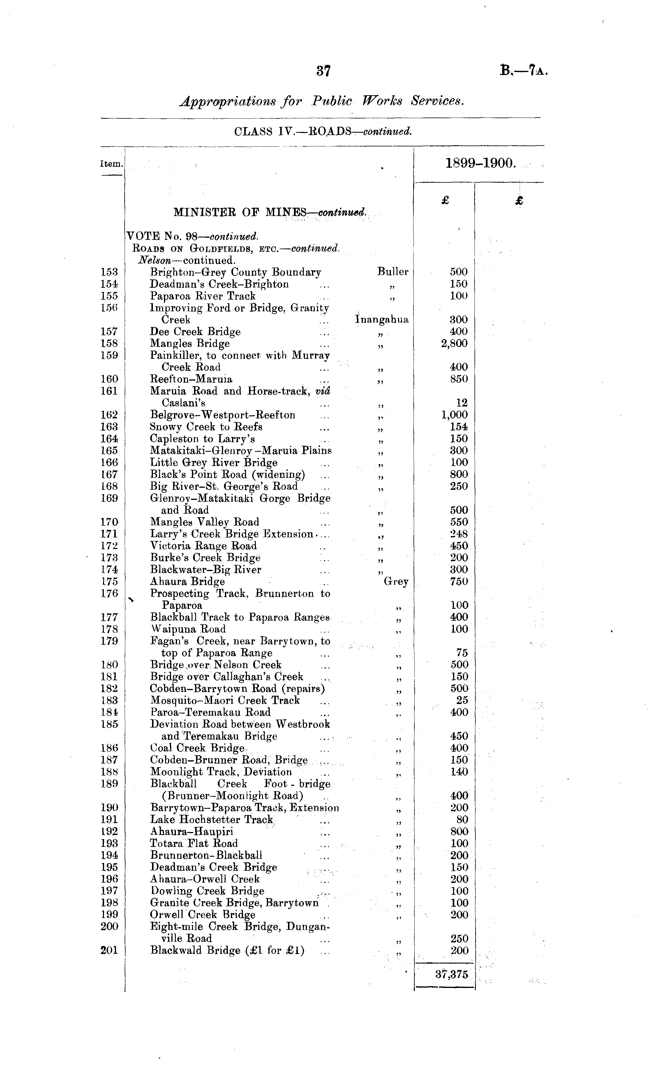 Item. 1899-1900. MINISTER OP MINES— continued. £ £ 153 154 155 156 157 158 159 160 161 162 163 164 165 166 167 168 169 170 171 172 173 174 175 176 VOTE No. Roads cm Goldfields, etc. — continued. Nelson —continued. Brighton-Grey County Boundary Buller Deadman's Creek-Brighton ... „ Paparoa River Track . ,, Improving Ford or Bridge, Granity Creek ... Inangahua Dee Creek Bridge ... „ Mangles Bridge ... „ Painkiller, to connect with Murray Creek Road ... „ Reefton-Maruia ... ,, Maruia Road and Horse-track, vid Caslani's ... „ Belgrove-Westport-Reefton ... „ Snowy Creek to Reefs ... „ Capleston to Larry's . „ Matakitaki-Glenroy -Maruia Plains „ Little Grey River Bridge .. „ Black's Point Road (widening) ... „ Big River-St. George's Road ..'. „ Glenroy—Matakitaki Gorge Bridge and Road ... „ Mangles Valley Road ... „ Larry's Creek Bridge Extension.... ,, Victoria Range Road .. „ Burke's Creek Bridge '... „ Blackwater-Big River .. ,, Ahaura Bridge ... Grey Prospecting Track, Brunnerton to Paparoa ,, Blackball Track to Paparoa Ranges „ Waipuna Road ... ,, Fagan's Creek, near Barry town, to top of Paparoa Range ... ,, Bridge over Nelson Creek ... „ Bridge over Callaghan's Creek .. „ Cobden-Barrytown Road (repairs) „ Mosquito-Maori Creek Track ... ,, Paroa-Teremakau Road Deviation Road between Westbrook and Teremakau Bridge ... ., Coal Creek Bridge ... ,, Cobden-Brunner Road, Bridge .... „ Moonlight Track, Deviation ... „ Blackball Creek Foot - bridge (Brunner-Moonlight Road) ,, Barrytown-Paparoa Track, Extension „ Lake Hochstetter Track ... „ Ahaura-Haupiri ... „ Totara Flat Road .., „ Brunnerton-Blackball ... „ Deadman's Creek Bridge -•••■„. » Ahaura-Orwell Creek ... ,, Dowling Creek Bridge .... ,, Granite Creek Bridge, Barrytowri . ,, Orwell Creek Bridge ... „ Eight-mile Creek Bridge, Dunganville Road ... „ Blackwald Bridge (£1 for £1) ... 500 150 100 300 400 2,800 400 850 12 1,000 154 150 300 100 800 250 500 550 248 450 200 300 750 177 178 179 100 400 100 180 181 182 183 181 185 75 500 150 500 25 400 186 187 188 189 450 400 150 140 190 191 192 193 194 195 196 197 198 199 200 400 200 80 800 100 200 150 200 100 100 200 201 250 200 37,375