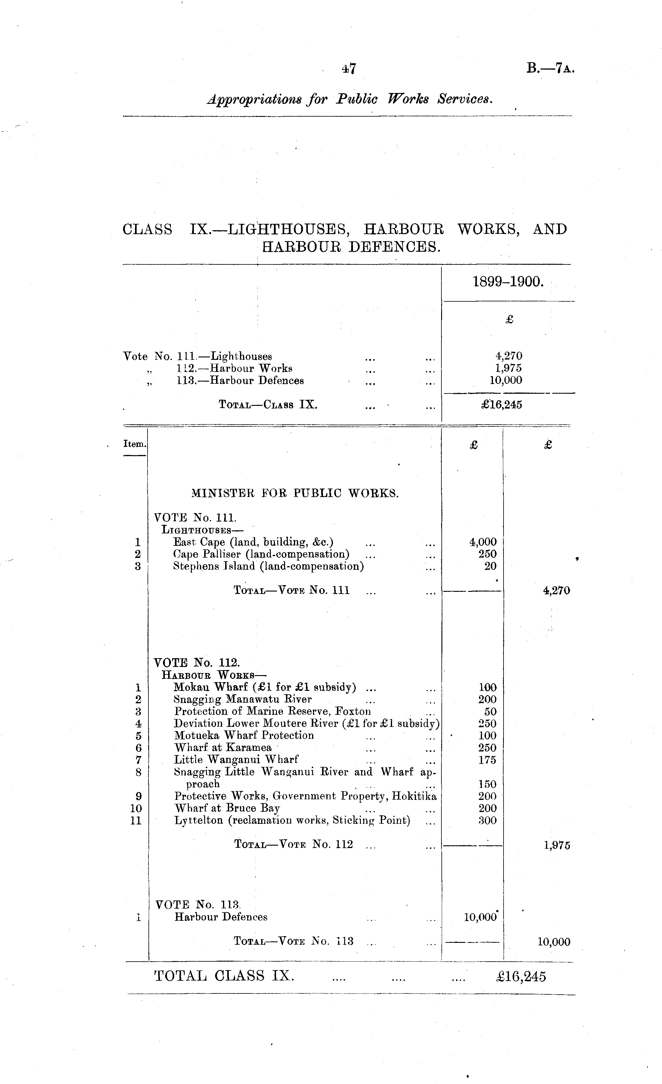 1899-1900. £ "ote No. 111. —Lighthouses ,, 112. —Harbour Works ,, 113. —Harbour Defences 4,270 1,975 10,000 Total—Class IX. £16,245 iem. £ £ MINISTER FOE PUBLIC WORKS. 1 2 3 VOTE No. 111. Lighthouses— East Cape (land, building, &c.) Cape Palliser (land-compensation) ... Stephens Island (land-compensation) 4,000 250 20 Total —Vote No. Ill 4,270 1 2 3 4 5 6 7 8 VOTE No. 112. Habboue Wobks — Mokau Wharf (£1 for £1 subsidy) ... Snagging Manawatu River Protection of Marine Reserve, Foxton Deviation Lower Moutere River (£1 for £1 subsidy) Motueka Wharf Protection Wharf at Karamea Little Wanganui Wharf Snagging Little Wanganui River and Wharf approach Protective Works, Government Property, Hokitika Wharf at Bruce Bay Lyttelton (reclamation works, Sticking Point) 100 200 50 250 100 250 175 9 10 11 150 200 200 300 Total—Vote No. 112 ... 1,975 VOTE No. 113. Harbour Defences 1 10,000' Total —Vote No. 113 ... 10,000 TOTAL CLASS IX. 16,245