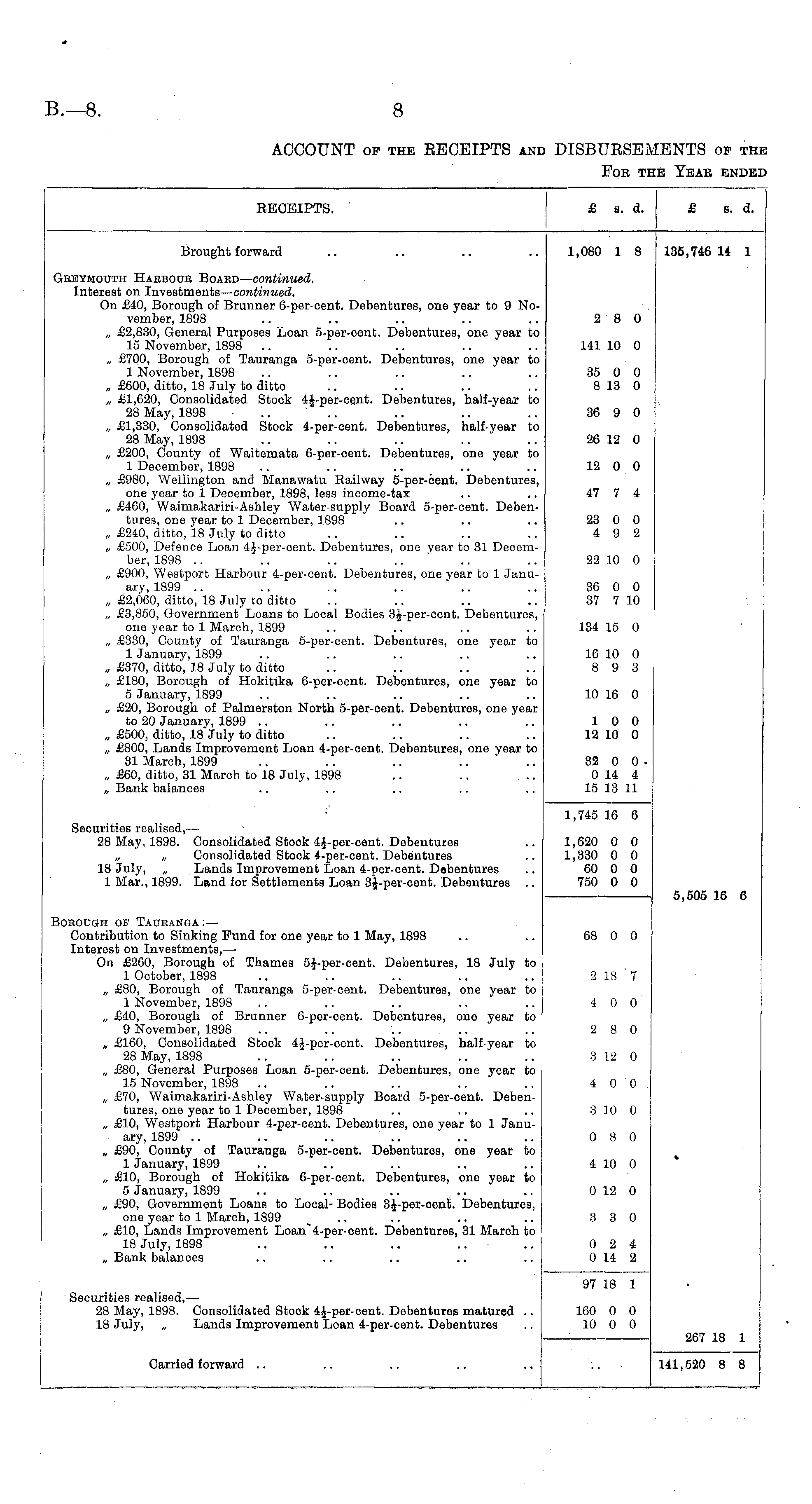 RECEIPTS. £ s. a. £ s. a. Brought forward 1,080 1 8 135,746 14 1 Gbeymouth Habboub Boaed— continued. Interest on Investments — continued. On £40, Borough of Brunner 6-per-cent. Debentures, one year to 9 November, 1898 „ £2,830, General Purposes Loan 5-per-cent. Debentures, one year to 15 November, 1898 „ £700, Borough of Tauranga 5-per-cent. Debentures, one year to 1 November, 1898 „ £600, ditto, 18 July to ditto „ £1,620, Consolidated Stock 4J-per-cent. Debentures, half-year to 28 May, 1898 .. .. „ £1,330, Consolidated Stock 4-per-cent. Debentures, half-year to 28 May, 1898 „ £200, County of Waitemata 6-per-cent. Debentures, one year to 1 December, 1898 „ £980, Wellington and Manawatu Railway 5-per-6ent. Debentures, one year to 1 December, 1898, less income-tax „ £460, Waimakariri-Ashley Water-supply Board 5-per-cent. Debentures, one year to 1 December, 1898 „ £240, ditto, 18 July to ditto „ £500, Defence Loan 4J-per-cent. Debentures, one year to 31 December, 1898 .. „ £900, Westport Harbour 4-per-cent. Debentures, one year to 1 January, 1899 .. „ £2,060, ditto, 18 July to ditto „ £3,850, Government Loans to Local Bodies 3J-per-cent. Debentures, one year to 1 March, 1899 „ £330, County of Tauranga 5-per-cent. Debentures, one year to 1 January, 1899 „ £370, ditto, 18 July to ditto „ £180, Borough of Hokitika 6-per-cent. Debentures, one year to 5 January, 1899 „ £20, Borough of Palmerston North 5-per-cent. Debentures, one year to 20 January, 1899 .. „ £500, ditto, 18 July to ditto „ £800, Lands Improvement Loan 4-per-cent. Debentures, one year to 31 March, 1899 „ £60, ditto, 31 March to 18 July, 1898 „ Bank balances 2 8 0 141 10 0 35 0 0 8 13 0 36 9 0 26 12 0 12 0 0 47 7 4 23 0 0 4 9 2 22 10 0 36 0 0 37 7 10 134 15 0 16 10 0 8 9 3 10 16 0 10 0 12 10 0 32 0 0 • 0 14 4 15 13 11 Securities realised, — 28 May, 1898. Consolidated Stock 4£-per-cenfc. Debentures „ „ Consolidated Stock 4-per-cent. Debentures 18 July, „ Lands Improvement Loan 4-per-cent. Debentures 1 Mar., 1899. Land for Settlements Loan 3i-per-oent. Debentures .. 1,745 16 6 1,620 0 0 1,330 0 0 60 0 0 750 0 0 5,505 16 6 Bobough of Taueanga:— Contribution to Sinking Fund for one year to 1 May, 1898 Interest on Investments, — On £260, Borough of Thames 5£-per-eent. Debentures, 18 July to 1 October, 1898 „ £80, Borough of Tauranga 5-per-cent. Debentures, one year to 1 November, 1898 „ £40, Borough of Brunner 6-per-cent. Debentures, one year to 9 November, 1898 „ £160, Consolidated Stock 4J-per-cent. Debentures, half-year to 28 May, 1898 „ £80, General Purposes Loan 5-per-cent. Debentures, one year to 15 November, 1898 .. „ £70, Waimakariri-Ashley Water-supply Board 5-per-cent. Debentures, one year to 1 December, 1898 „ £10, Westport Harbour 4-per-cent. Debentures, one year to 1 January, 1899 .. „ £90, County of Tauranga 5-per-cent. Debentures, one year to 1 January, 1899 „ £10, Borough of Hokitika 6-per-cent. Debentures, one year to 5 January, 1899 „ £90, Government Loans to Local- Bodies 3£-per-cent. Debentures, one year to 1 March, 1899 „ £10, Lands Improvement Loan"4-per-cent. Debentures, 31 March to 18 July, 1898 .. .. .. .. - „ Bank balances 68 0 0 2 IS 7 4 0 0 2 8 0 8 12 0 4 0 0 3 10 0 0 8 0 4 10 0 0 12 0 3 3 0 0 2 4 0 14 2 97 18 1 Securities realised, — 28 May, 1898. Consolidated Stock 4J-per-cent. Debentures matured .. 18 July, „ Lands Improvement Loan 4-per-cent. Debentures 160 0 0 10 0 0 267 18 1 Carried forward 141,520 8 8