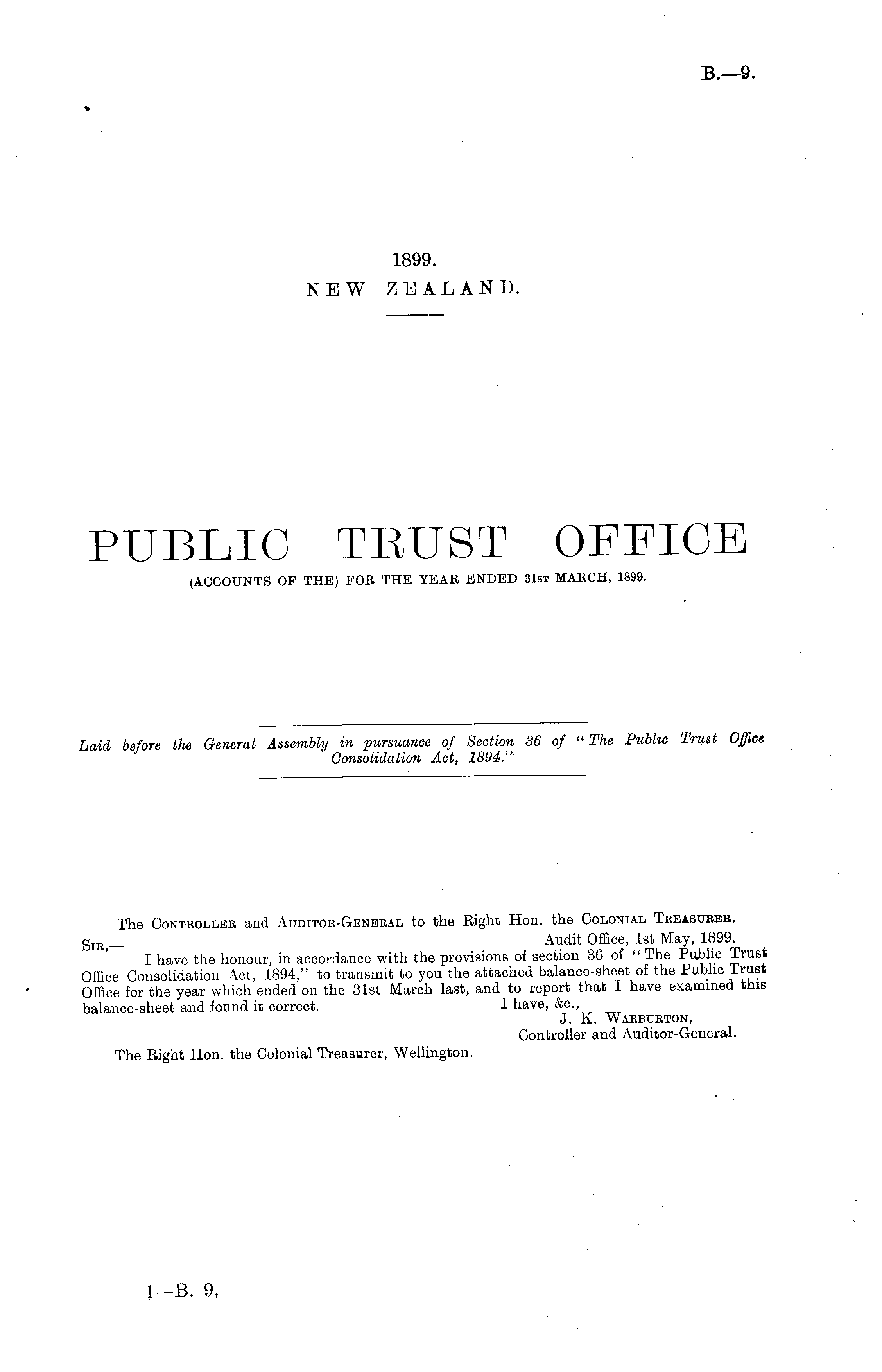 The Controller and Auditor-General to the Right Hon. the Colonial Treasurer. glB _ Audit Office, Ist May, 1899. I have the honour, in accordance with the provisions of section 36 of " The Public Trust Office Consolidation Act, 1894," to transmit to you the attached balance-sheet of the Public Trust Office for the year which ended on the 31st March last, and to report that I have examined this balance-sheet and found it correct. I have, &c., J. K. Warburton, Controller and Auditor-General. The Right Hon. the Colonial Treasurer, Wellington.