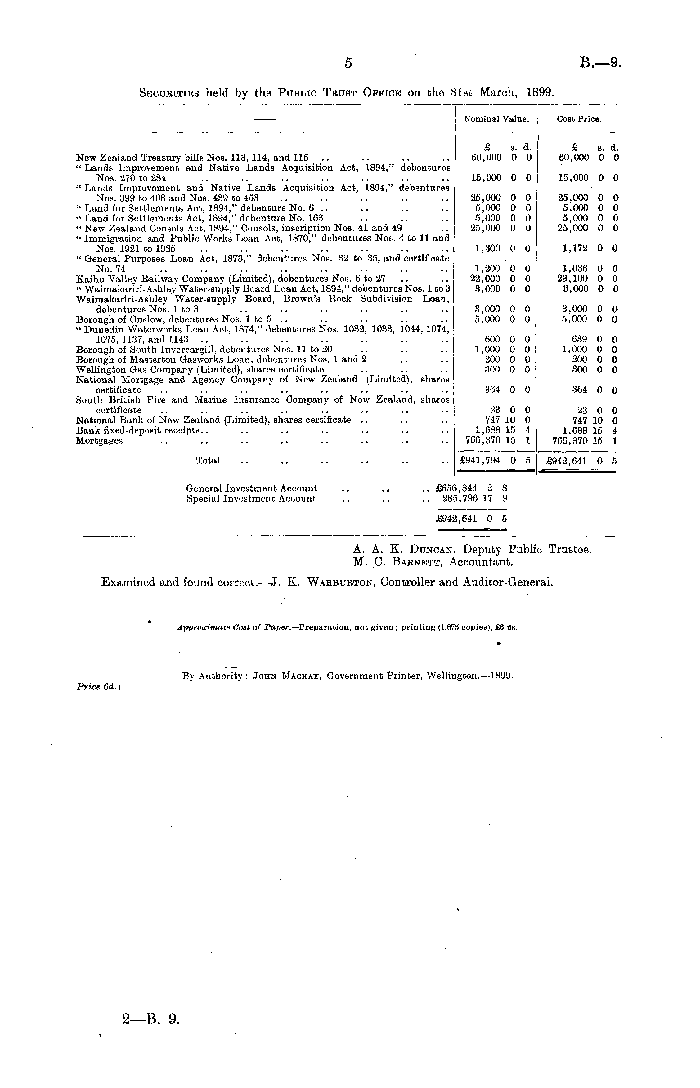 Nominal Value. Cost Price. New Zealand Treasury bills Nos. 113, 114, and 115 .. " Lands Improvement and Native Lands Acquisition Act, 1891," debentures Nos. 270 to 284 " Lands Improvement and Native Lands Acquisition Act, 1894," debentures Nos. 399 to 408 and Nos. 439 to 453 " Land for Settlements Act, 1894," debenture No. 6 .. " Land for Settlements Act, 1894," debenture No. 163 " New Zealand Consols Act, 1894," Consols, inscription Nos. 41 and 49 " Immigration and Public Works Loan Act, 1870," debentures Nos. 4 to 11 and Nos. 1921 to 1925 " General Purposes Loan Act, 1873," debentures Nos. 32 to 35, and certificate No. 74 Kaihu Valley Railway Company (Limited), debentures Nos. 6 to 27 " Waimakariri-A3hley Water-supply Board Loan Act, 1894," debentures Nos. 1 to 3 Waimakariri-Ashley Water-supply Board, Brown's Rock Subdivision Loan, debentures Nos. 1 to 3 Borough of Onslow, debentures Nos. 1 to 5 .. " Dunedin Waterworks Loan Act, 1874," debentures Nos. 1032, 1033, 1044, 1074, 1075, 1137, and 1143 Borough of South Invercargill, debentures Nos. 11 to 20 Borough of Masterton Gasworks Loan, debentures Nos. 1 and 2 Wellington Gas Company (Limited), shares certificate National Mortgage and Agency Company of New Zealand (Limited), shares certificate South British Pire and Marine Insurance Company of New Zealand, shares certificate National Ba,nk of New Zealand (Limited), shares certificate .. Bank fixed-deposit receipts.. Mortgages £ s. d. 60,000 0 0 £ s. d. 60,000 0 0 15,000 0 0 15,000 0 0 25,000 0 0 5,000 0 0 5,000 0 0 25,000 0 0 25,000 0 0 5,000 0 0 5,000 0 0 25,000 0 0 1,300 0 0 1,172 0 0 1,200 0 0 22,000 0 0 3,000 0 0 1,036 0 0 23,100 0 0 3,000 0 0 3,000 0 0 5,000 0 0 3,000 0 0 5,000 0 0 600 0 0 1,000 0 0 200 0 0 300 0 0 639 0 0 1,000 0 0 200 0 0 800 0 0 364 0 0 364 0 0 23 0 0 747 10 0 1,688 15 4 766,370 15 1 23 0 0 747 10 0 1,688 15 4 766,370 15 1 Total £941,794 0 5 £942,641 0 5 General Investment Account .. .. .. £65( Special Investment Account .. .. 28i ,844 2 8 ,796 17 9 £94! ,641 0 5