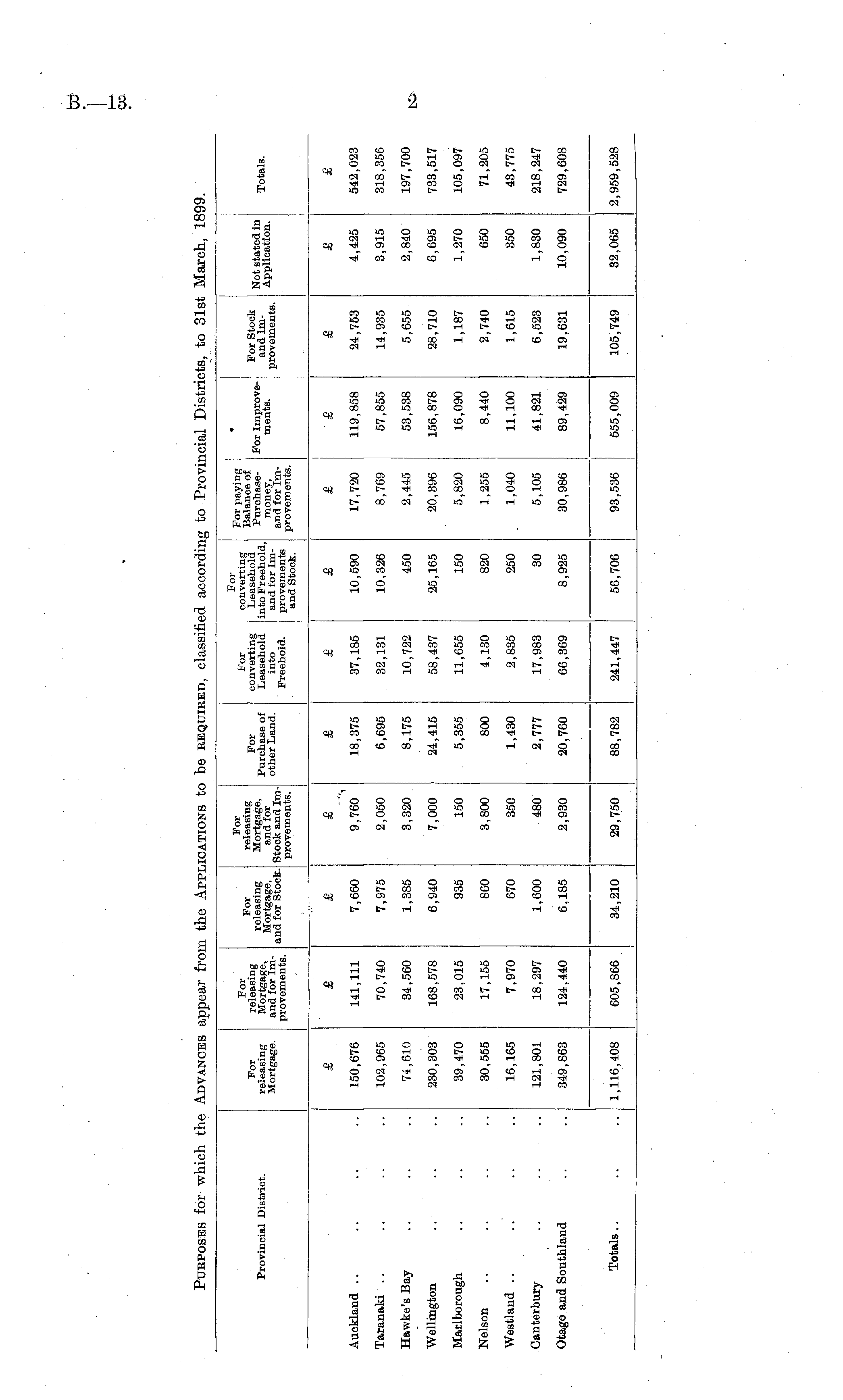 For For converting converting i Leasehold Leasehold ; into Freehold, into \ and for IraFreehold. I provements I and Stock. * Provincial District. For releasing Mortgage. For releasing Mortgage, and for Improvements. For releasing Mortgage, and for Stock. For releasing Mortgage, and for Stock and Improvements. For Purchase of other Land. For paying Balance of Purchasemoney, and for Improvements. For improve- *£$£? ments. prove ments. Not stated in Application. Totals. I £ £ £ £ £ £ £ £ £ £ £ £ Auckland 150,676 141,111 7,660 9,760 18,375 37,185 10,590 17,720 119,858 24,753 4,425 542,023 Taranaki 102,965 70,740 7,975 2,050 6,695 32,131 10,326 8,769 57,855 14,935 3,915 318,356 Hawke's Bay 74,610 34,560 1,385 3,320 8,175 10,722 450 2,445 53,538 5,655 2,840 197,700 Wellington 230,303 168,578 6,940 7,000 24,415 58,437 25,165 20,396 156,878 28,710 6,695 733,517 Marlborough 39,470 23,015 935 150 5,355 11,655 150 5,820 16,090 1,187 1,270 105,097 Nelson 30,555 17,155 860 3,800 800 4,130 820 1,255 8,440 2,740 650 71,205 Westland 16,165 7,970 670 350 1,430 2,835 250 1,040 11,100 1,615 350 43,775 Canterbury 121,801 18,297 1,600 480 2,777 17,983 30 5,105 41,821 6,523 1,830 218,247 Otago and Southland 349,863 124,440 6,185 2,930 20,760 66,369 8,925 30,986 89,429 19,631 10,090 729,608 Totals.. 1,116,408 605,866 34,210 29,750 88,782 241,447 56,706 93,536 555,009 105,749 32,065 2,959,528