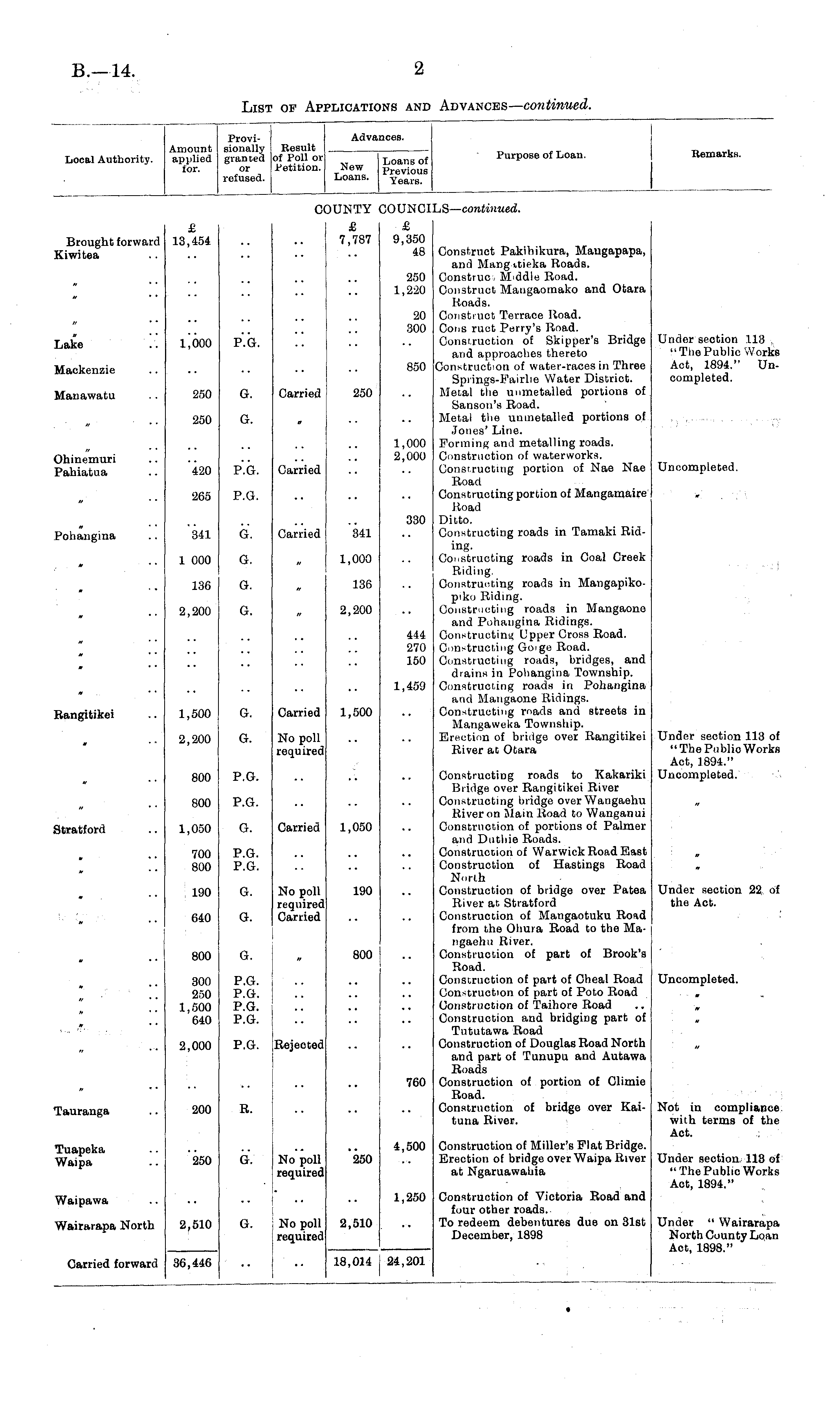 Provisionally granted or refused. Advances. Local Authority. Amount applied for. Result of Poll or Petition. w Loans of new previous Loans. Years Purpose of Loan. Remarks. C( iUNTY 30UNCI: LS — continued. Brought forward Kiwitea £ 13,454 £ 7,787 £ 9,350 48 Construct Pakihikura, Mangapapa, and Mang itieka Roads. Construe, Middle Road. Construct Mangaomako and Otara Roads. Construct Terrace Road. Cons ruct Perry's Road. Construction of Skipper's Bridge and approaches thereto Construction of water-races in Three Springs-Fairlie Water District. Metal the unmetalled portions of Sanson's Road. Metal the unmetalled portions of Jones' Line. Forming and metalling roads. Construction of waterworks. Constructing portion of Nae Nae Road Constructing portion of Mangamaire Road Ditto. Constructing roads in Tamaki Riding. Constructing roads in Coal Creek Riding. Constructing roads in Mangapikopiko Riding. Constructing roads in Mangaone and Pohangina Ridings. Constructing Upper Cross Road. Constructing Gcge Road. Constructing roads, bridges, and drains in Pohangina Township. Constructing roads in Pohangina and Mangaone Ridings. Constructing roads and streets in Mangaweka Township. Erection of bridge over Rangitikei River at Otara 250 1,220 20 300 Lake 1*000 P.G. Under section 113 , "ThePublic Works Act, 1894." Uncompleted. Mackenzie 850 Manawatu 250 G. Carried 250 250 G. Ohinemuri Pahiatua 1,000 2,000 Uncompleted. 420 P.G. Carried 265 P.G. Pohangina *341 G. Carried 341 330 1 000 G. 1,000 136 G. 136 2,200 G. 2,200 444 270 150 1,459 Rangitikei 1,500 G. Carried 1,500 2,200 G. No poll required Under section 113 of "The Public Works Act, 1894." Uncompleted. 800 P.G. Constructing roads to Kakariki Bridge over Rangitikei River Constructing bridge overWangaehu River on Main Road to Wanganui Construction of portions of Palmer and Duthie Roads. Construction of Warwick Road East Construction of Hastings Road North Construction of bridge over Patea River at Stratford Construction of Mangaotuku Road from the Ohura Road to the Mangaehu River. Construction of part of Brook's Road. Construction of part of Cheal Road Construction of part of Poto Road Construction of Taihore Road Construction and bridging part of Tututawa Road Construction of Douglas Road North and part of Tunupu and Autawa Roads Construction of portion of Climie Road. Construction of bridge over Kaituna River. 800 P.G. Stratford 1,050 G. Carried 1,050 700 800 P.G. P.G. 190 G. No poll required Carried 190 Under section 22 of the Act. 640 G. 800 G. 800 300 250 1,500 640 P.G. P.G. P.G. P.G. I Uncompleted. I i 2,000 P.G. Rejected 760 Tauranga 200 R. Not in compliance with terms of the Act. Tuapeka Waipa 250 G. 250 4,500 Construction of Miller's Flat Bridge. Erection of bridge over Waipa River at Ngaruawahia No poll required Under section 113 of "The Public Works Act, 1894." Waipawa 1,250 Construction of Victoria Road and four other roads. To redeem debentures due on 31st December, 1898 Wairarapa North 2,510 G. No poll required 2,510 Under " Wairarapa North County Loan Act, 1898." Carried forward 36,446 18,014 j 24,201