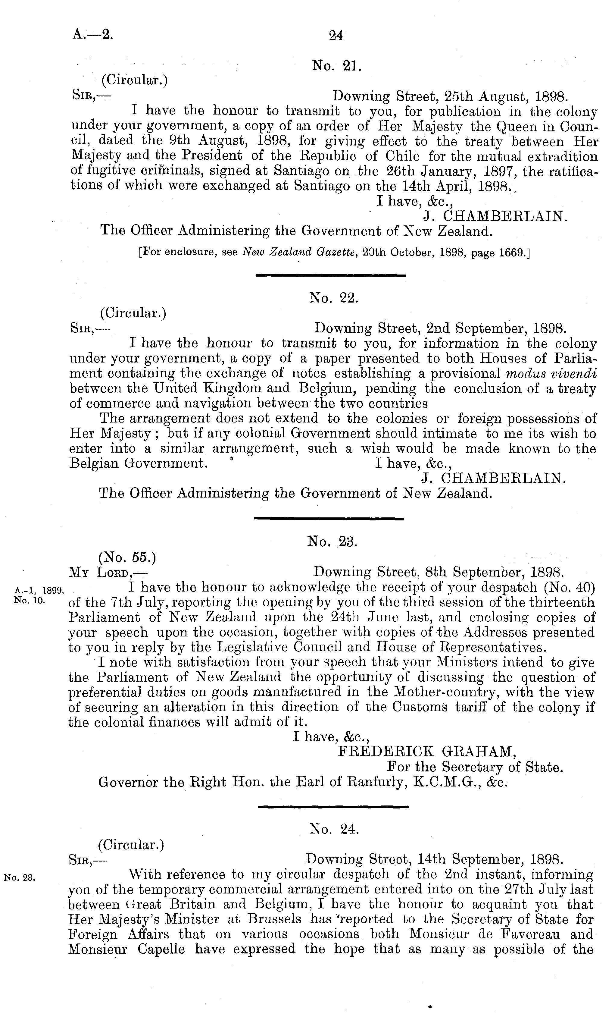 No. 22. (Circular.) Sir,— Downing Street, 2nd September, 1898. I have the honour to transmit to you, for information in the colony under your government, a copy of a paper presented to both Houses of Parliament containing the exchange of notes establishing a provisional modus vivendi between the United Kingdom and Belgium, pending the conclusion of a treaty of commerce and navigation between the two countries The arrangement does not extend to the colonies or foreign possessions of Her Majesty ; but if any colonial Government should intimate to me its wish to enter into a similar arrangement, such a wish would be made known to the Belgian Government. I have, &c, J. CHAMBEELAIN. The Officer Administering the Government of New Zealand.