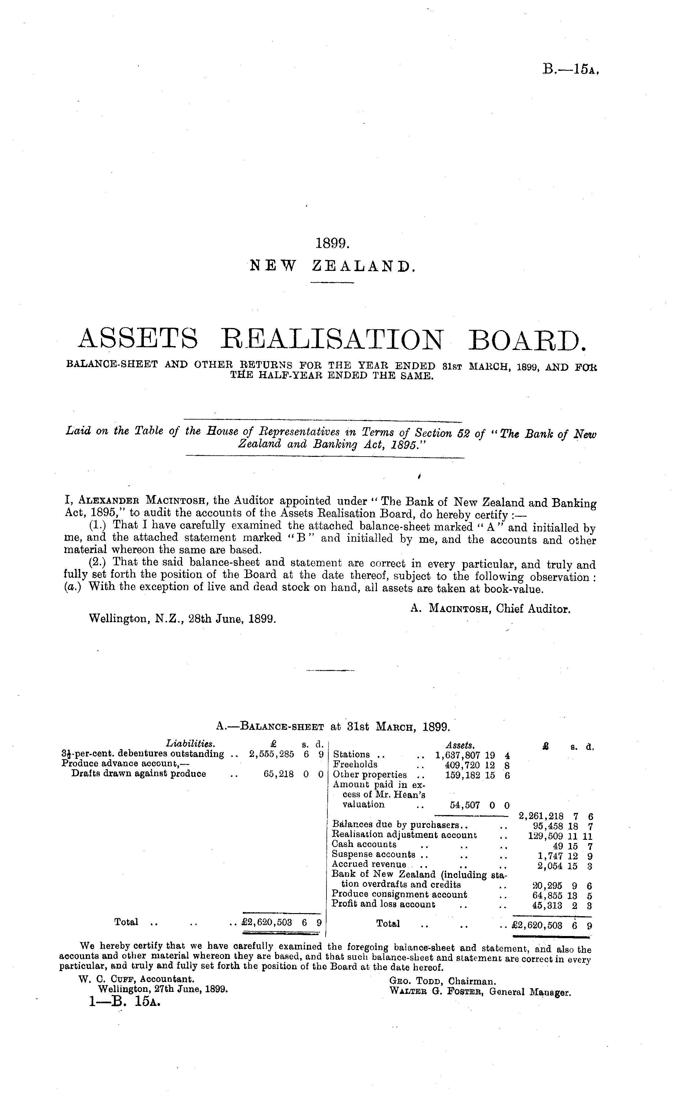 I, Alexander Macintosh, the Auditor appointed under " The Bank of New Zealand and Banking Act, 1895," to audit the accounts of the Assets Eealisation Board, do hereby certify : (1.) That I have carefully examined the attached balance-sheet marked " A " and initialled by me, and the attached statement marked "B" and initialled by me, and the accounts and other material whereon the same are based. (2.) That the said balance-sheet and statement are correct in every particular, and truly and fully set forth the position of the Board at the date thereof, subject to the following observation : (a.) With the exception of live and dead stock on hand, all assets are taken at book-value. A. Macintosh, Chief Auditor. Wellington, N.Z., 28th June, 1899.