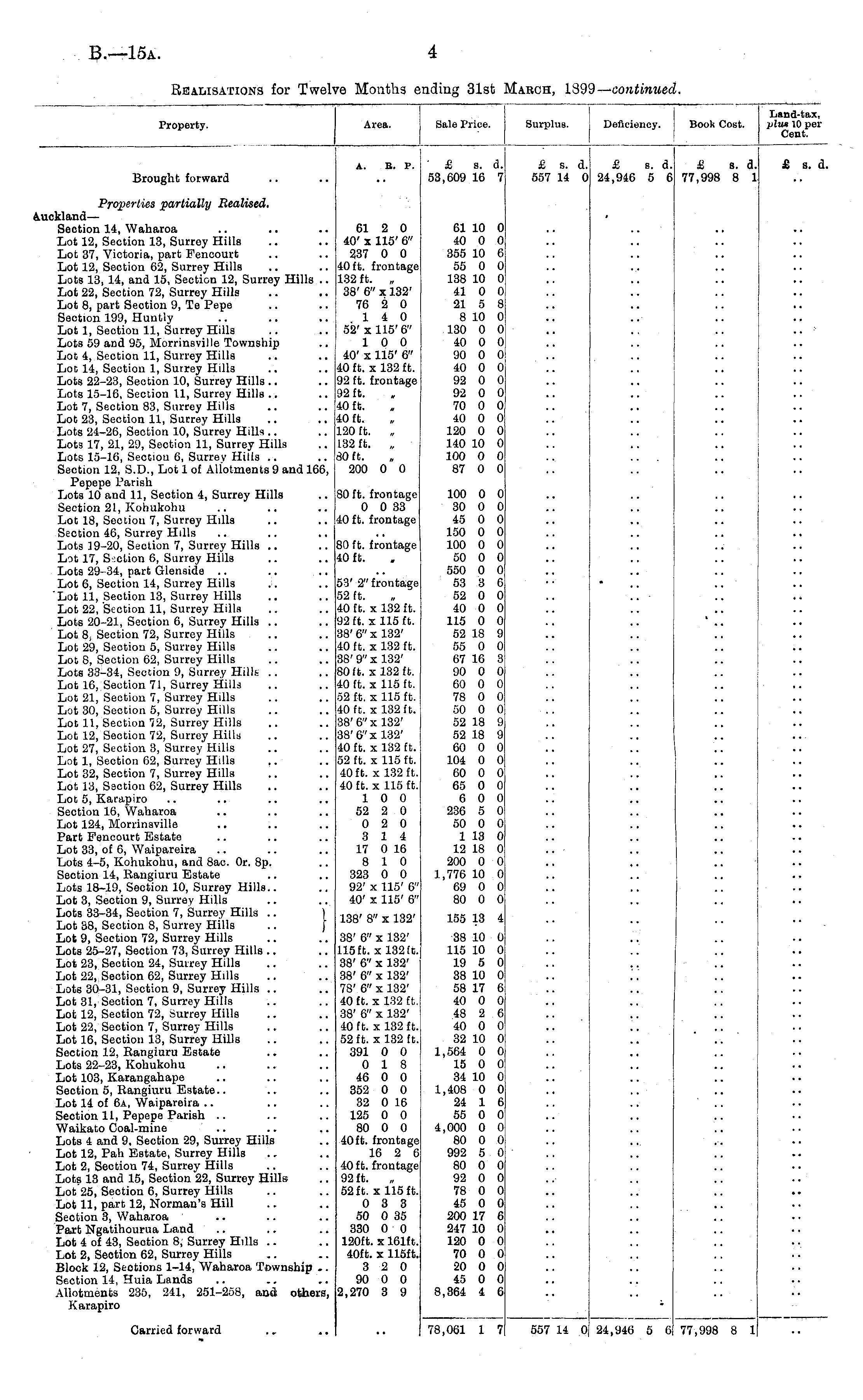 Property. Area. Sale Price. Surplus. Deficiency. Book Cost. Land-tax, pltvi 10 pelCent. Brought forward A. B. P. £ s. d. 53,609 16 7 a s. d. 557 14 0 £ s. d. 24,946 5 6 £ s. d. 77,998 8 1 £ s. d. Properties partially Realised. .uckland— Section 14, Waharoa Lot 12, Section 13, Surrey Hills Lot 37, Victoria, part Fencourt Lot 12, Section 62, Surrey Hills Lota 13, 14, and 15, Section 12, Surrey Hills .. Lot 22, Section 72, Surrey Hills Lot 8, part Seotion 9, Tβ Pepe Section 199, Huntly Lot 1, Section 11, Surrey Hilla Lota 59 and 95, Morrinsville Townahip Lot 4, Section 11, Surrey Hilla Lot 14, Section 1, Surrey Hills Lots 22-23, Section 10, Surrey Hills Lots 15-16, Section 11, Surrey Hills Lot 7, Section 83, Surrey Hills Lot 23, Section 11, Surrey Hills Lots 24-26, Section 10, Surrey Hills .. Lot3 17, 31, 29, Section 11, Surrey Hilla Lots 15-16, Section 6, Surrey Hilla Section 12, S.D., Lot 1 of Allotments 9 and 166, Pepepe Parish Lots 10 and 11, Section 4, Surrey Hills Section 21, Kohukohu Lot 18, Section 7, Surrey Hills Section 46, Surrey Hills Lots 19-20, Section 7, Surrey Hills Lot 17, Section 6, Surrey Hills Lots 29-34, part Glenside Lot 6, Section 14, Surrey Hills Lot 11, Section 13, Surrey Hills Lot 22, Section 11, Surrey Hills Lots 20-21, Section 6, Surrey Hills Lot 8, Section 72, Surrey Hills Lot 29, Section 5, Surrey Hills Lot 8, Section 62, Surrey Hills Lots 33-34, Section 9, Surrey Hills Lot 16, Seotion 71, Surrey Hilla Lot 21, Seotion 7, Surrey Hills Lot 30, Section 5, Surrey Hills Lot 11, Section 72, Surrey Hills Lot 12, Section 72, Surrey Hillb Lot 27, Section 3, Surrey Hills Lot 1, Section 62, Surrey Hills Lot 32, Section 7, Surrey Hills Lot 13, Section 62, Surrey Hills Lot 5, Karapiro Section 16, Waharoa Lot 124, Morrinaville Part Fencourt Estate Lot 33, of 6, Waipareira Lots 4-5, Kohukohu, and 8ac. Or. 8p. Section 14, Rangiuru Estate Lots 18-19, Section 10, Surrey Hills Lot 3, Section 9, Surrey Hills Lota 33-34, Section 7, Surrey Hills .. ) Lot 38, Section 8, Surrey Hills .. J Lot 9, Section 72, Surrey Hills Lots 25-27, Section 73, Surrey Hills Lot 23, Section 24, Surrey Hills Lot 22, Section 62, Surrey Hills Lots 30-31, Section 9, Surrey Hills Lot 31, Section 7, Surrey Hills Lot 12, Seotion 72, surrey Hills Lot 22, Section 7, Surrey Hills Lot 16, Section 13, Surrey Hills Section 12, Rangiuru Estate Lots 22-23, Kohukohu Lot 103, Karangahape Section 5, Rangiuru Estate.. Lot 14 of 6a, Waipareira Section 11, Pepepe Parish Waikato Coal-mine Lots 4 and 9, Section 29, Surrey Hills Lot 12, Pah Estate, Surrey Hills Lot 2, Section 74, Surrey Hills Lots 13 and 15, Section 22, Surrey Hills Lot 25, Section 6, Surrey Hills Lot 11, part 12, Norman's Hill Section 3, Waharoa Part Ngatihourua Land Lot 4 of 43, Section 8, Surrey Hills Lot 2, Seotion 62, Surrey Hills Block 12, Sections 1-14, Waharoa Township •. Section 14, Huia Lands Allotments 235, 241, 251-258, and others, Karapiro 61 2 0 40' x 115' 6" 237 0 0 40 ft. frontage 132 ft. „ 38' 6" x 132' 76 2 0 14 0 52' x 115' 6" 10 0 40' x 115' 6" 40 ft. x 132 ft. 92 ft. frontage 92 ft. 40 ft. 40 ft. 120 ft. , 132 ft. „ 30 ft. 200 0 0 80 ft. frontage 0 0 33 40 ft. frontage 80 ft. frontage 40 ft. 53' 2" frontage 52 ft. 40 ft. x 132 ft. 92 ft. x 115 ft. 38' 6" x 132' 40 ft. x 132 ft. 38'9" x 132' SOft. x 132 ft. 40 ft. x 115 ft. 52 ft. x 115 ft. 40 ft. x 132 ft. 38' 6" x 132' 38' 6" x 132' 40 ft. x 132 ft. 52 ft. x 115 ft. 40 ft. x 132 ft. 40 ft. x 115 ft. 10 0 52 2 0 0 2 0 3 14 17 0 16 8 10 323 0 0 92' x 115' 6" 40' x 115' 6" 61 10 0 40 0 0 355 10 6 55 0 0 138 10 0 41 0 0| 21 5 8 8 10 0 130 0 0 40 0 0 90 0 0; 40 0 0: 92 0 0 92 0 0i 70 0 0 40 0 0 120 0 0 140 10 0 100 0 0 87 0 0 100 0 0 30 0 0 45 0 0 150 0 0 100 0 0 50 0 0 550 0 0 53 3 6 52 0 0 40 0 0 115 0 0 52 18 9 55 0 0 67 16 3 90 0 0 60 0 0 78 0 0 50 0 0 52 18 9 52 18 9 60 0 0 104 0 0 60 0 0 65 0 0 6 0 0 236 5 0 50 0 0 1 13 0 12 18 0 200 0 0 1,776 10 0 69 0 0 80 0 0 "■ ■" .. I i • • I i 1 ! 138' 8" x 132' 155 13 4 38' 6" x 132' 115ft. x 132 ft. 38' 6" x 132' 38' 6" x 132' 78' 6" x 132' 40 ft. x 132 ft. 38' 6" x 132' 40 ft. x 132 ft. 52 ft. x 132 ft. 391 0 0 0 18 46 0 0 352 0 0 32 0 16 125 0 0 i 80 0 0 40ft. frontage 16 2 6 40 ft. frontage 92 ft. „ 52 ft. x 115 ft. 0 3 3 50 0 35 830 0 0 120ft. x 161ft. 40ft. x 115ft. 3 2 0 90 0 0 2,270 3 9 38 10 0 115 10 0 19 5 0 38 10 0 58 17 6 40 0 0 48 2 6 40 0 0 32 10 0 ! 1,564 0 0 15 0 0 34 10 0 1,408 0 0 24 1 6 55 0 0 4,000 0 0 80 0 0 992 5 0 80 0 0 92 0 0 78 0 0 45 0 0 200 17 6 247 10 0 120 0 0 70 0 0 20 0 0 45 0 0 8,364 4 6 * * * ' •' " •■- . ■ • • • >1 .. ■• Carried forward 78,061 1 7 557 14 0 24,946 5 6 77,998 8 1