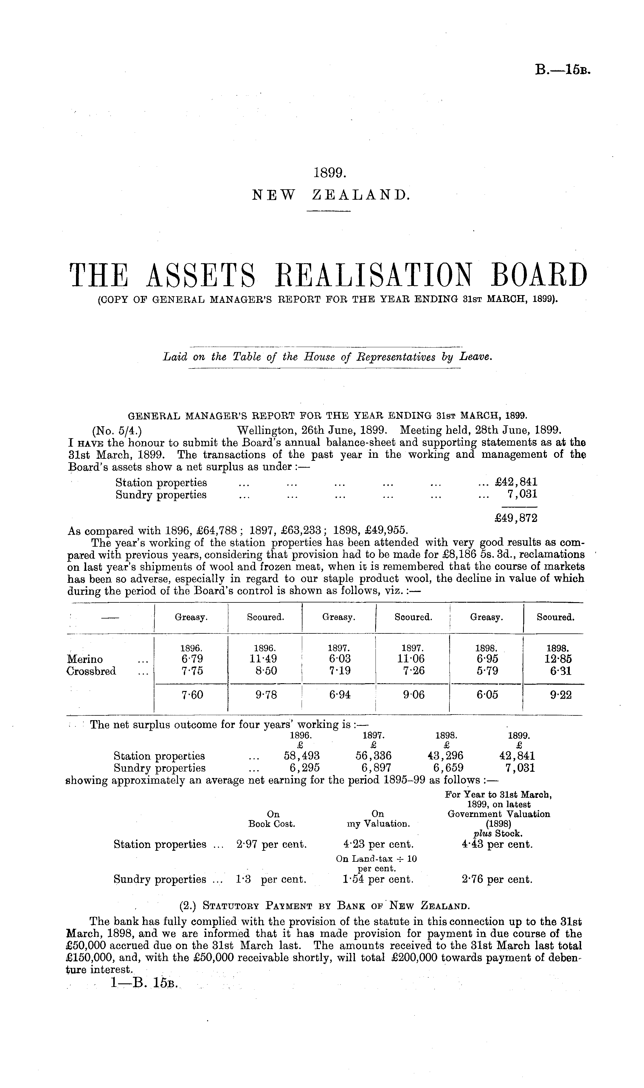GENERAL MANAGER'S REPORT FOR THE YEAR ENDING 31st MARCH, 1899. (No. 5/4.) Wellington, 26th June, 1899. Meeting held, 28th June, 1899. I have the honour to submit the Board's annual balance-sheet and supporting statements as at the 31st March, 1899. The transactions of the past year in the working and management of the Board's assets show a net surplus as under : — Station properties ... ... ... ... ... ... £42,841 Sundry properties ... ... ... ... ... ... 7,031 £49,872 As compared with 1896, £64,788 ; 1897, £63,233 ; 1898, £49,955. The year's working of the station properties has been attended with very good results as compared with previous years, considering that provision had to be made for £8,186 ss. 3d., reclamations on last year's shipments of wool and frozen meat, when it is remembered that the course of markets has been so adverse, especially in regard to our staple product wool, the decline in value of which during the period of the Board's control is shown as follows, viz.: —