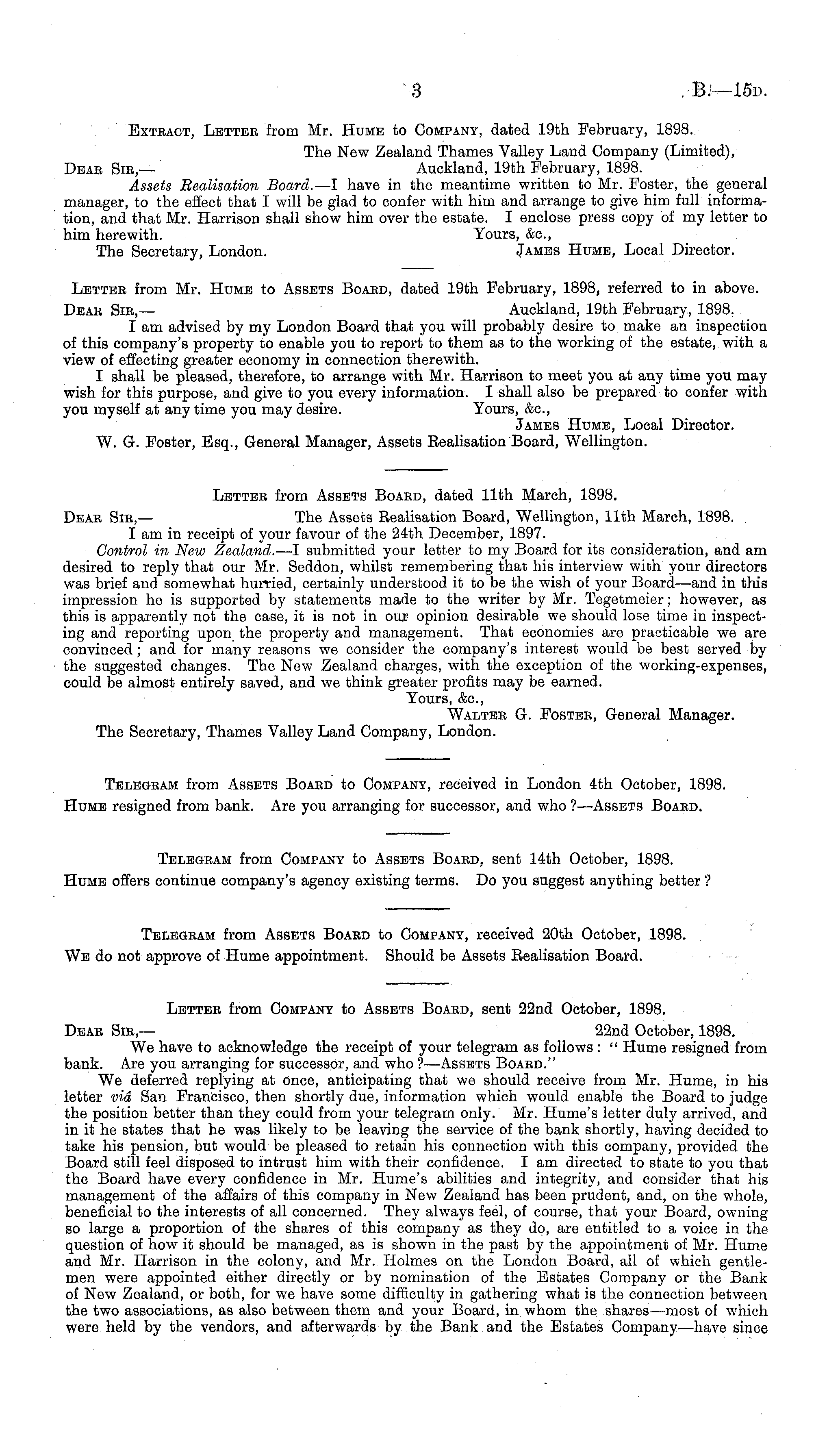 Letter from Mr. Hume to Assets Board, dated 19th February, 1898, referred to in above. Deae Sir,— Auckland, 19th February, 1898. I am advised by my London Board that you will probably desire to make an inspection of this company's property to enable you to report to them as to the working of the estate, with a view of effecting greater economy in connection therewith. I shall be pleased, therefore, to arrange with Mr. Harrison to meet you at any time you may wish for this purpose, and give to you every information. I shall also be prepared to confer with you myself at any time you may desire. Yours, &c, James Hume, Local Director. W. G. Foster, Esq., General Manager, Assets Bealisation Board, Wellington.
