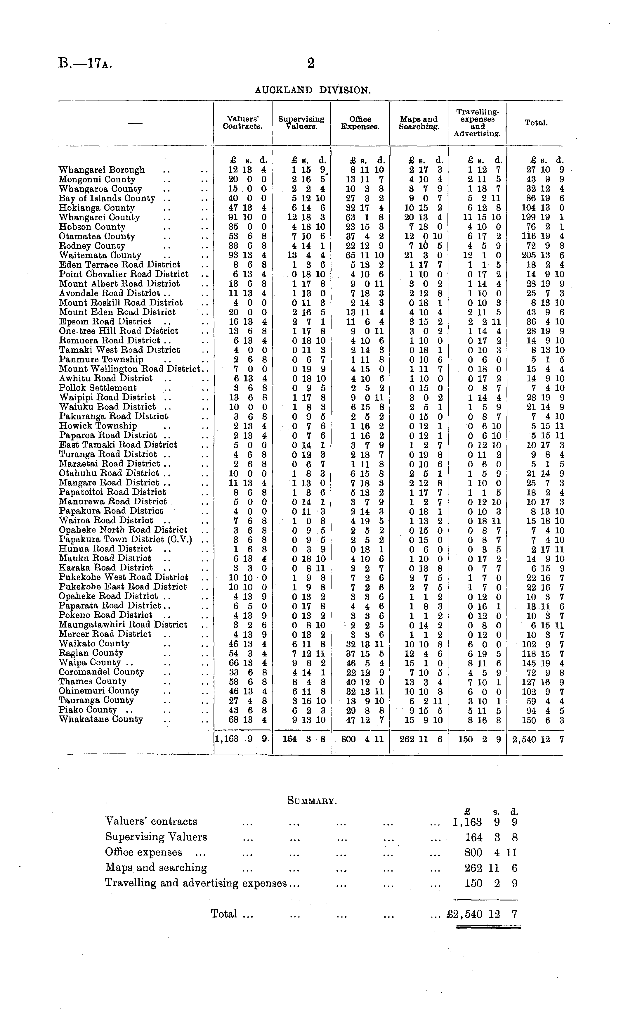 Valuers' Contracts. Supervising Valuers. Office Expenses. Maps and Searching. Travellingexpenses and Advertising. Total. Whangarei Borough Mongonui County Whangaroa County Bay of Islands County Hokianga County Whangarei County Hobson County Otamatea County Rodney County Waitemata County Eden Terrace Road District Point Chevalier Road District Mount Albert Road District Avondale Road Distriot Mount Roskill Road Distriot Mount Eden Road Distriot Epsom Road Distriot One-tree Hill Road District Remuera Road District Tamaki West Road District Panmure Township Mount Wellington Road District.. Awhitu Road District Pollok Settlement Waipipi Road District Waiuku Road District Pakuranga Road Distriot Howick Township Paparoa Road Distriot East Tamaki Road District Turanga Road District Maraetai Road District Otahuhu Road District Mangare Road Distriot .. Papatoitoi Road Distriot Manurewa Road Distriot Papakura Road District Wairoa Road District Opaheke North Road District Papakura Town District (C.V.) .. Hunua Road Distriot Mauku Road District Karaka Road Distriot Pukekohe West Road District Pukekohe East Road District Opaheke Road District Paparata Road Distriot Pokeno Road District Maungatawhiri Road District Mercer Road District Waikato County Raglan County Waipa County Coromandel County Thames County Ohinemuri County Tauranga County Piako County Whakatane County £ s. d. 12 13 4 20 0 0 15 0 0 40 0 0 47 13 4 91 10 0 35 0 0 53 6 8 33 6 8 93 13 4 8 6 8 6 13 4 13 6 8 11 13 4 4 0 0 20 0 0 16 13 4 13 6 8 6 13 4 4 0 0 2 6 8 7 0 0 6 13 4 3 6 8 13 6 8 10 0 0 3 6 8 2 13 4 2 13 4 5 0 0 4 6 8 2 6 8 10 0 0 11 18 4 8 6 8 5 0 0 4 0 0 7 6 8 3 6 8 3 6 8 16 8 6 13 4 3 3 0 10 10 0 10 10 0 4 13 9 6 5 0 4 13 9 3 2 6 4 13 9 46 13 4 54 3 4 66 13 4 33 6 8 58 6 8 46 13 4 27 4 8 43 6 8 68 13 4 £ a. d. 1 15 9 2 16 5' 2 2 4 5 12 10 6 14 6 12 18 3 4 18 10 7 10 6 4 14 1 13 4 4 13 6 0 18 10 1 17 8 1 13 0 0 11 3 2 16 5 2 7 1 1 17 8 0 18 10 0 11 3 0 6 7 0 19 9 0 18 10 0 9 5 1 17 8 18 3 0 9 5 0 7 6 0 7 6 0 14 1 0 12 3 0 6 7 18 3 1 13 0 13 6 0 14 1 0 11 3 10 8 0 9 5 0 9 5 0 3 9 0 18 10 0 8 11 19 8 19 8 0 13 2 0 17 8 0 13 2 0 8 10 0 13 2 6 11 8 7 12 11 9 8 2 4 14 1 8 4 8 6 11 8 3 16 10 6 2 3 9 13 10 £ s. d. 8 11 10 13 11 7 10 3 8 27 3 2 32 17 4 63 1 8 23 15 3 37 4 2 22 12 9 65 11 10 5 13 2 4 10 6 9 0 11 7 18 3 2 14 3 13 11 4 11 6 4 9 0 11 4 10 6 2 14 3 1 11 8 4 15 0 4 10 6 2 5 2 9 0 11 6 15 8 2 5 2 1 16 2 1 16 2 3 7 9 2 18 7 1 11 8 6 15 8 7 18 3 5 13 2 3 7 9 2 14 3 4 19 5 2 5 2 2 5 2 0 18 1 i 10 6 2 2 7 7 2 6 7 2 6 3 3 6 4 4 6 3 3 6 2 2 5 3 3 6 32 13 11 37 15 5 46 5 4 22 12 9 40 12 0 32 13 11 18 9 10 29 8 8 47 12 7 £ s. d. 2 17 3 4 10 4 3 7 9 9 0 7 10 15 2 20 13 4 7 18 0 12 0 10 7 l6 5 21 3 0 1 17 7 1 10 0 3 0 2 2 12 8 0 18 1 4 10 4 3 15 2 3 0 2 1 10 0 0 18 1 0 10 6 1 11 7 1 10 0 0 15 0 3 0 2 2 5 1 0 15 0 0 12 1 0 12 1 12 7 0 19 8 0 10 6 2 5 1 2 12 8 1 17 7 12 7 0 18 1 1 13 2 0 15 0 0 15 0 0 6 0 1 10 0 0 13 8 2 7 5 2 7 5 112 18 3 112 0 14 2 112 10TO 8 12 4 6 15 1 0 7 10 5 13 3 4 10 10 8 6 2 11 9 15 5 15 9 10 £ a. d. 1 12 7 2 11 5 1 18 7 5 2 11 6 12 8 11 15 10 4 10 0 6 17 2 4 5 9 12 1 0 115 0 17 2 1 14 4 1 10 0 0 10 3 2 11 5 2 2 11 1 14 4 0 17 2 0 10 3 0 6 0 0 18 0 0 17 2 0 8 7 1 14 4 15 9 0 8 7 0 6 10 0 6 10 0 12 10 0 11 2 0 6 0 15 9 1 10 0 115 0 12 10 0 10 3 0 18 11 0 8 7 0 8 7 0 3 5 0 17 2 0 7 7 17 0 17 0 0 12 0 0 16 1 0 12 0 0 8 0 0 12 0 6 0 0 6 19 5 8 11 6 4 5 9 7 10 1 6 0 0 3 10 1 5 11 5 8 16 8 £ s. d. 27 10 9 43 9 9 32 12 4 86 19 6 104 13 0 199 19 1 76 2 1 116 19 4 72 9 8 205 13 6 18 2 4 14 9 10 28 19 9 25 7 3 8 13 10 43 9 6 36 4 10 28 19 9 14 9 10 8 13 10 5 15 15 4 4 14 9 10 7 4 10 28 19 9 21 14 9 7 4 10 5 15 11 5 15 11 10 17 3 9 8 4 5 1 5 21 14 9 25 7 3 18 2 4 10 17 3 8 13 10 15 18 10 7 4 10 7 4 10 2 17 11 14 9 10 6 15 9 22 16 7 22 16 7 10 3 7 13 11 6 10 3 7 6 15 11 10 3 7 102 9 7 118 15 7 145 19 4 72 9 8 127 16 9 102 9 7 59 4 4 94 4 5 150 6 3 150 2 9 2,540 12 7 1,163 9 9 164 3 8 800 i 11 262 11 6