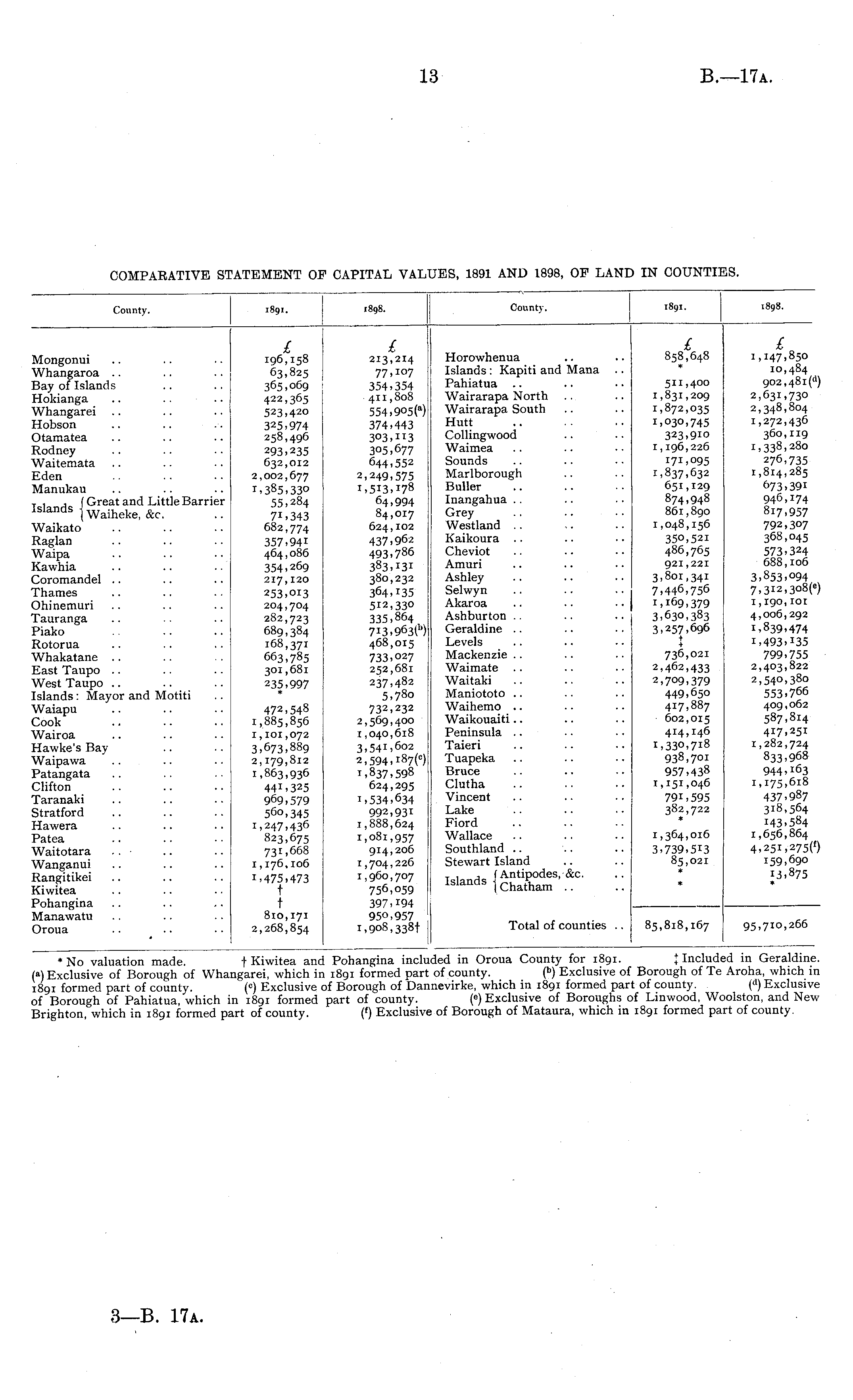 County. 1891. 1898. County. 1891. 1898. Mongonui Whangaroa Bay of Islands Hokianga Whangarei Hobson Otamatea Rodney Waitemata Eden Manukau T1 , (Great and Little Barrier Islands j Waiheke&c Waikato Raglan Waipa Kawhia Coromandel Thames Ohinemuri Tauranga Piako Rotorua Whakatane East Taupo West Taupo Islands: Mayor and Motiti Waiapu Cook Wairoa Hawke's Bay Waipawa Patangata Clifton Taranaki Stratford £ 196,158 63,825 365,069 422,365 523,42° 325,974 258,496 293,235 632,012 2,002,677 1,385,330 55,284 7 1 .343 682,774 357,941 464,086 354,269 217,120 253, OI 3 204,704 282,723 689,384 168,371 663,785 301,681 235,997 £ 213,214 77,107 354,354 411,808 554,905( a ) 374,443 3°3, "3 305,677 644,552 2,249,575 1,513, r 7 8 64,994 84,017 624,102 437,962 493,786 3 8 3, x 3i 380,232 364, 135 512,330 335,864 7 I 3,963( b ) 468,015 733,027 252,681 237,482 5,780 732,232 2,569,400 1,040,618 3,541,602 2,594,187(0) 1,837,598 624,295 1,534,634 992,931 1,888,624 1,081,957 914,206 1,704,226 1,960,707 756,059 397,194 950,957 : 1,908,338+ Horowhenua Islands : Kapiti and Mana .. Pahiatua Wairarapa North Wairarapa South Hutt Collingwood Waimea Sounds Marlborough Buller Inangahua Grey Westland Kaikoura Cheviot Amuri Ashley Selwyn Akaroa Ashburton Geraldine Levels Mackenzie Waimate Waitaki Maniototo Waihemo Waikouaiti Peninsula Taieri Tuapeka Bruce Clutha Vincent Lake Fiord Wallace Southland Stewart Island Islands (Antipodes, &c. Islands | chatham __ £ 858,648 511,400 1,831,209 1,872,035 1,030,745 323,910 1,196,226 171,095 1,837,632 651,129 874,948 861,890 1,048,156 350,521 486,765 921,221 3,801,341 7,446,756 1,169,379 3,630,383 3,257,696 + + 736,021 2,462,433 2,709,379 449,650 417,887 602,015 414,146 1,330,718 938,701 957,438 1,151,046 791,595 382,722 * £ 1,147,850 10,484 902,481 ( d ) 2,631,730 2,348,804 1,272,436 360,119 1,338,280 276,735 1,814,285 673,391 946,174 817,957 792,307 368,045 573,324 688,106 3,853,094 7,312,308(0) 1,190,IOI 4,006,292 1,839,474 1,493,135 799,755 2,403,822 2,540,380 553,7 66 409, 062 587,814 4 I 7,25i 1,282,724 833,968 944- l6 3 1,175,618 437,987 318,564 143,584 1,656,864 4,25i,275(') 159,690 13,875 472,548 1,885,856 1,101,072 3,673,889 2,179,812 1,863,936 44 I >325 969,579 560,345 1,247,436 823,675 731,668 1,176,106 1,475,473 t t 810,171 2,268,854 Hawera Patea Waitotara Wanganui Rangitikei Kiwitea Pohangina Manawatu Oroua 1,364,016 3,739,513 85,021 * * Total of counties .. 95,710,266 85,818,167 * No valuation made. ( a ) Exclusive of Borough of What 1891 formed part of county, of Borough of Pahiatua, which i: Brighton, which in 1891 formed pa f Kiwitea am igarei, which ii ( c ) Exclusive n 1891 formed irt of county. Pohangina inch 1891 formed part if Borough of Dar part of county. (') Exclusivi ided in Oroua County for 1891. of county. ( b ) Exclusive o! inevirke, which in 1891 formed par ( e ) Exclusive of Boroughs 1 2 of Borough of Mataura, which in J Included in Geraldine. F Borough of Te Aroha, which in ■t of county. ( d ) Exclusive of Linwood, Woolston, and New 1891 formed part of county.