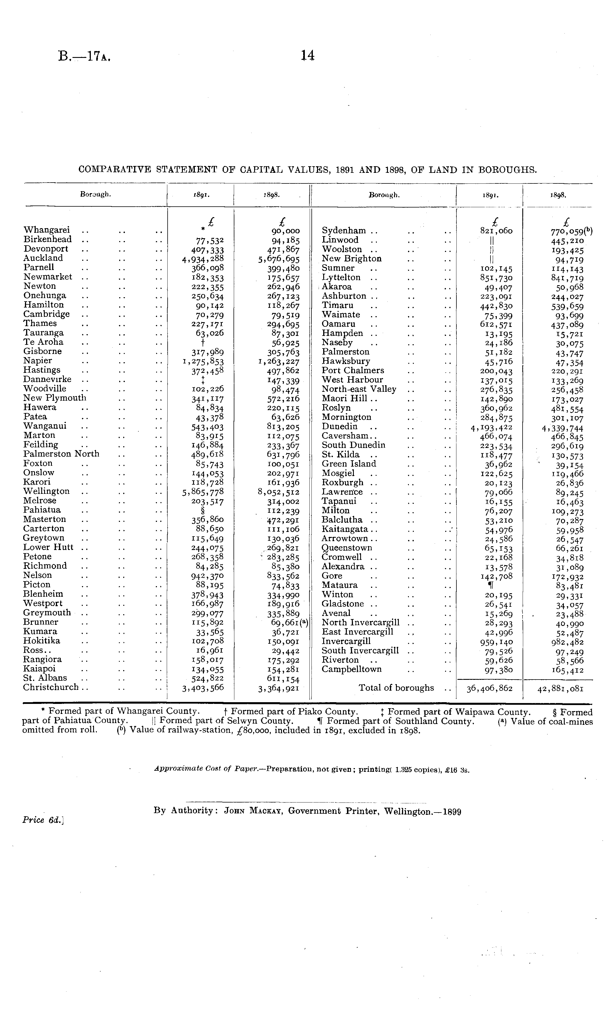 lorougl I91. toroiifi! 1891. Whangarei Birkenhead .. Devonport Auckland Parnell Newmarket .. Newton Onehunga Hamilton Cambridge Thames Tauranga Te Aroha Gisborne Napier Hastings Dannevirke Woodville New Plymouth Hawera Patea Wanganui Marton Feilding Palmerston North Foxton Onslow Karori Wellington Melrose Pahiatua Masterton Carterton Greytown Lower Hutt .. Petone Richmond Nelson Picton Blenheim Westport Greymouth Brunner Kumara Hokitika Ross Rangiora Kaiapoi St. Albans Christchurch .. £ * 77.532 407.333 4,934,288 366,098 !82,353 222,355 250,634 90,142 70,279 227,171 63,026 t 317.989 1,275.853 372,458 + + 102,226 341, "7 84,834 43.378 543.403 83.915 146,884 489,618 85,743 I 44,°53 118,728 5,865,778 203,517 § 356,860 88,650 115,649 244,075 268,358 84,285 942,370 88,195 378,943 166,987 299,077 115,892 33.565 102,708 16,961 158,017 134.055 524,822 3,403,566 £ 90,000 94,185 471,867 5,676,695 399,480 175.657 262,946 267,123 118,267 79.519 294.695 87,301 56,925 305.763 1,263,227 497,862 J 47>339 98,474 572,216 220,115 63,626 813,205 112,075 233.367 631,796 100,051 202,971 161,936 8,052,512 314,002 112,239 472,291 111,106 130.036 269,821 283,285 85,380 833.562 74.833 334.990 189,916 . 335,889 69,661 (a) 36,721 150,091 29,442 175,292 154,281 611,154 3,364,921 Sydenham Linwood Woolston .. New Brighton Sumner Lyttelton Akaroa Ashburton Timaru Waimate Oamaru Hampden Naseby Palmerston Hawksbury Port Chalmers West Harbour North-east Valley Maori Hill Roslyn Mornington Dunedin Caversham South Dunedin St. Kilda 1 Green Island Mosgiel Roxburgh Lawrence .. Tapanui Milton Balclutha Kaitangata Arrowtown Queenstown Cromwell Alexandra Gore \ Mataura j Winton Gladstone A venal North Invercargill .. East Invercargill Invercargill South Invercargill .. Riverton j Campbelltown £ 821,060 II II li 102,145 851,730 49,407 223,091 442,830 75.399 612,571 13.195 24,186 51,182 45,7*6 200,043 137.015 276,835 142,890 360,962 284,875 4,193,422 466,074 223,534 118,477 36,962 122,625 20,123 79, 066 16,155 76,207 53,2io 54,976 24,586 65,153 22,168 13,578 142,708 If 20,195 26,541 15,269 28,293 42,996 959,140 79,526 59,626 97,38o £ 77°.°59( b ) 445,210 193.425 94.719 "4.!43 841,719 50,968 244,027 539,659 93,699 437.o89 15,721 30,075 43,747 47.354 220,291 133,269 256,458 173,027 4 8 i.554 301,107 4.339,744 466,845 296,619 130,573 39,154 119,466 26,836 89,245 16,463 109,273 70,287 59,958 26,547 66,261 34.8i8 31,089 172,932 83,481 29,331 34,057 23,488 40,990 52,487 982,482 97,249 58,566 165,412 Total of boroughs 36,406,862 42,881,081 * Formed part of Whangarei County. f I iart of Pahiatua County. || Formed part of Si >mitted from roll. ( b ) Value of railway-station, 'ormed part of Pi; :lwyn County. £80,000, included iko County. J Formed part of 11 Formed part of Southland Coin 1891, excluded in 1898. Waipawa Count' mty. («) Vai y. § Formed iue of coal-mines