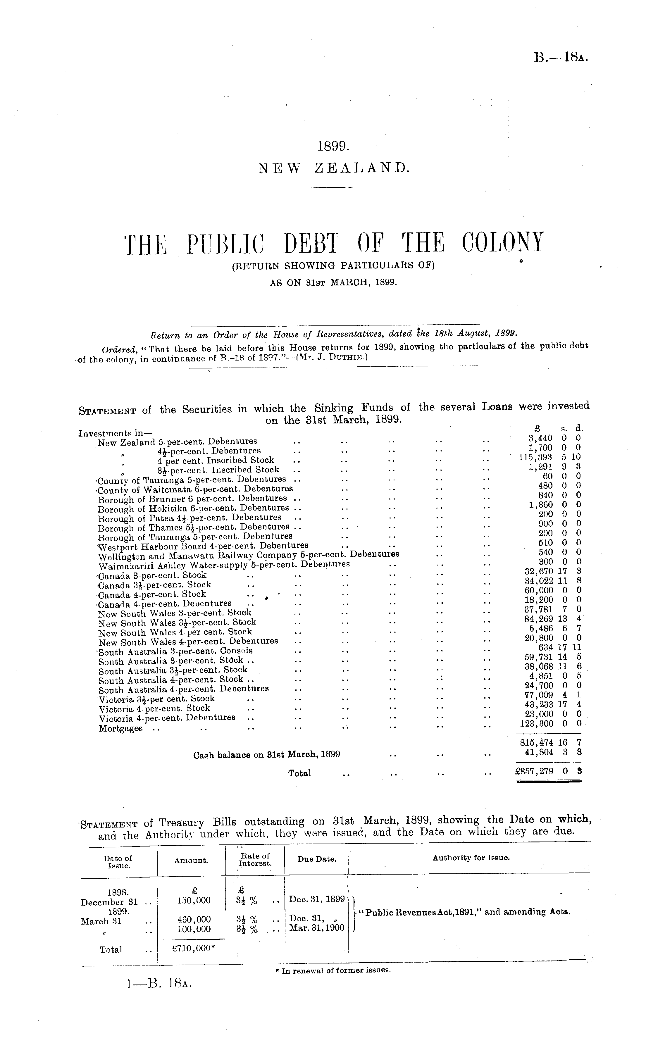 Return to an Order of the House of Representatives, dated the 18th August, 1899. Ordered "That there be laid before this House returns for 1899, showing the particulars of the public debt of the colony,'in continuance of 8.-18 of 1897."—(Mr. J. DUTHIE.)