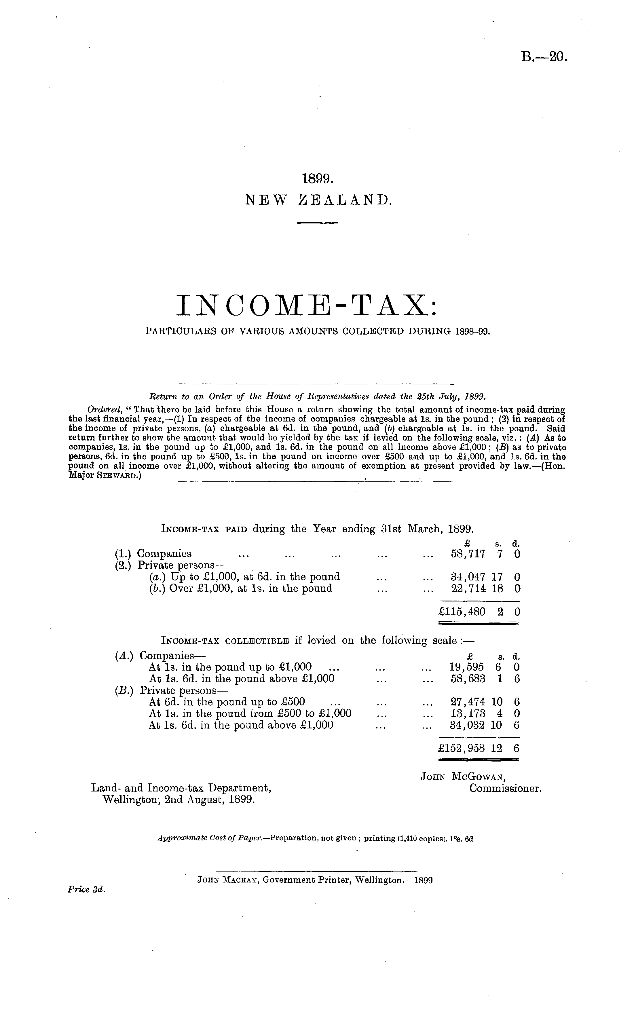 Income-tax paid during the Year ending 3.lst March, 1899. £ a. d. (1.) Companies ... ... ... ... ... 58,717 7 0 (2.) Private persons— (a.) Up to £1,000, at 6d. in the pound ... ... 34,047 17 0 (6.) Over £1,000, at Is. in the pound ... ... 22,714 18 0 £115,480 2 0 Income-tax collectible if levied on the following scale : — (A.) Companies— £ s. d. At Is. in the pound up to £1,000 ... ... ... 19,595 6 0 At Is. 6d. in the pound above £1,000 ... ... 58,683 1 6 (B.) Private persons — At 6d. in the pound up to £500 ... ... ... 27,474 10 6 At Is. in the pound from £500 to £1,000 ... ... 13,173 4 0 At Is. 6d. in the pound above £1,000 ... ... 34,032 10 6 £152,958 12 6 John McGowan, Land- and Income-tax Department, Commissioner. Wellington, 2nd August, 1899. Approximate Cost of Paper.— Preparation, not given ; printing (1,410 copies), 18s. 6d