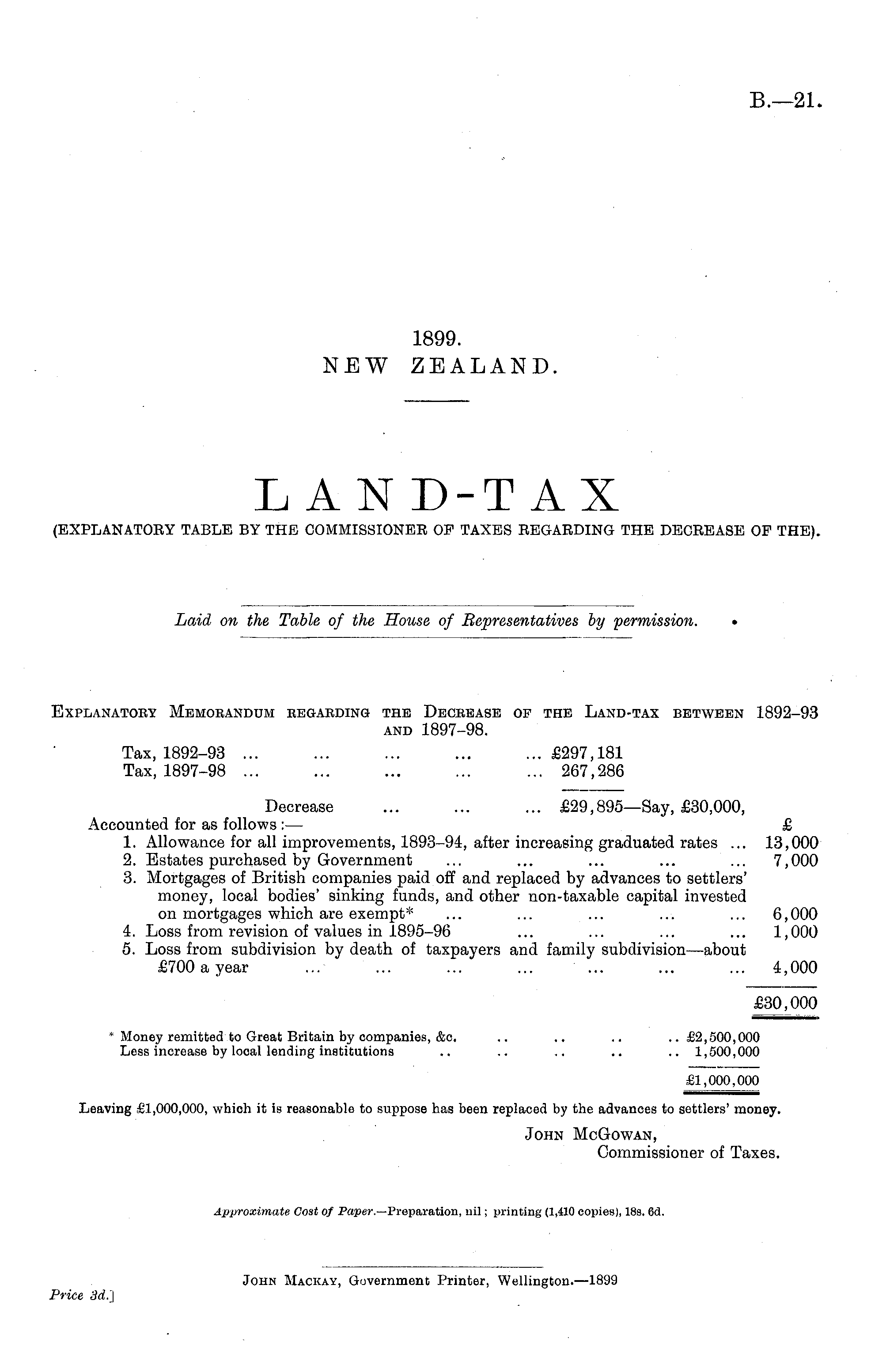 EXPLANATORY MEMORANDUM REGARDING THE DECREASE OF THE LAND-TAX BETWEEN 1892-93 AND 1897-98. Tax, 1892-93 £297,181 Tax, 1897-98 ... ... ... ... ... 267,286 Decrease ... ... ... £29,895—5 ay, £30,000, Accounted for as follows :— £ 1. Allowance for all improvements, 1893-94, after increasing graduated rates ... 13,000 2. Estates purchased by Government ... ... ... ... ... 7,000 3. Mortgages of British companies paid off and replaced by advances to settlers' money, local bodies' sinking funds, and other non-taxable capital invested on mortgages which are exempt* ... ... ... ... ... 6,000 4. Loss from revision of values in 1895-96 ... ... ... ... 1,000 5. Loss from subdivision by death of taxpayers and family subdivision—about £700 a year ... ' ... ... ... ... ... ... 4,000 £30,000 * Money remitted to Great Britain by companies, &c, .. .. .. ..£2,500,000 Less increase by local lending institutions .. .. .. .. .. 1,500,000 £1,000,000 Leaving £1,000,000, which it is reasonable to suppose has been replaced by the advances to settlers' money. John McGowan, Commissioner of Taxes. Approximate Cost of Paper.— Preparation, nil; printing (1,410 copies), 18s. 63.