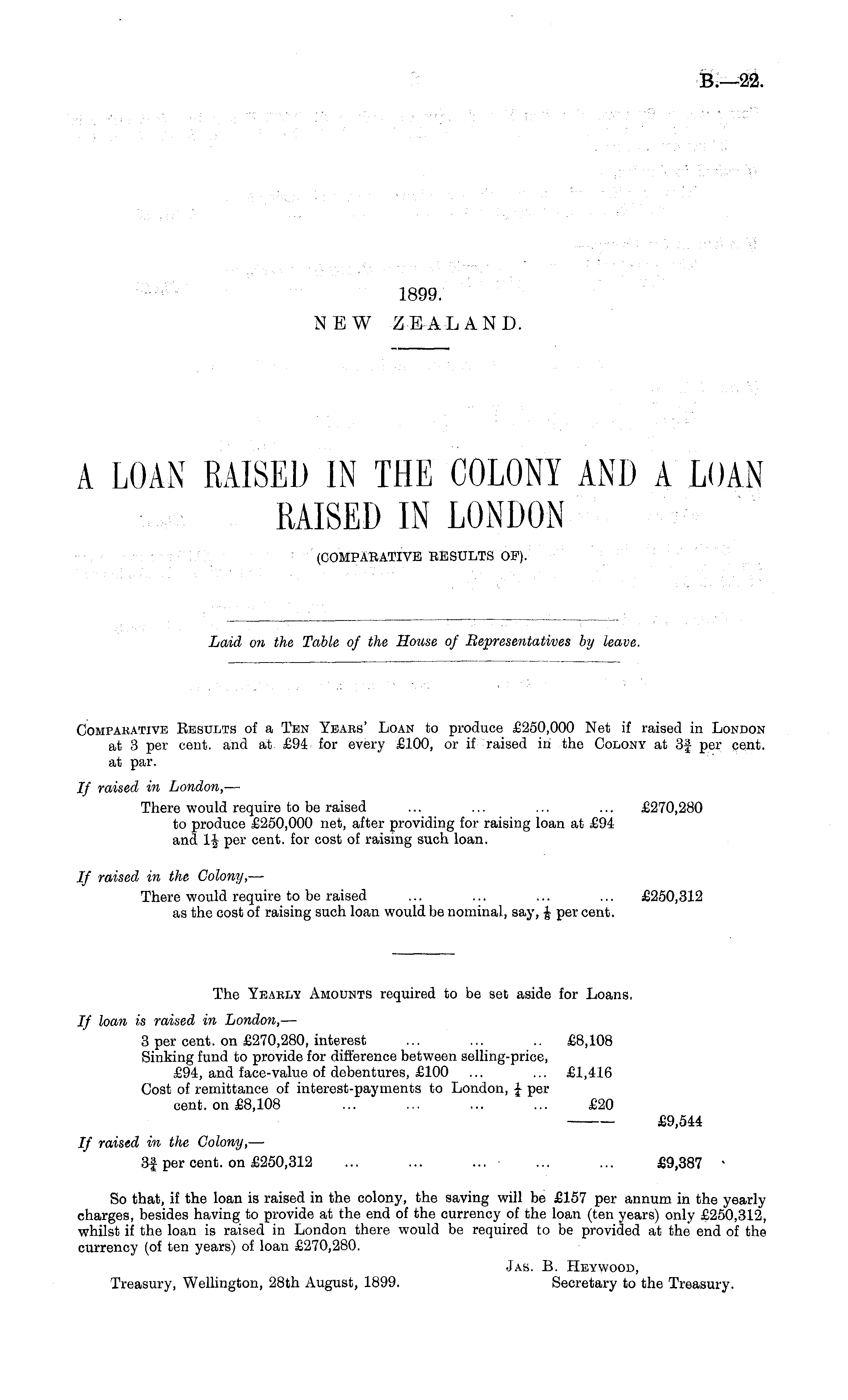 Comparative Besults of a Ten Years' Loan to produce £250,000 Net if raised in London at 3 per cent, and at £94 for every £100, or if raised in the Colony at 3f per cent, at par. If raised in London, — There would require to be raised ... ... ... ... £270,280 to produce £250,000 net, after providing for raising loan at £94 and 1J per cent, for cost of raising such loan. If raised in the Colony, — There would require to be raised ... ... ... ... £250,312 as the cost of raising such loan would be nominal, say, £ per cent.
