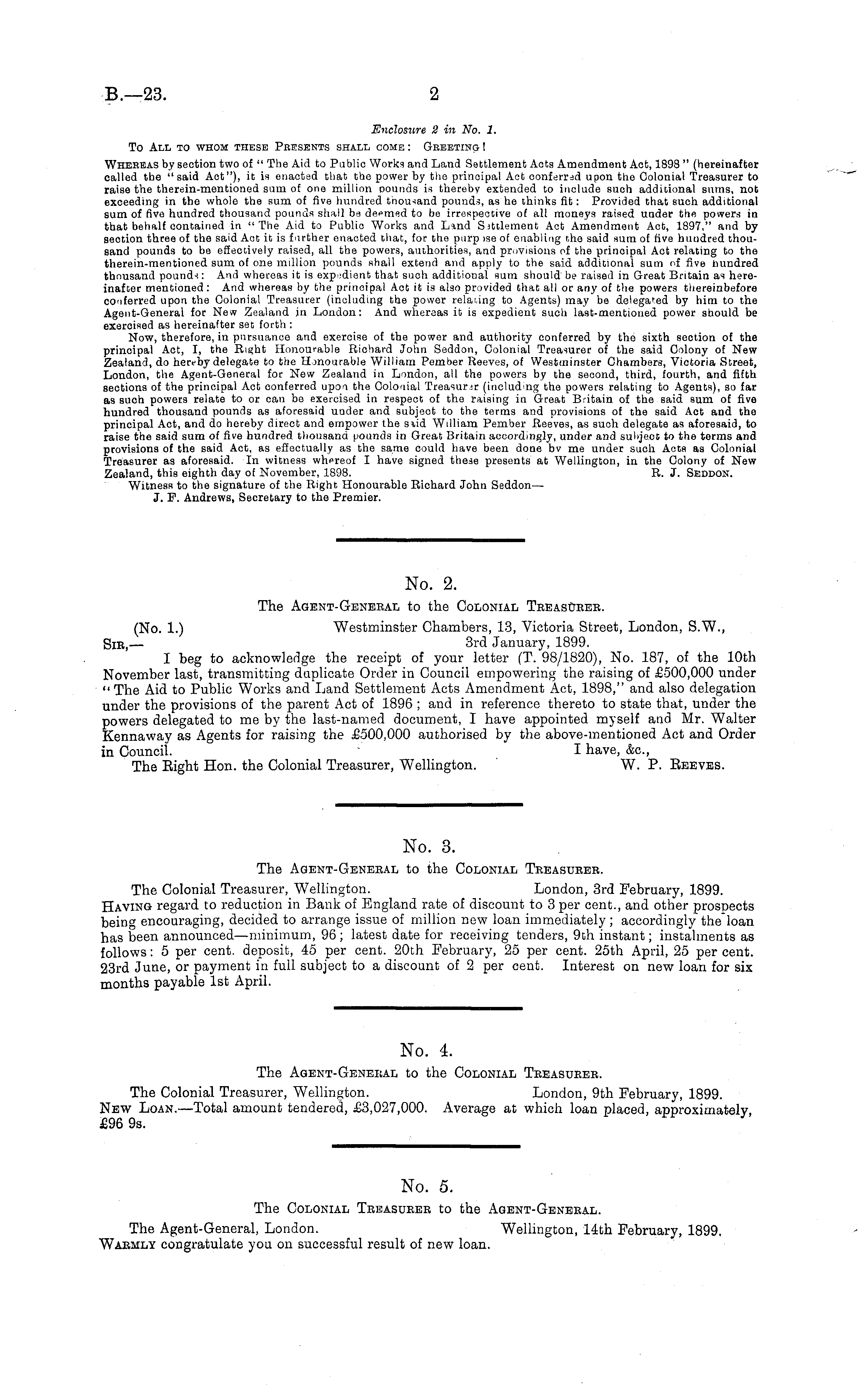 No. 2. The Agent-General to the Colonial Treasurer. (No. 1.) Westminster Chambers, 13, Victoria Street, London, S.W., Sib, — 3rd January, 1899. I beg to acknowledge the receipt of your letter (T. 98/1820), No. 187, of the 10th November last, transmitting duplicate Order in Council empowering the raising of £500,000 under "The Aid to Public Works and Land Settlement Acts Amendment Act, 1898," and also delegation under the provisions of the parent Act of 1896 ; and in reference thereto to state that, under the powers delegated to me by the last-named document, I have appointed myself and Mr. Walter Kennaway as Agents for raising the £500,000 authorised by the above-mentioned Act and Order in Council. I have, &c, The Right Hon. the Colonial Treasurer, Wellington. W. P. Reeves.