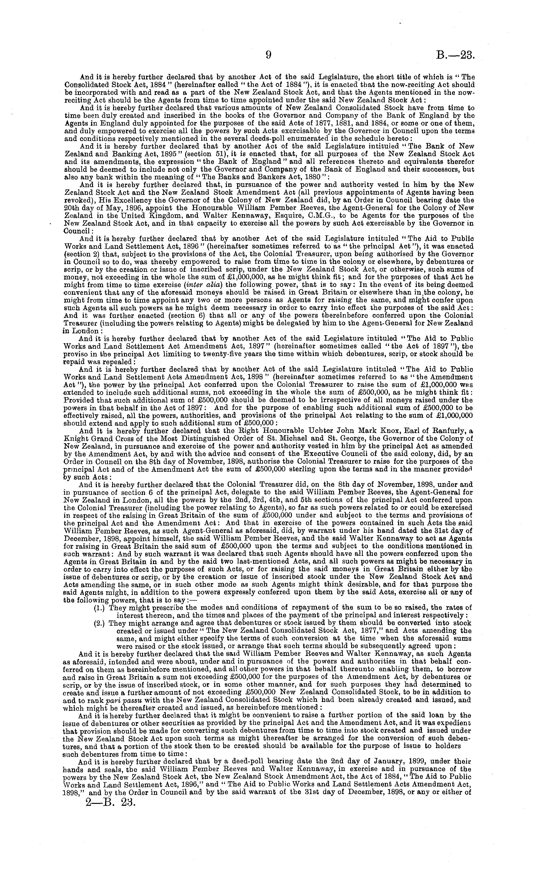 And it is hereby further declared that by another Act of the said Legislature, the short title of which is " The Consolidated Stock Act, 1884 " (hereinafter oalled " the Act of 1884"), it is enacted that the now-reciting Act should be incorporated with and read as a part of the New Zealand Stock Act, and that the Agents mentioned in the nowreciting Act should be the Agents from time to time appointed under the said New Zealand Stock Act: And it is hereby further declared that various amounts of New Zealand Consolidated Stock have from time to time been duly created and inscribed in the books of the Governor and Company of the Bank of England by the Agents in England duly appointed for the purposes of the said Acts of 1877, 1881, and 1884, or some or one of them, and duly empowered to exercise all the powers by such Acts exercisable by the Governor in Council upon the terms and conditions respectively mentioned in the several deeds-poll enumerated in the schedule hereto: And it is hereby further declared that by another Act of the said Legislature intituied " The Bank of New Zealand and Banking Act, 1895 " (section 51), it is enacted that, for all purposes of the New Zealand Stock Act and its amendments, the expression " the Bank of England " and all references thereto and equivalents therefor should be deemed to include not only the Governor and Company of the Bank of England and their successors, but also any bank within the meaning of " The Banks and Bankers Act, 1880 " : And it is hereby further declared that, in pursuance of the power and authority vested in him by the New Zealand Stock Act and the New Zealand Stock Amendment Act (all previous appointments of Agents having been revoked), His Excellency the Governor of the Colony of New Zealand did, by an Order in Council bearing date the 20th day of May, 1896, appoint the Honourable William Pember Reeves, the Agent-General for the Colony of New Zealand in the United Kingdom, and Walter Kennaway, Esquire, C.M.G., to be Agents for the purposes of the New Zealand Stock Act, and in that capacity to exercise all the powers by such Act exercisable by the Governor in Council: And it is hereby further declared that by another Act of the said Legislature intituled " The Aid to Public Works and Land Settlement Act, 1896 " (hereinafter sometimes referred to as " the principal Aot "), it was enacted (section 2) that, subject to the provisions of the Act, the Colonial Treasurer, upon being authorised by the Governor in Council so to do, was thereby empowered to raise from time to time in the colony or elsewhere, by debentures or scrip, or by the creation or issue of inscribed scrip, under the New Zealand Stock Act, or otherwise, such Bums of money, not exceeding in the whole the sum of £1,000,000, as he might think fit; and for the purposes of that Act he might from time to time exercise (inter alia) the following power, that is to say: In the event of its being deemed convenient that any of the aforesaid moneys should be raised in Great Britain or elsewhere than in the colony, he might from time to time appoint any two or more persons as Agents for raising the same, and might confer upon such Agents all such powers as he might deem necessary in order to carry into effect the purposes of the said Act: And it was further enacted (section 6) that all or any of the powers thereinbefore conferred upon the Colonial Treasurer (including the powers relating to Agents) might be delegated by him to the Agent-General for New Zealand in London: And it is hereby further declared that by another Act of the said Legislature intituled "The Aid to Public Works and Land Settlement Aot Amendment Act, 1897" (hereinafter sometimes called "the Aot of 1897"), the proviso in the principal Act limiting to twenty-five years the time within whioh debentures, scrip, or stock should be repaid was repealed: And it is hereby further declared that by another Act of the said Legislature intituled " The Aid to Public Works and Land Settlement Acts Amendment Act, 1898 " (hereinafter sometimes referred to as "the Amendment Aot "), the power by the principal Act conferred upon the Colonial Treasurer to raise the sum of £1,000,000 wbs extended to include such additional sums, not exceeding in the whole the sum of £500,000, as he might think fit: Provided that such additional sum of £500,000 should be deemed to be irrespective of all moneys raised under the powers in that behalf in the Aot of 1897: And for the purpose of enabling such additional sum of £500,000 to be effectively raised, all the powers, authorities, and provisions of the principal Act relating to the sum of £1,000,000 should extend and apply to suoh additional sum of £500,000 : And it is hereby further declared that the Right Honourable Uchter John Mark Knox, Earl of Ranfurly, a Knight Grand Cross of the Most Distinguished Order of St. Michael and St. George, the Governor of the Colony of New Zealand, in pursuance and exercise of the power and authority vested in him by the principal Aot as amended by the Amendment Act, by and with the advice and consent of the Executive Council of the said colony, did, by an Order in Council on the Bth day of November, 1898, authorise the Colonial Treasurer to raise for the purposes of the principal Act and of the Amendment Act the sum of £500,000 sterling upon the terms and in the manner provided by such Acts: And it is hereby further declared that the Colonial Treasurer did, on the Bth day of November, 1898, under and in pursuance of section 6 of the principal Act, delegate to the said William Pember Reeves, the Agent-General for New Zealand in London, all the powers by the 2nd, 3rd, 4th, and sth sections of the principal Act conferred upon the Colonial Treasurer (including the power relating to Agents), so far as such powers related to or could be exercised in respect of the raising in Great Britain of the sum of £500,000 under and subject to the terms and provisions of t